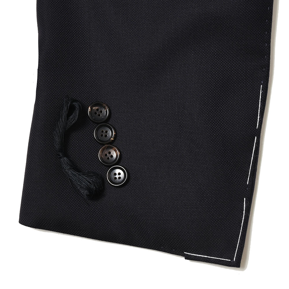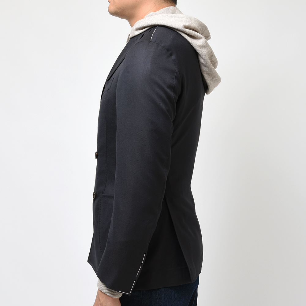 昨年新登場したモデル“EMILIO”はアンコン仕立ての軽快なモデルですが、こちらはその派生系モデルとなります。アンコンではなく心地を少し使用し、背抜きで裏地も付いています。また、こちらはココンチでは珍しいダブルブレストの4つボタン仕様。ファブリックは、目付け260gのヴァージンウールを使用した目の細かなホップサックで、起毛感を抑えた通年で使用できる素材感になります。ヴァージンウール特有の品がある光沢感は高級感ある佇まいです。