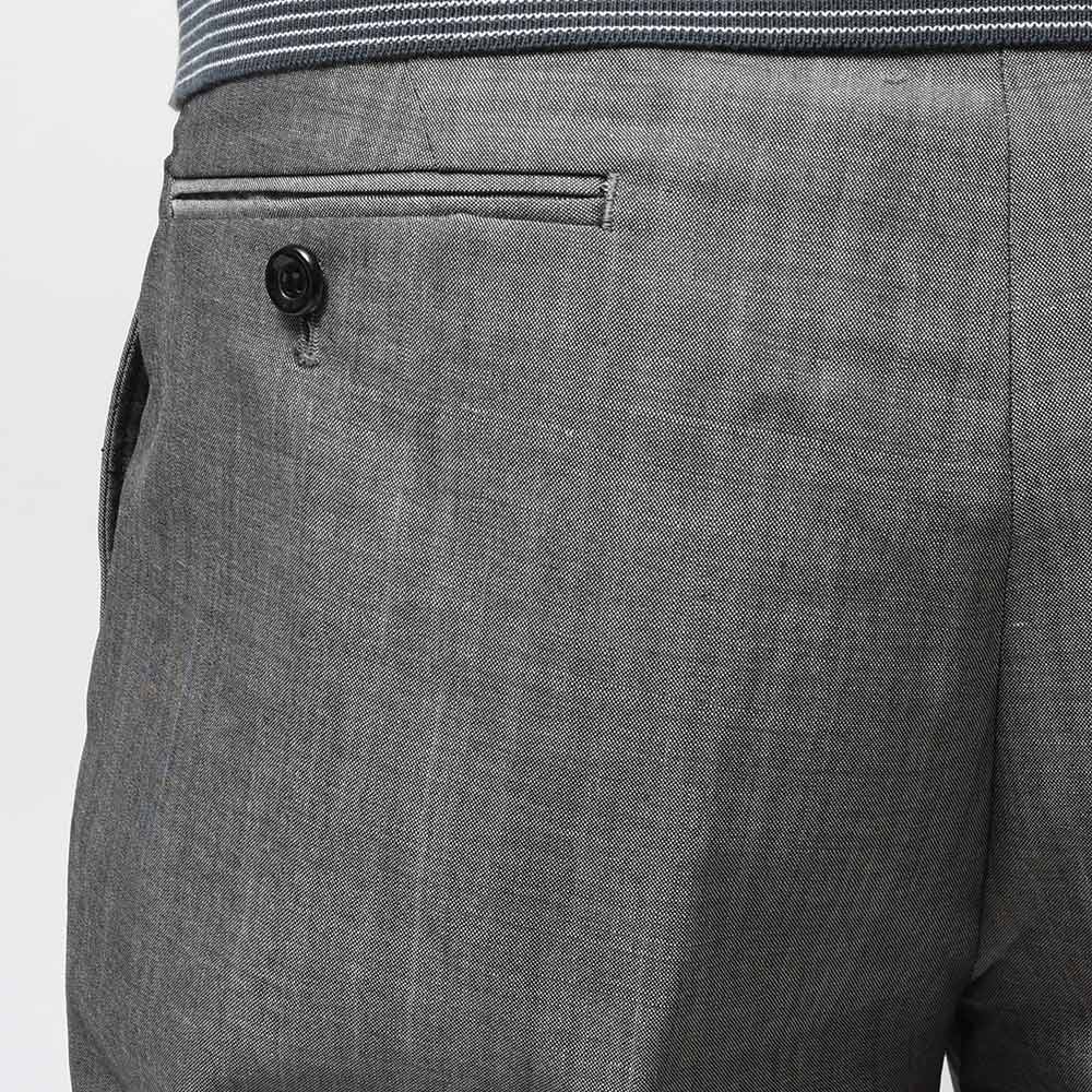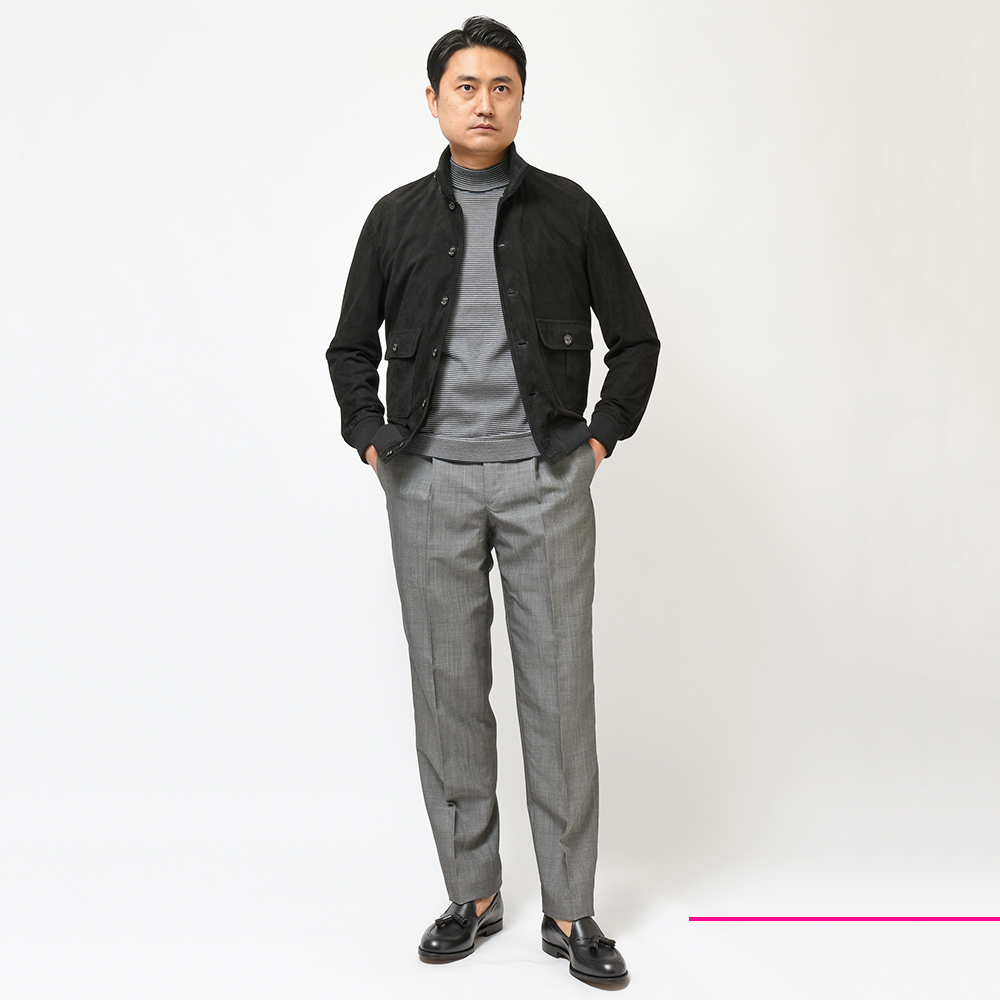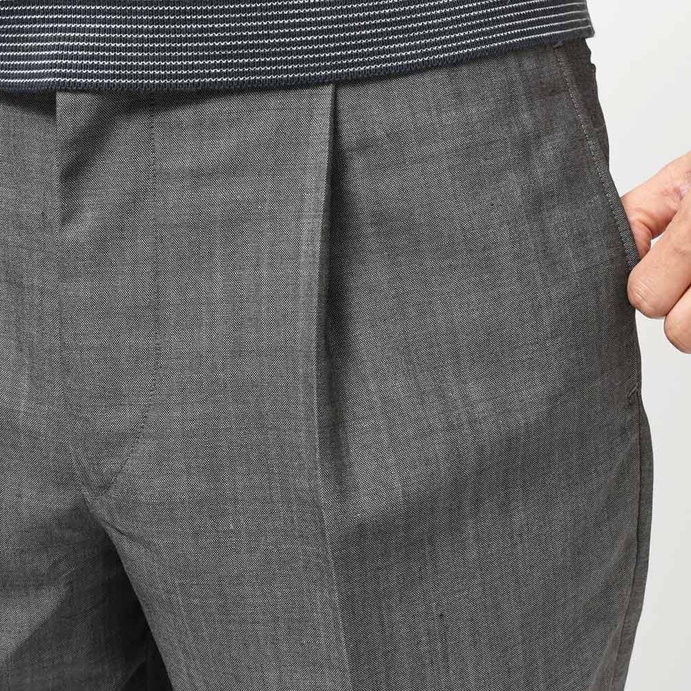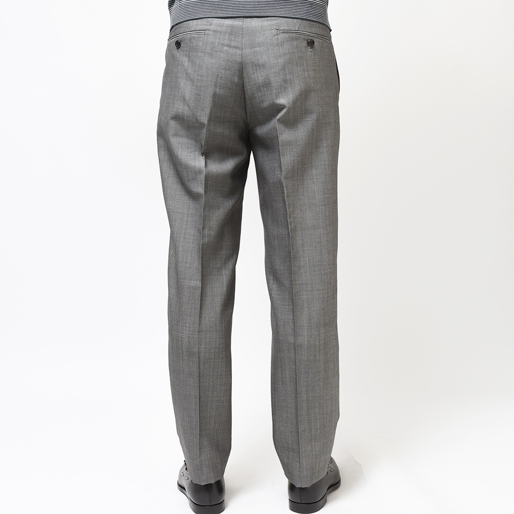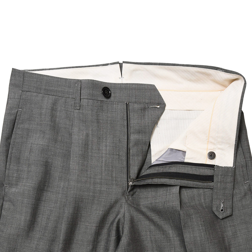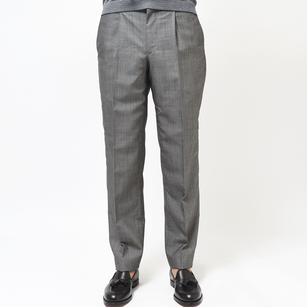 モヘヤ混のカリッとしたソリッドな生地と、やや深くとったプリーツで、しっかりとクリースが立つように作られており、よりシャープに見える。』
