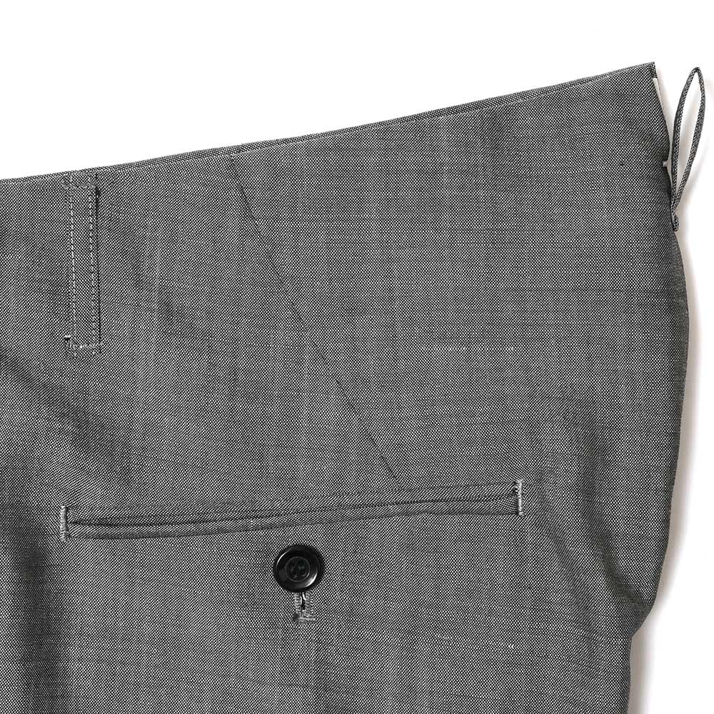 帯が無いスラックスは立体的に作るのが難しいとされていますが、la favolaのデザイナー平氏ならではのパターンとアイロンワークを駆使して作られた渾身の一本であり、モヘヤ混のシャリ感のある生地とやや深くとったプリーツによって、しっかりとクリースが立つように作られた端正なルックスも魅力の一つではないでしょうか。