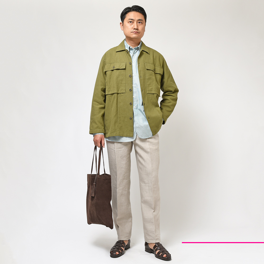 こちらは、大きめの胸ポケットが印象的なシャツブルゾン。筒袖仕様や腰ポケットをなくしたシンプルな仕立てによって、より軽やかでプライス面でもメリットが生まれた作りとなっています。カーディガンやブルゾンの代わりに、ハイ〜ミドルゲージニットの上にサラッと羽織れるシャツブルゾンは、一枚あれば非常に便利なアイテムになります。