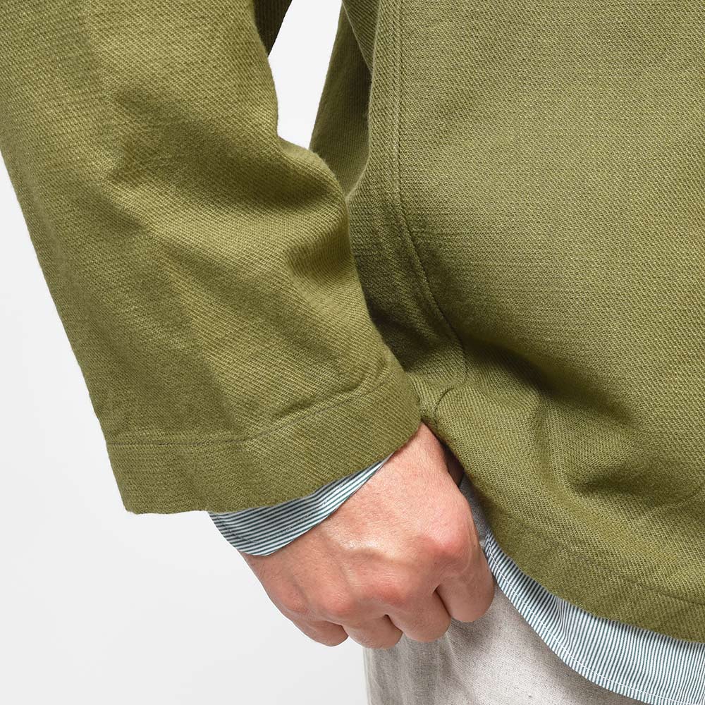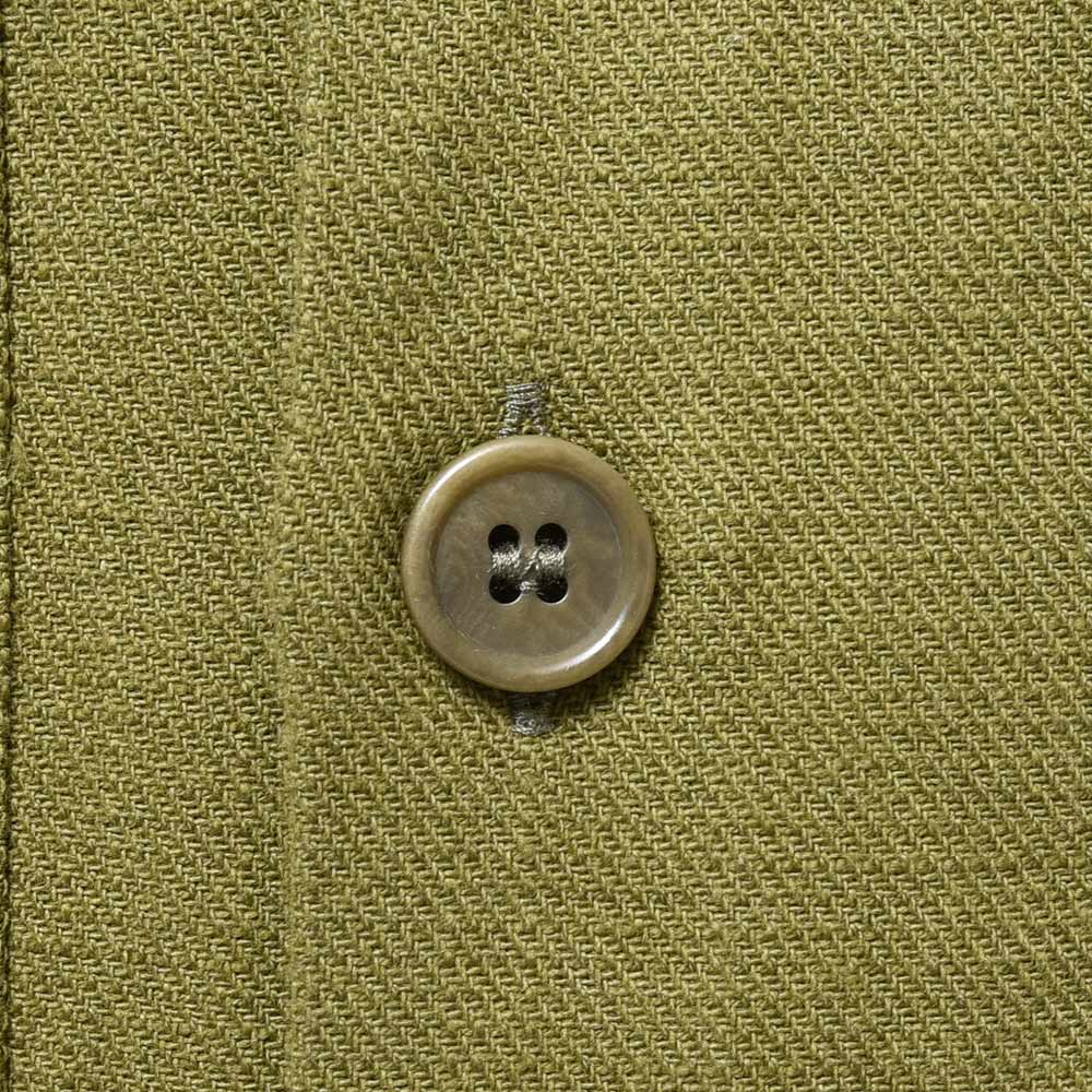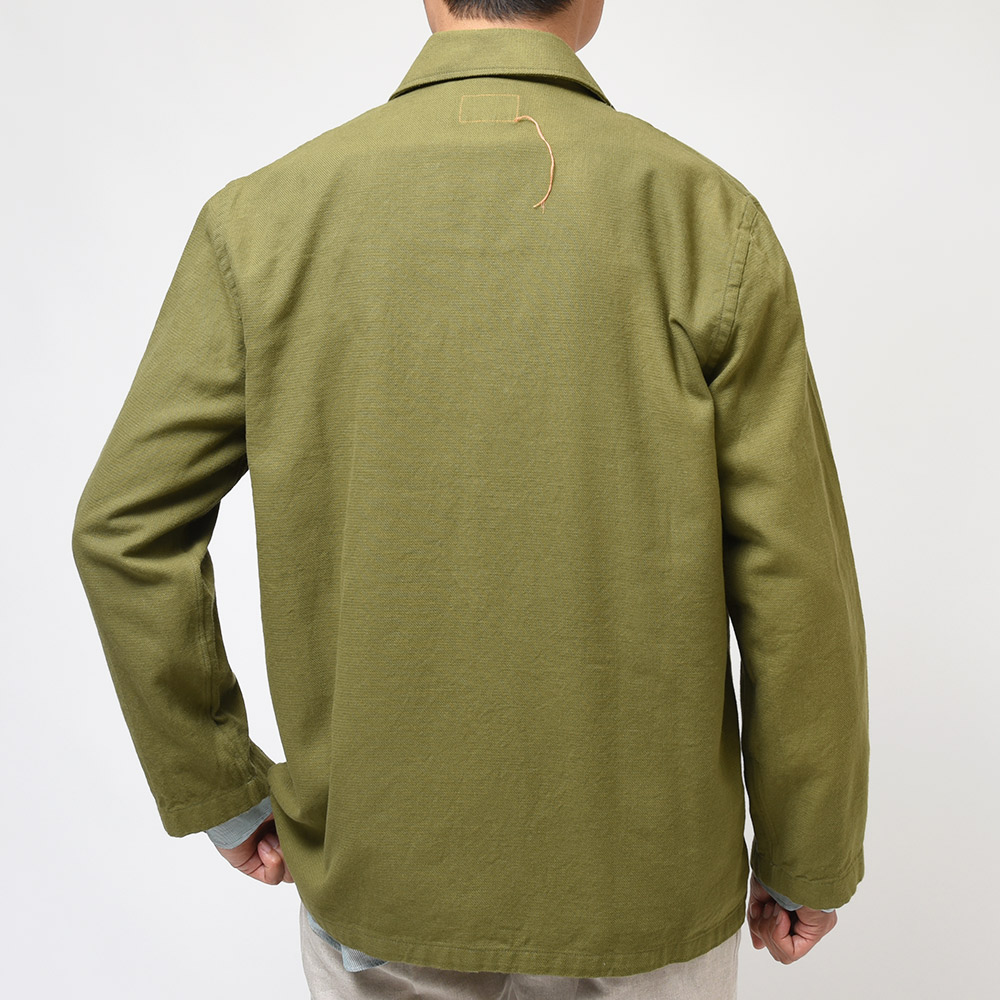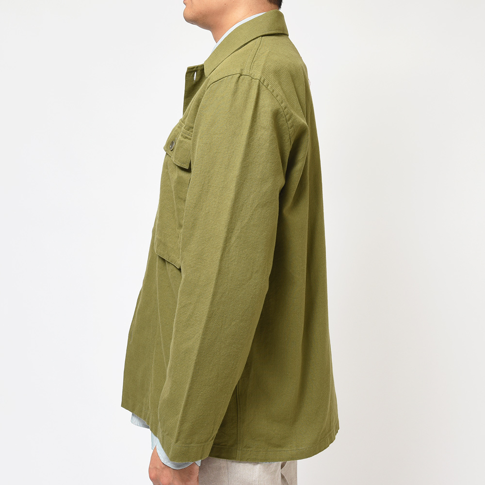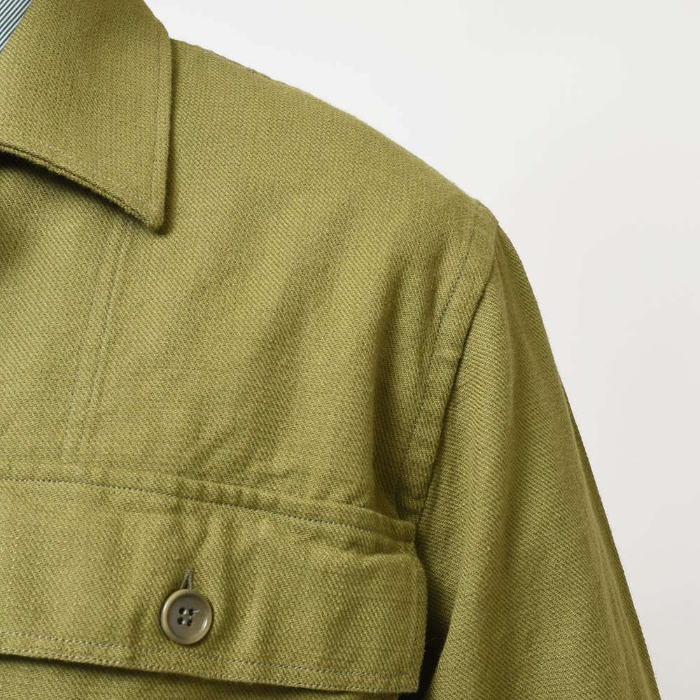 ミリタリーライクな雰囲気を醸し出すオリーブのコットンシャツブルゾン。