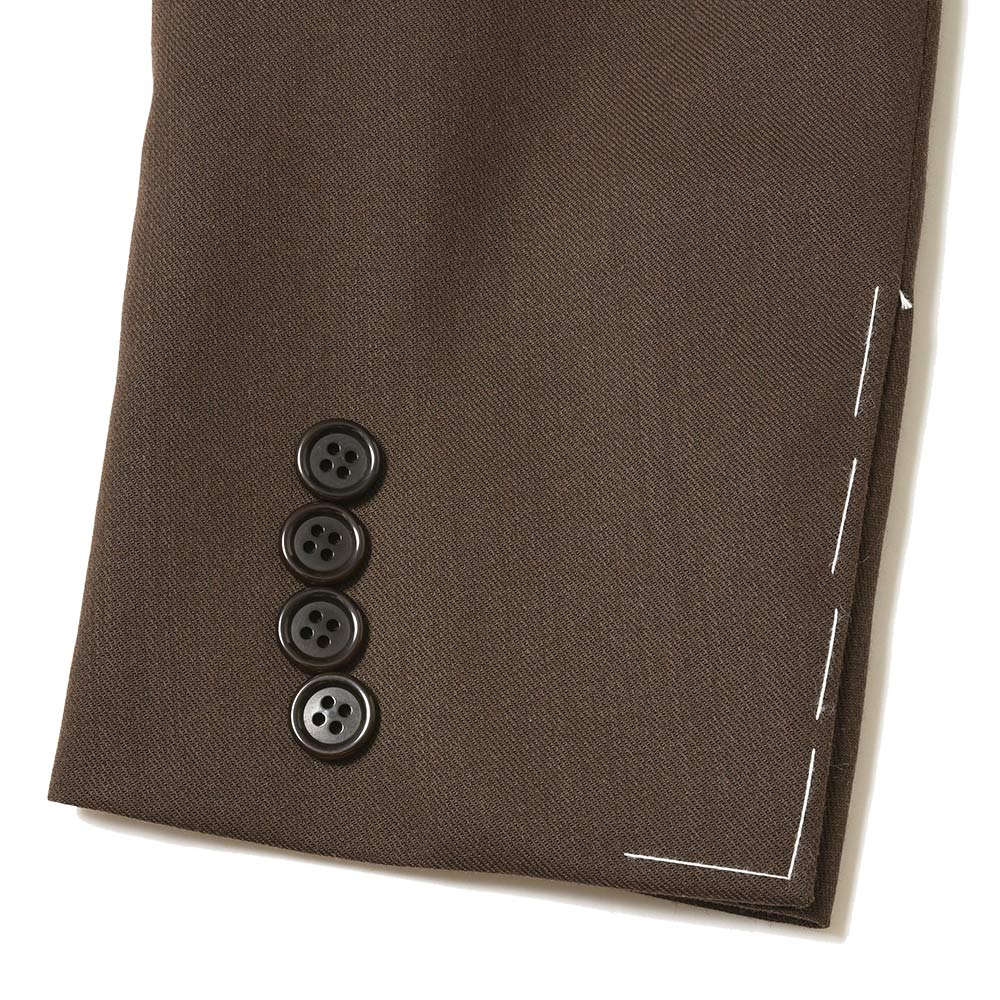 こちらは、イタリアで1836年創業された老舗生地メーカーMARZOTTO(マルゾット)社のウール×コットンのギャバジンを使用。強撚糸を使用することで程よくシャリ感を持ち、またウールの美しいドレープ感とコットンのしなやかさを併せ持った、カジュアルでもドレスでも幅広くスタイルできる汎用性です。深めに設定されたVゾーンがエレガントで、チェンジポケット仕様にすることでブリティッシュなアメリカンスタイルを体現しています。