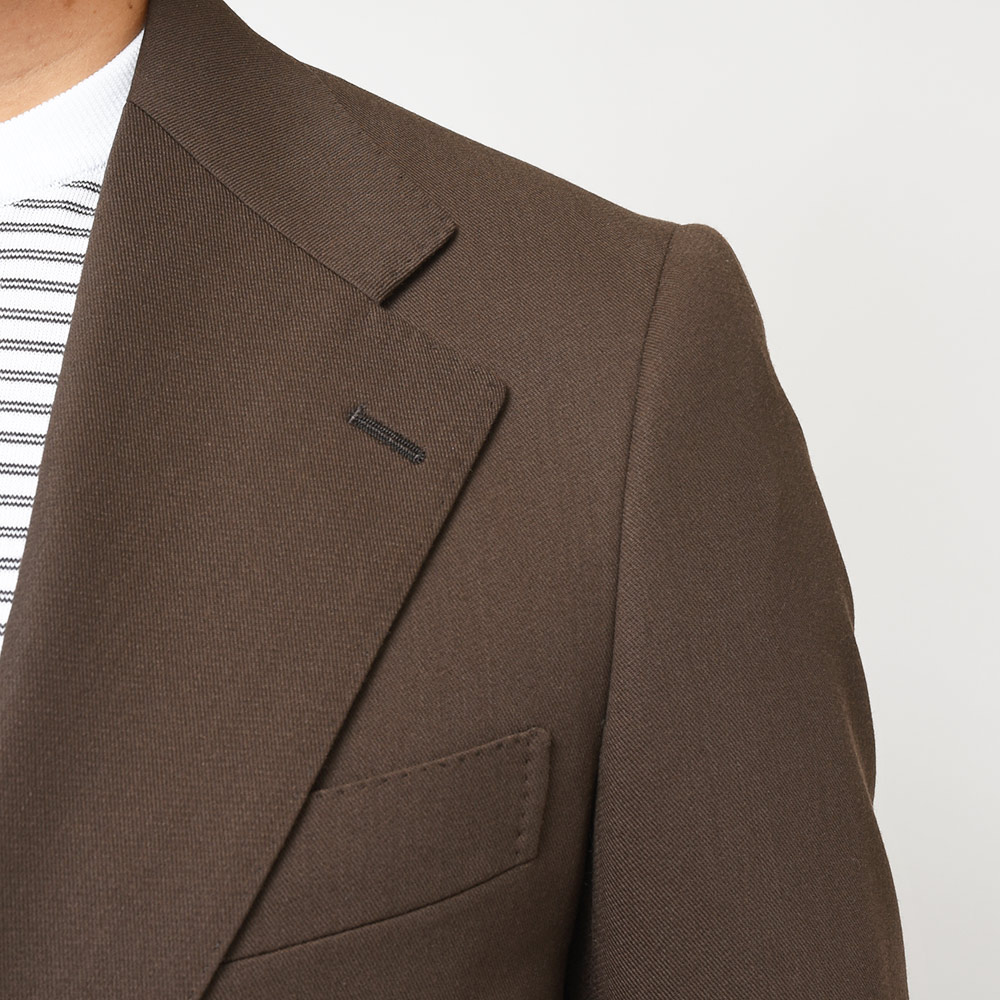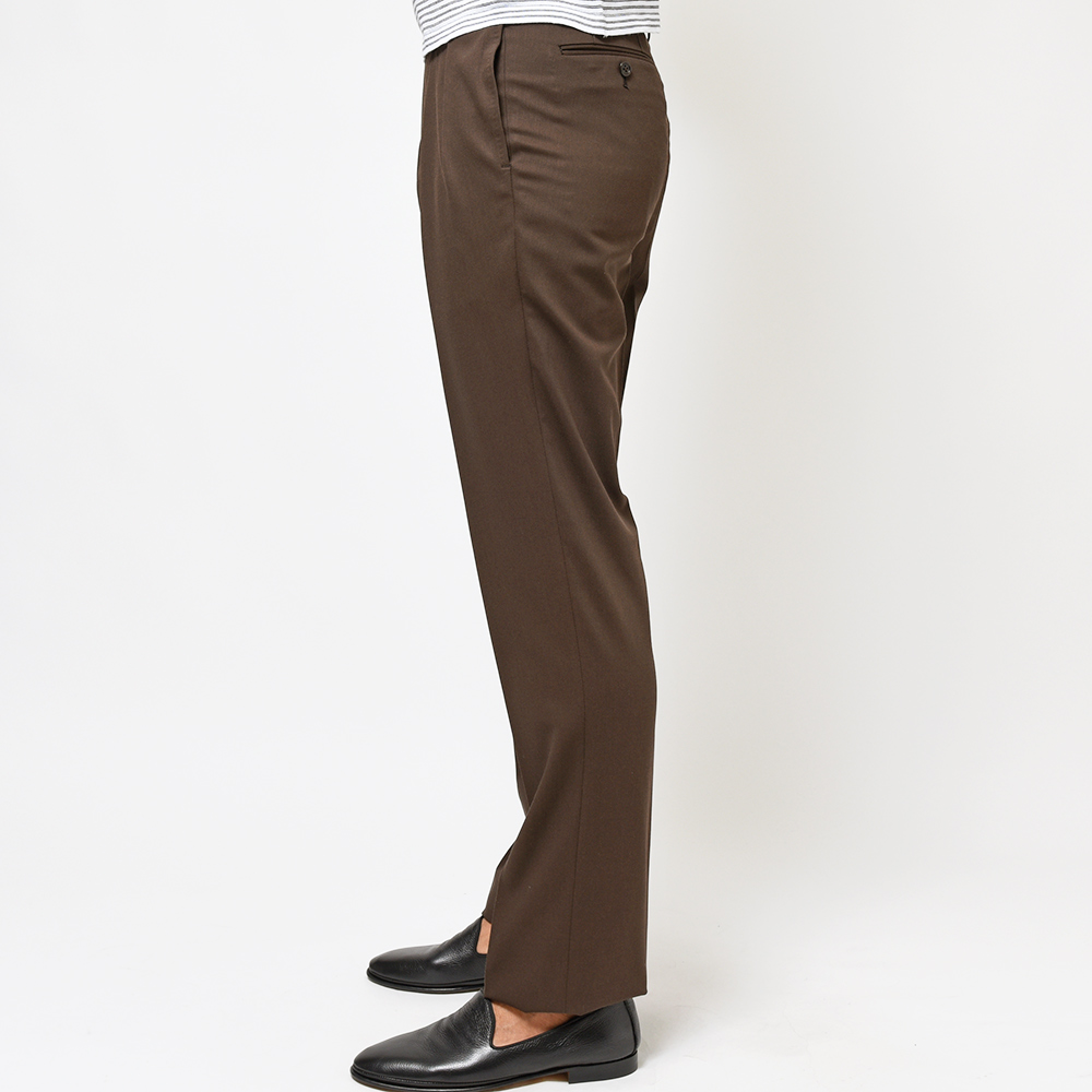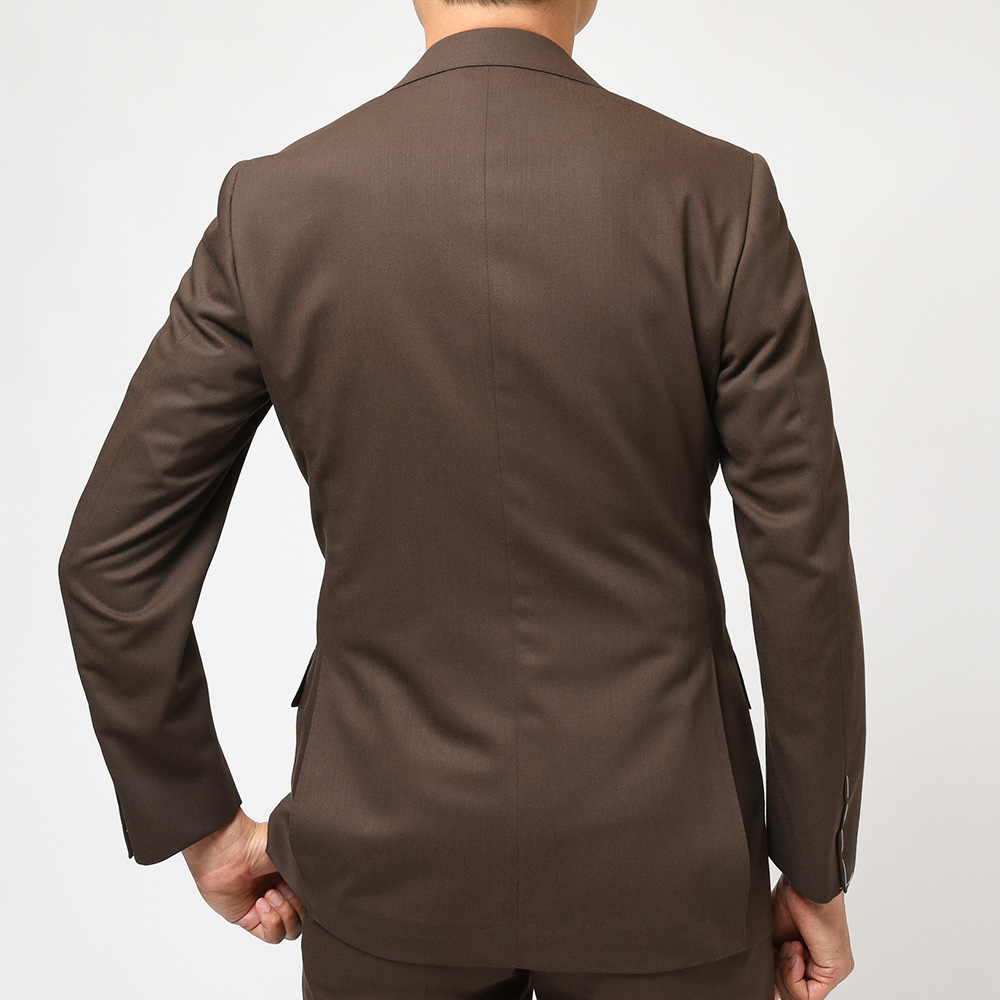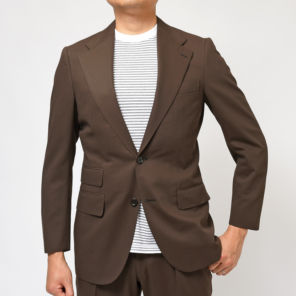 コロニアルなブラウンカラーが大人の魅力を醸し出す強撚糸で織られたイタリアのMARZOTTO社製のウールギャバジンは、美しいドレープ感もさることながら、タイドアップだけでなく、カジュアルなスタイリングも楽しめる一着となっています。