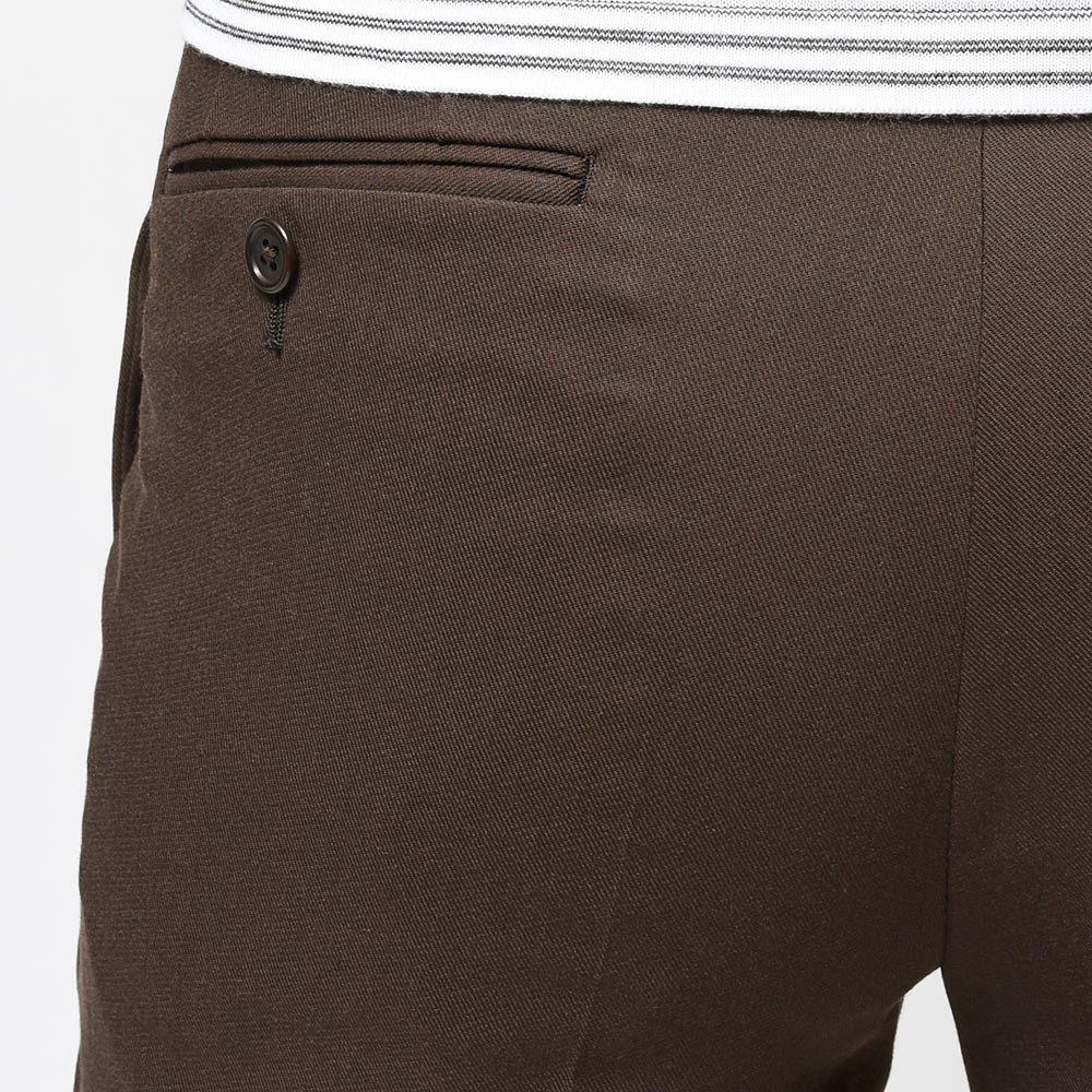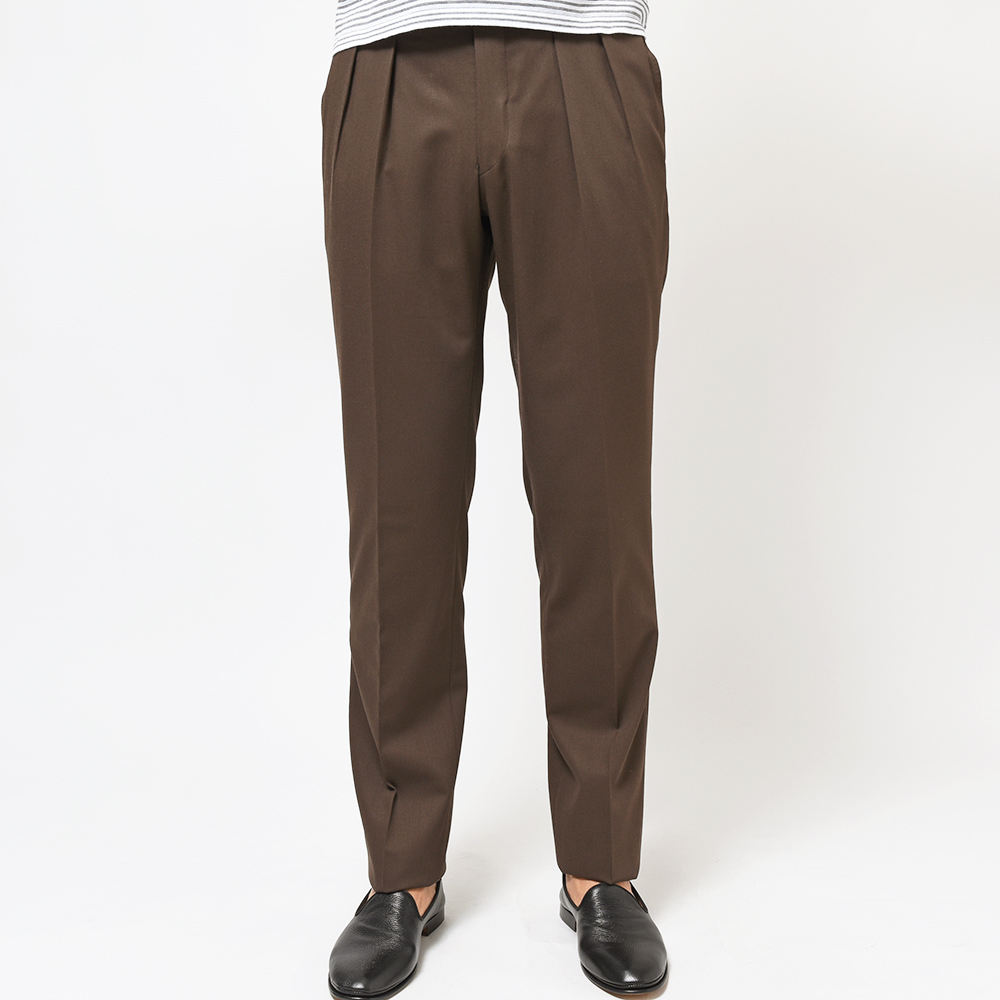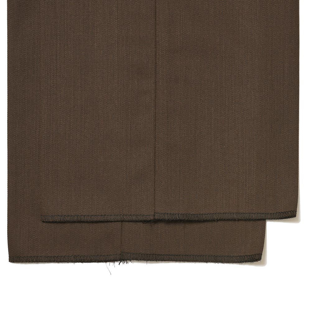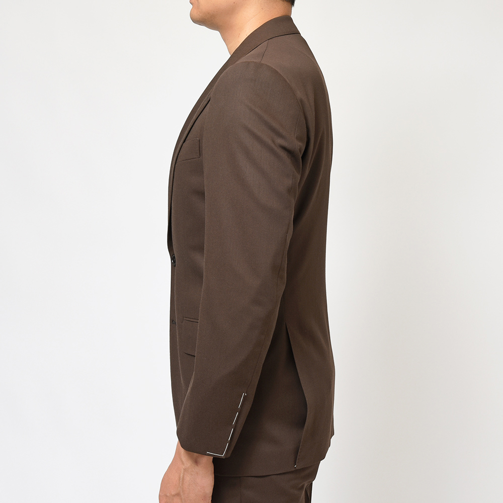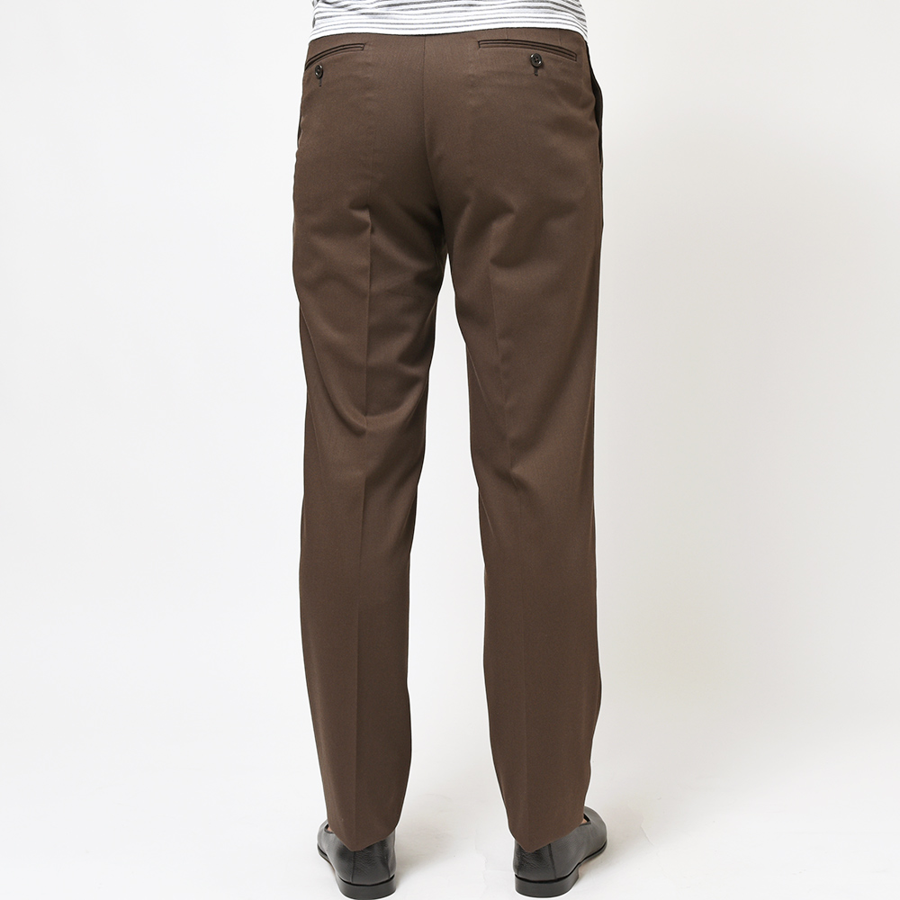 コロニアルなブラウンカラーが大人の魅力を醸し出す強撚糸で織られたイタリアのMARZOTTO社製のウールギャバジンは、美しいドレープ感もさることながら、タイドアップだけでなく、カジュアルなスタイリングも楽しめる一着となっています。