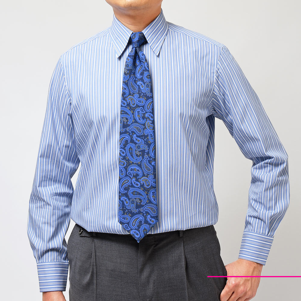 こういったストライプを持っていると、Vゾーンに彩りを与えられますし、何よりも楽しくなる。そんなシャツではないでしょうか。