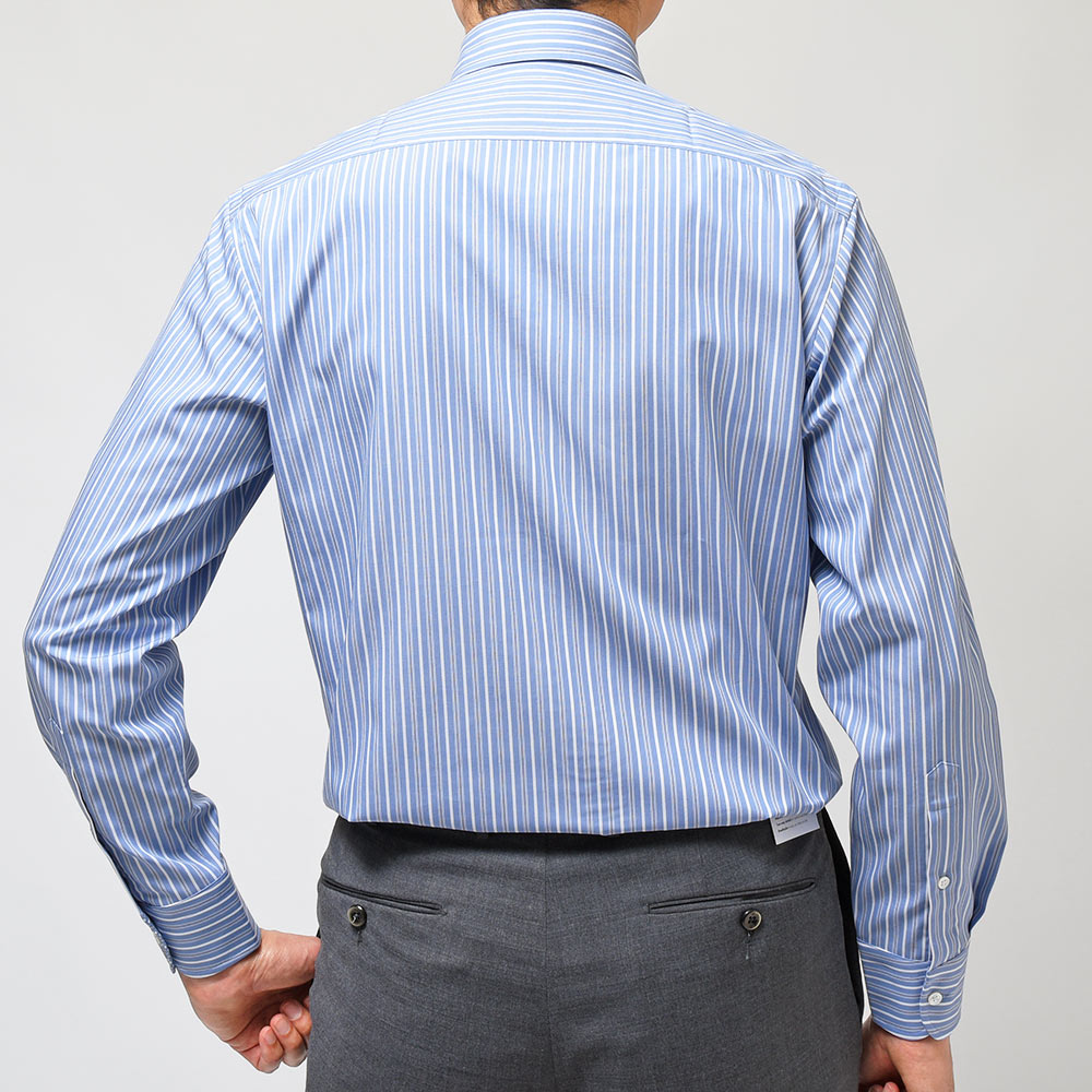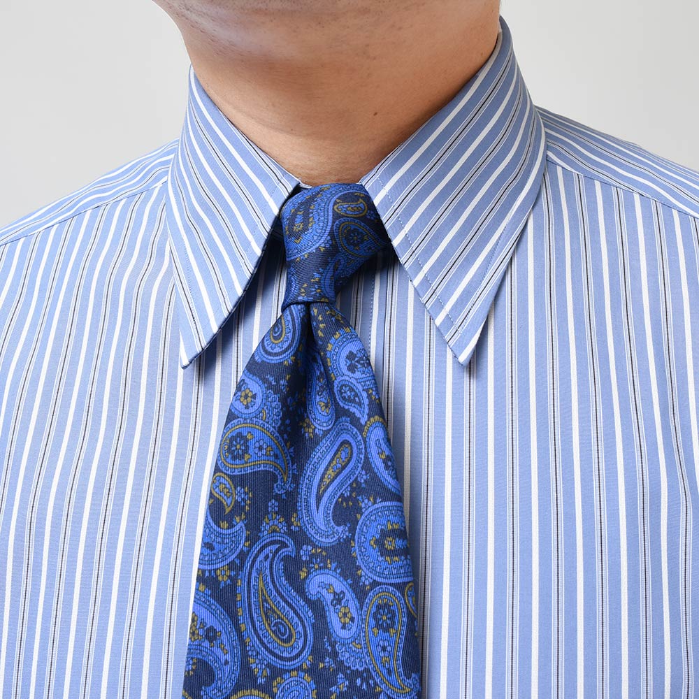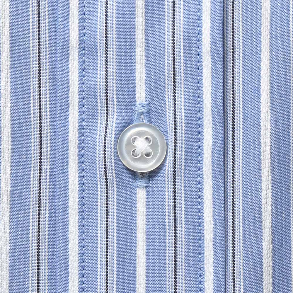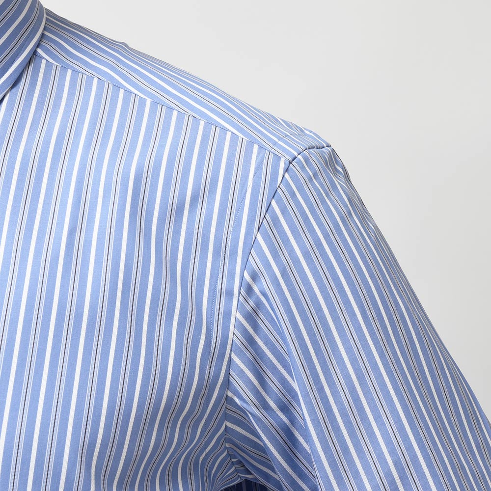 パナマ組織を含んだ、ストライプ柄のシャツ。表面感のあるパナマ組織が特徴で、Vゾーンのスタイリングが楽しめるカラーリングです。また、生地のニュアンスを活かすため若干抜け感が出るよう、タイスペースを広く取った新型のレギュラーカラーを作り上げました。クラシカルなデザインに合わせて前立てはプラケットフロント(表前立て)。クロージングにおけるクラシックが再び見直される昨今、Paul Stuartがあらためて提案するビジネスシャツになります。