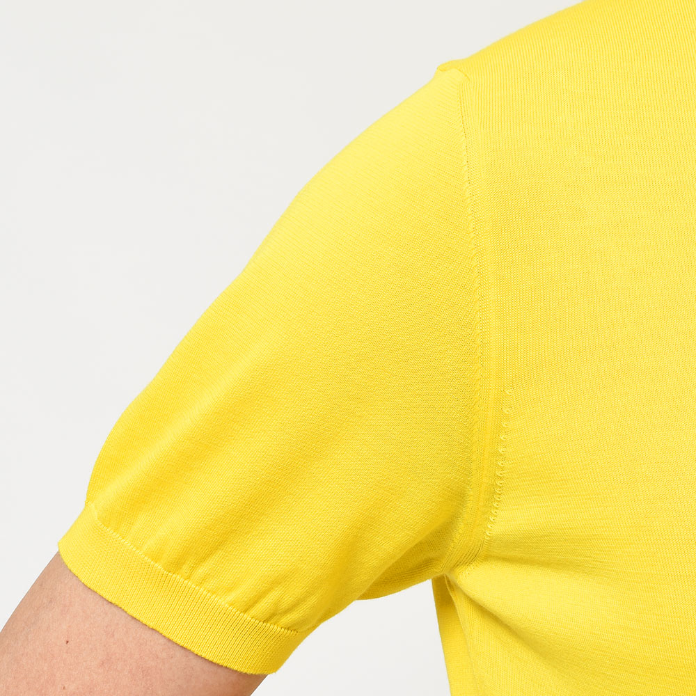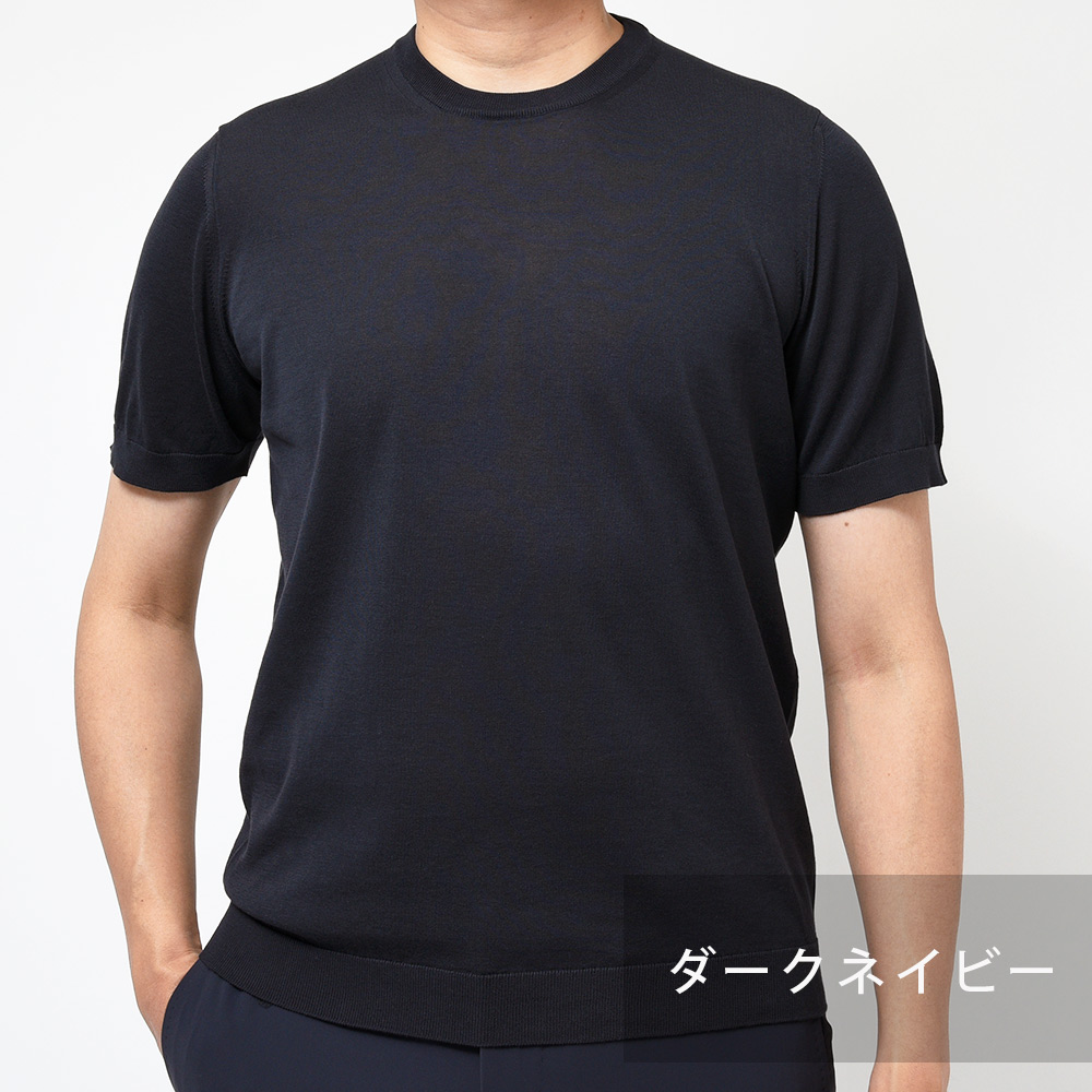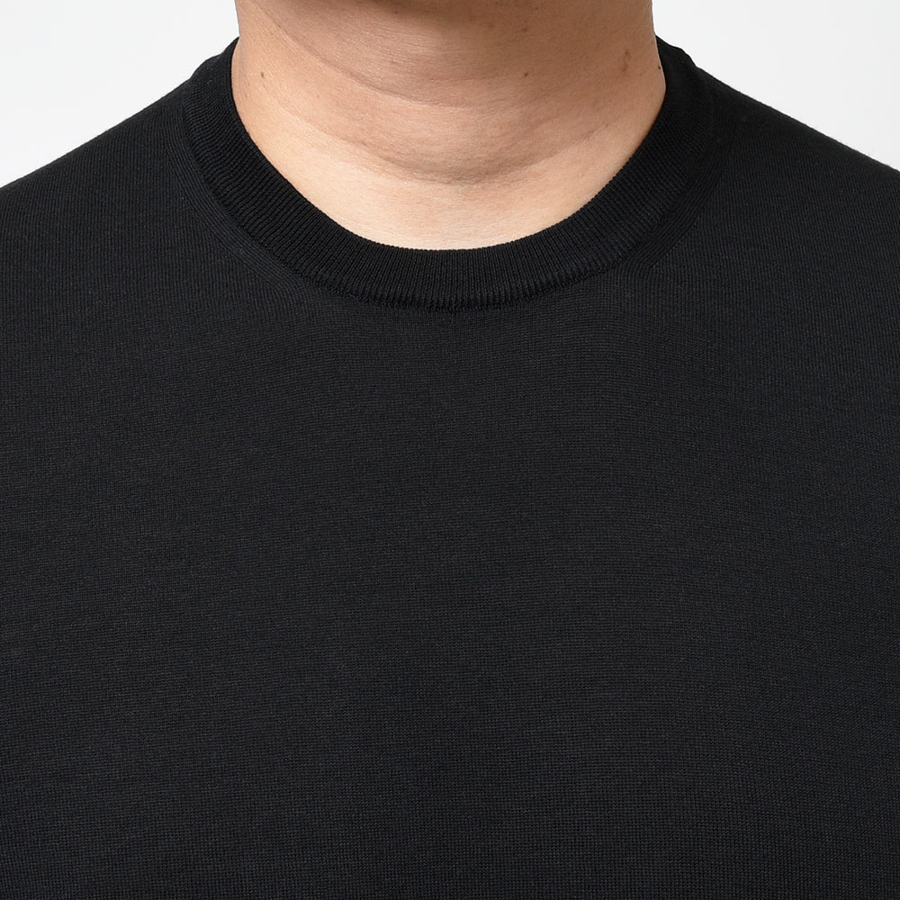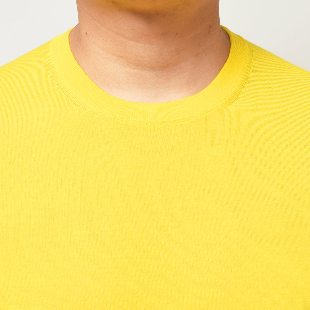 滑らかなでありながらも、ほんのりとシャリっとした肌触りが気持ちいいコットン素材を使用したハイゲージニットは、ネックが詰まり気味のクルーネックタイプ。首回りが詰まっているため上品な見え方となり、ジャケットとの相性はバツグンです。カットソー感覚で着用してなんら問題のない上質な質感が、もうカットソーには戻れない体となってしまう危険性を含んでいます。