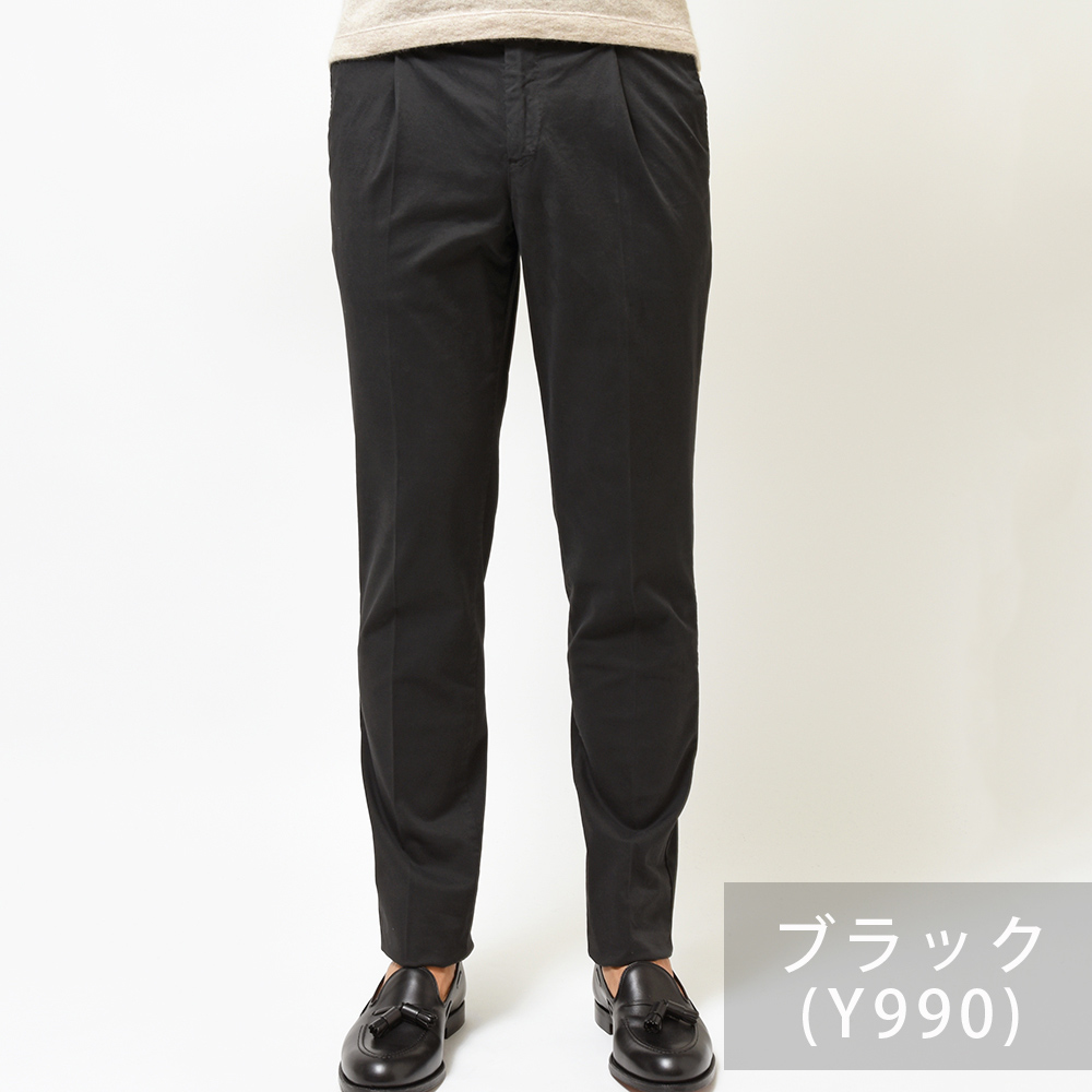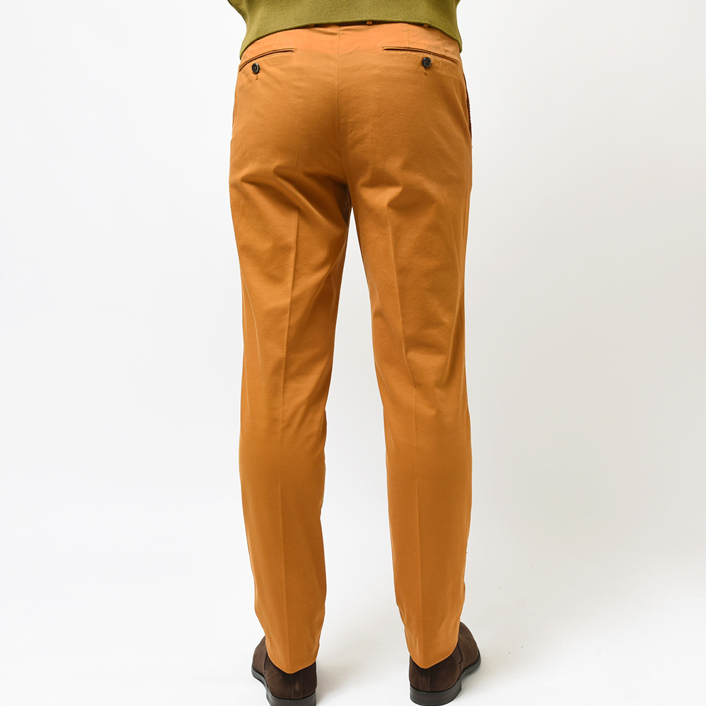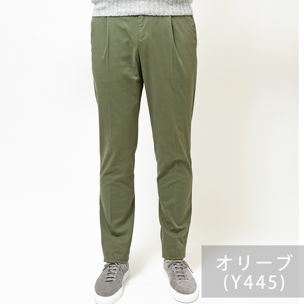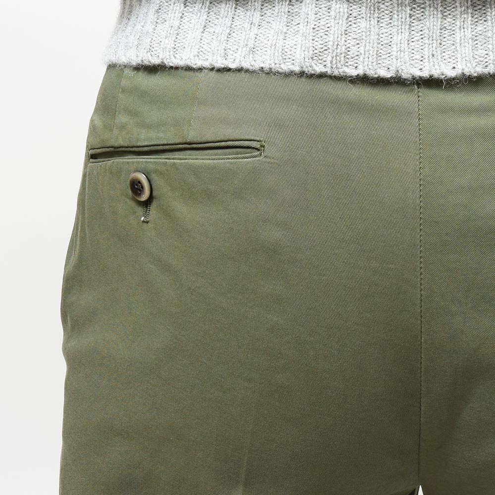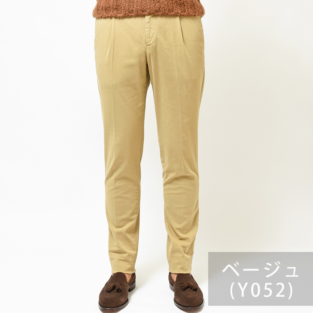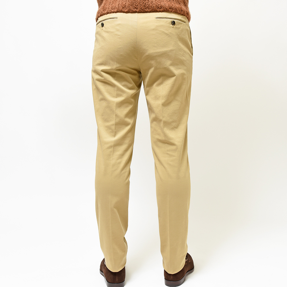 目付け340gの製品洗いをかけたコットンストレッチ素材は、PT TORINOのロングセラーである定番のチノクロスになります。細畝のツイル織りがカジュアルでありながらも上品さとエレガンスを感じさせる、これぞPT TORINOと言える要素が詰まっています。コチラは起毛感を抑え、厚すぎず薄すぎない生地感になりますので、ロングシーズンでの着用が可能となります。