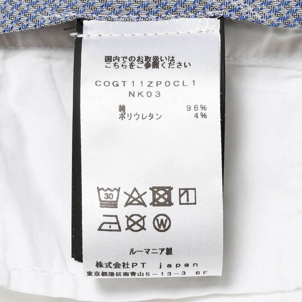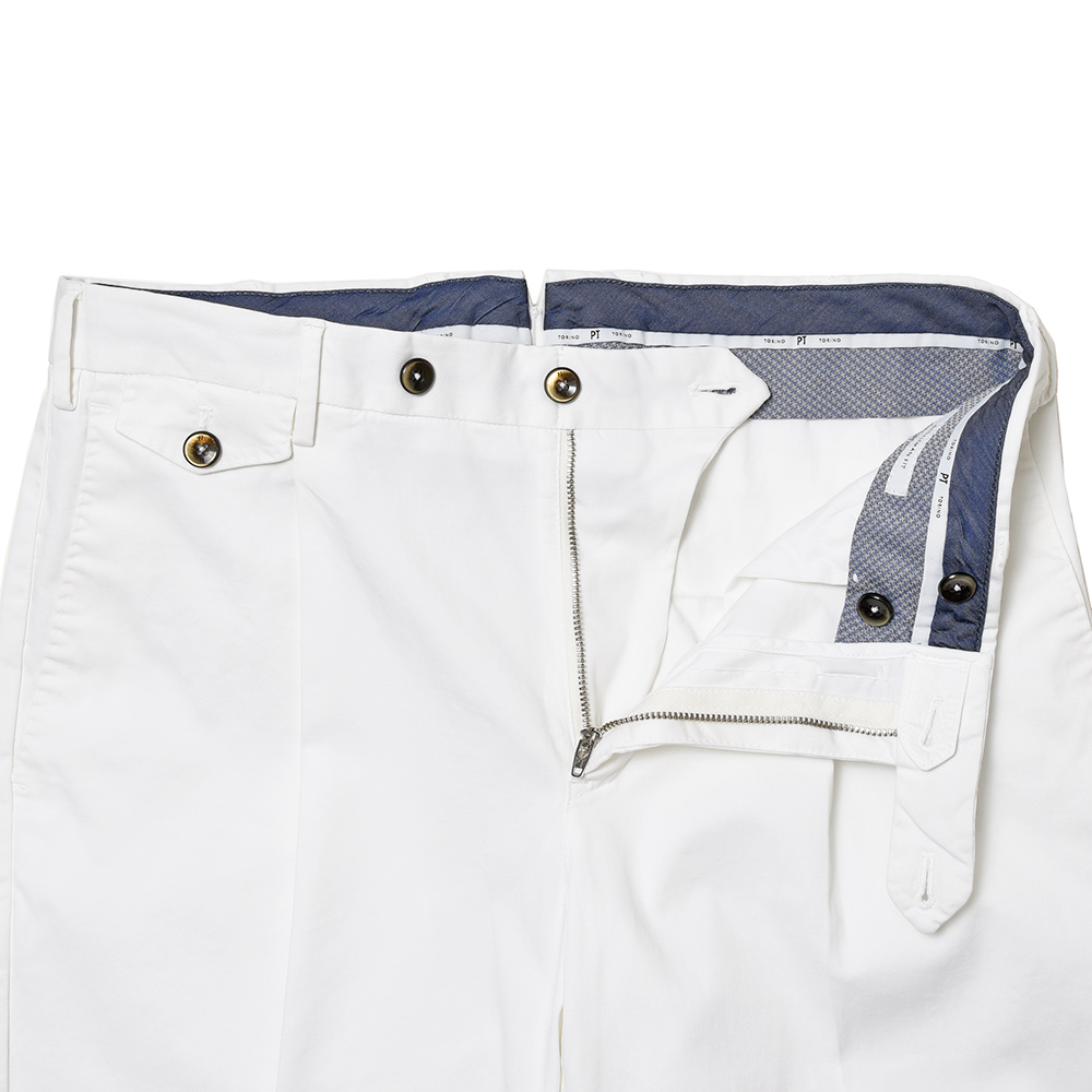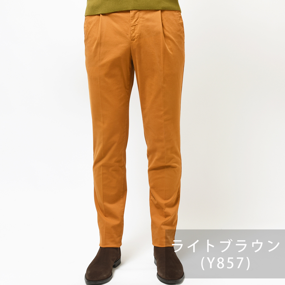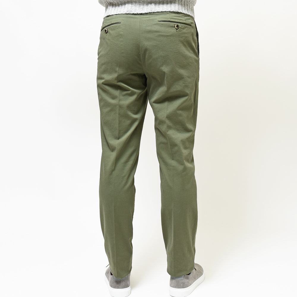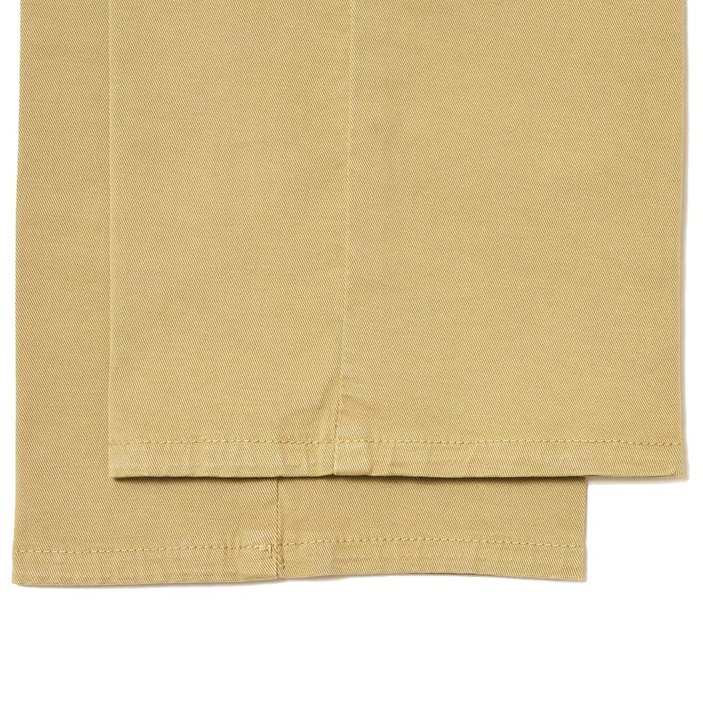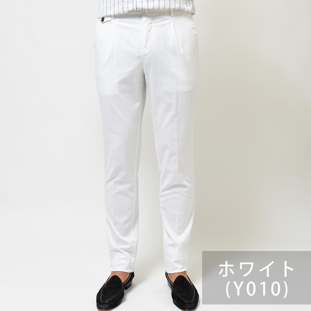目付け340gの製品洗いをかけたコットンストレッチ素材は、PT TORINOのロングセラーである定番のチノクロスになります。細畝のツイル織りがカジュアルでありながらも上品さとエレガンスを感じさせる、これぞPT TORINOと言える要素が詰まっています。コチラは起毛感を抑え、厚すぎず薄すぎない生地感になりますので、ロングシーズンでの着用が可能となります。