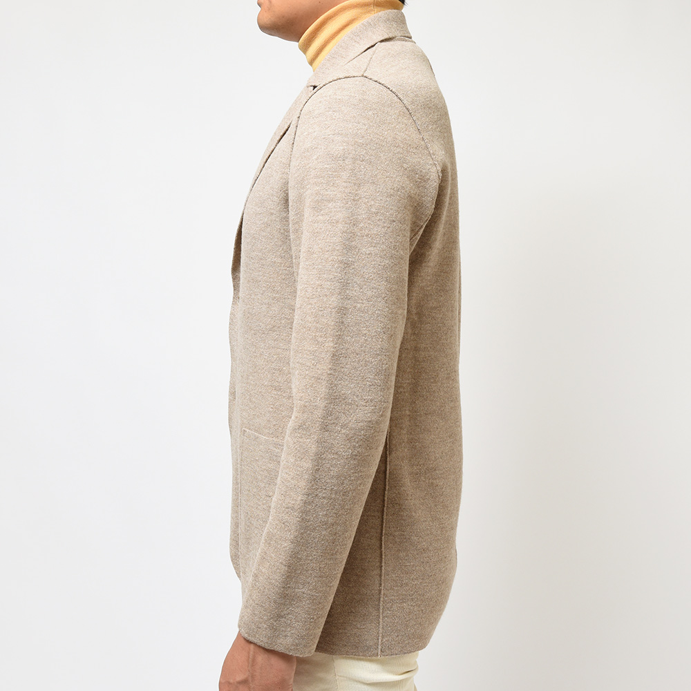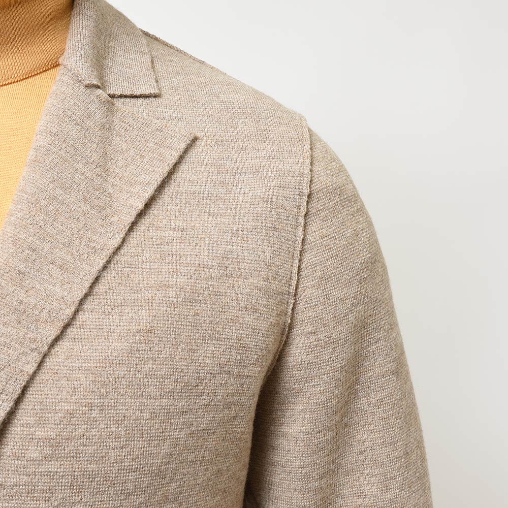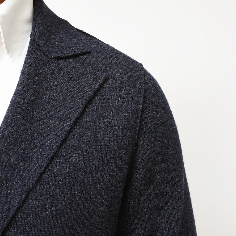 メリノウールを使用したミラノリブは、程よい起毛感が季節性をもたらせつつも、やや薄手のミラノリブですので着心地は非常に軽快です。先シーズンに新登場したニットジャケットモデルは、ココンチが得意とする上品で美しい色出しはそのままに、やや広めのラペルが程よく構築的な雰囲気を醸し出し、ニットの柔らかで上質な質感が適度な抜け感をもたらせてくれます。タイドアップよりも、カットソーやニットにサラリと羽織るだけで様になるスタイリングを作り上げてくれる一品です。