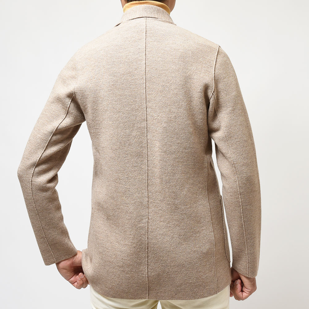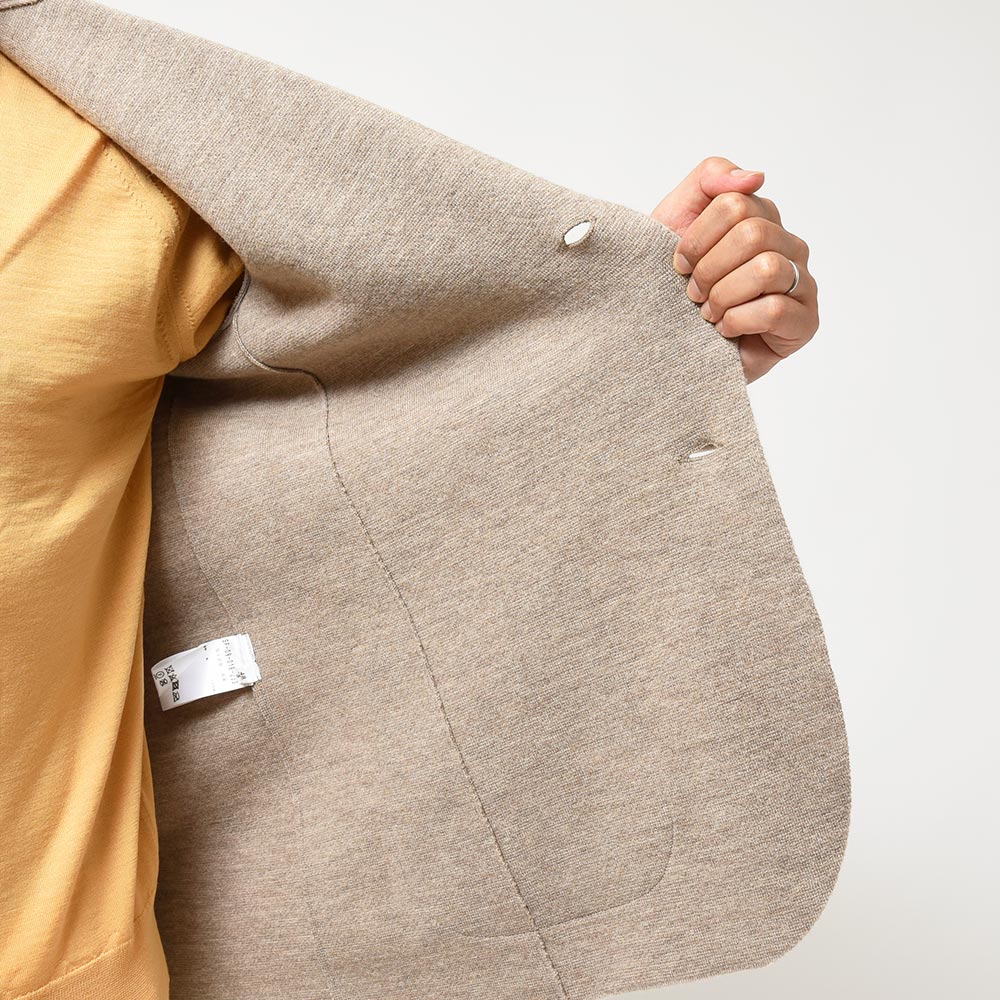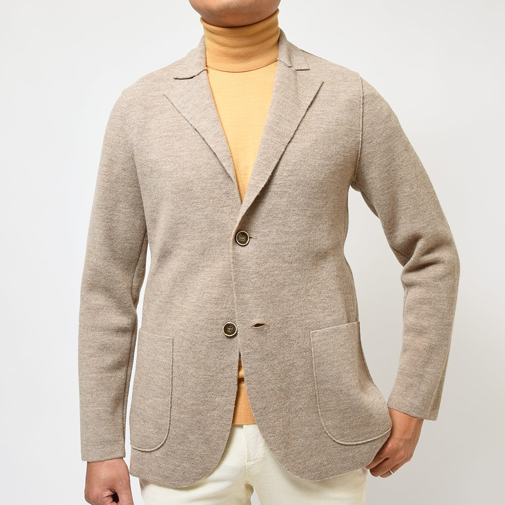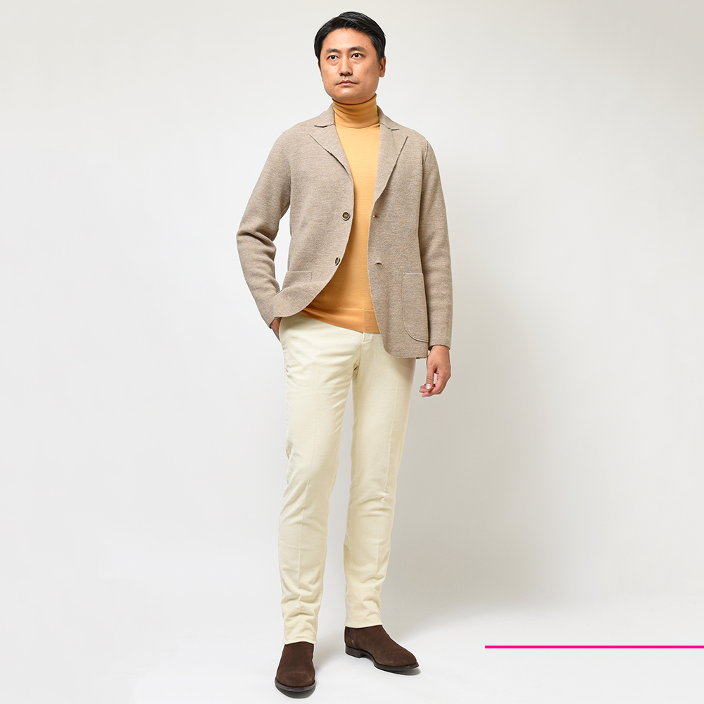 メリノウールを使用したミラノリブは、程よい起毛感が季節性をもたらせつつも、やや薄手のミラノリブですので着心地は非常に軽快です。先シーズンに新登場したニットジャケットモデルは、ココンチが得意とする上品で美しい色出しはそのままに、やや広めのラペルが程よく構築的な雰囲気を醸し出し、ニットの柔らかで上質な質感が適度な抜け感をもたらせてくれます。タイドアップよりも、カットソーやニットにサラリと羽織るだけで様になるスタイリングを作り上げてくれる一品です。