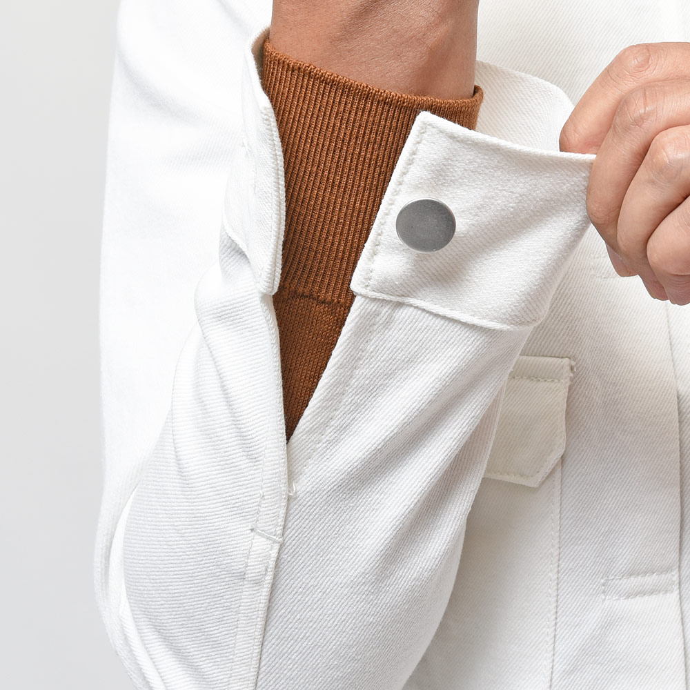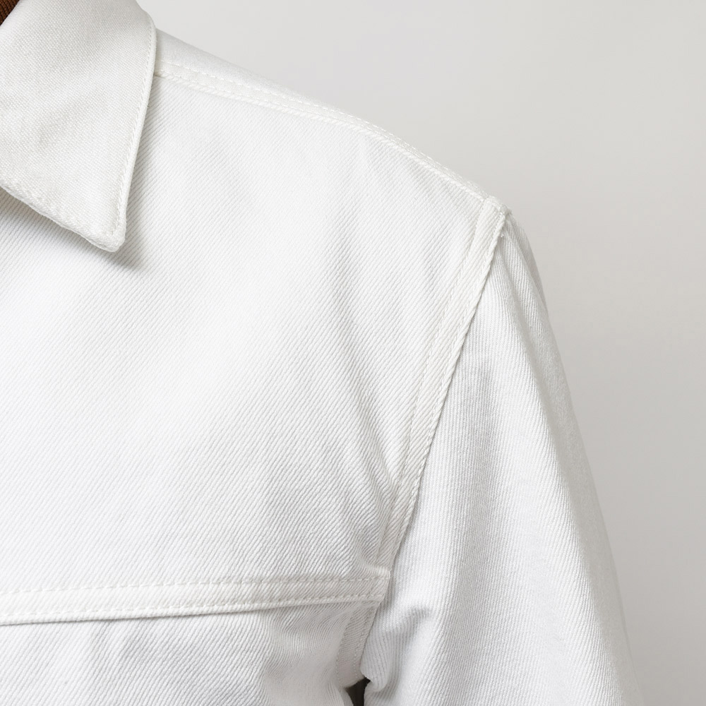 両胸ポケットのボタンに、左胸ポケットのブランドネームタグを排し、使用されているボタンも刻印などのない未気質なデザイン。それらによってビンテージライクではなく、あくまで現代的な表情が生まれ、モダンなスタイルを作り上げてくれます。また、肩付けにテーラードの技術を採用することで前振り袖となっており、肩周りの可動域が確保された抜群の着心地となっています。