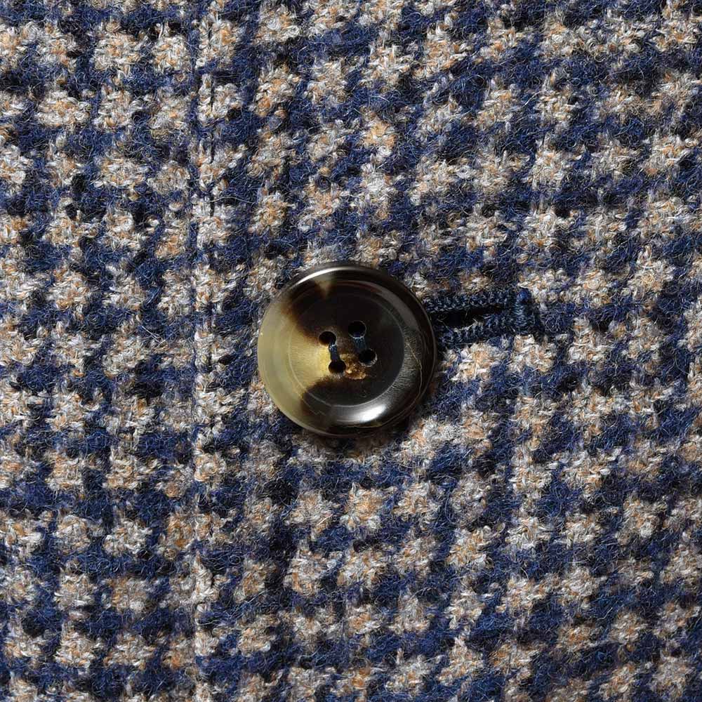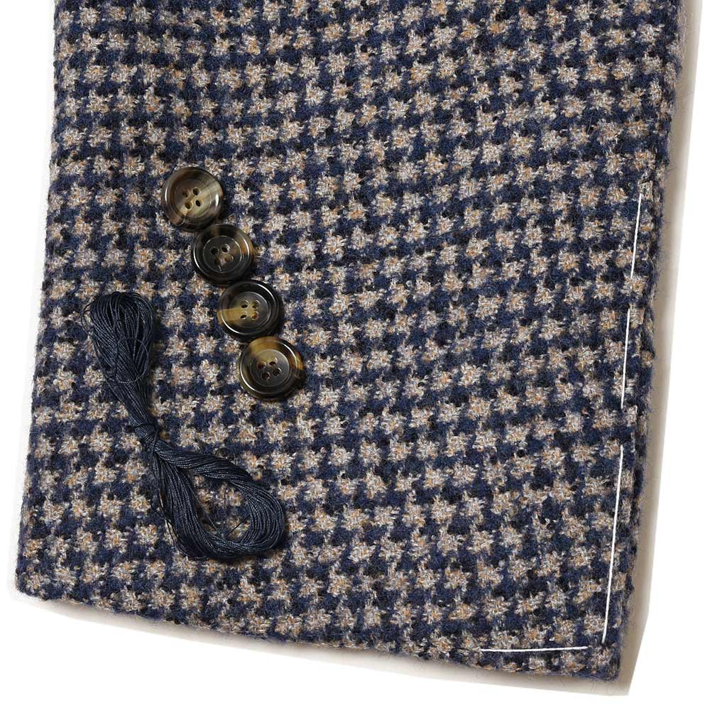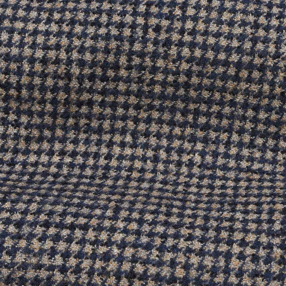 目付350gのウール×ベビーアルパカ×ポリアミドの三者混を使用したこちらは、シンプルなハウンドトゥース柄を採用しています。しかしながら、ベビーアルパカのふんわりとした質感に、ポリアミドのコシが加わることで、柔らかでありながらもどこか英国的な表情を見せます。また、グレーベージュとキャメルの糸を織り交ぜたメランジをベースに、ネイビーを掛け合わせた奥深い味わいのハウンドトゥースです。