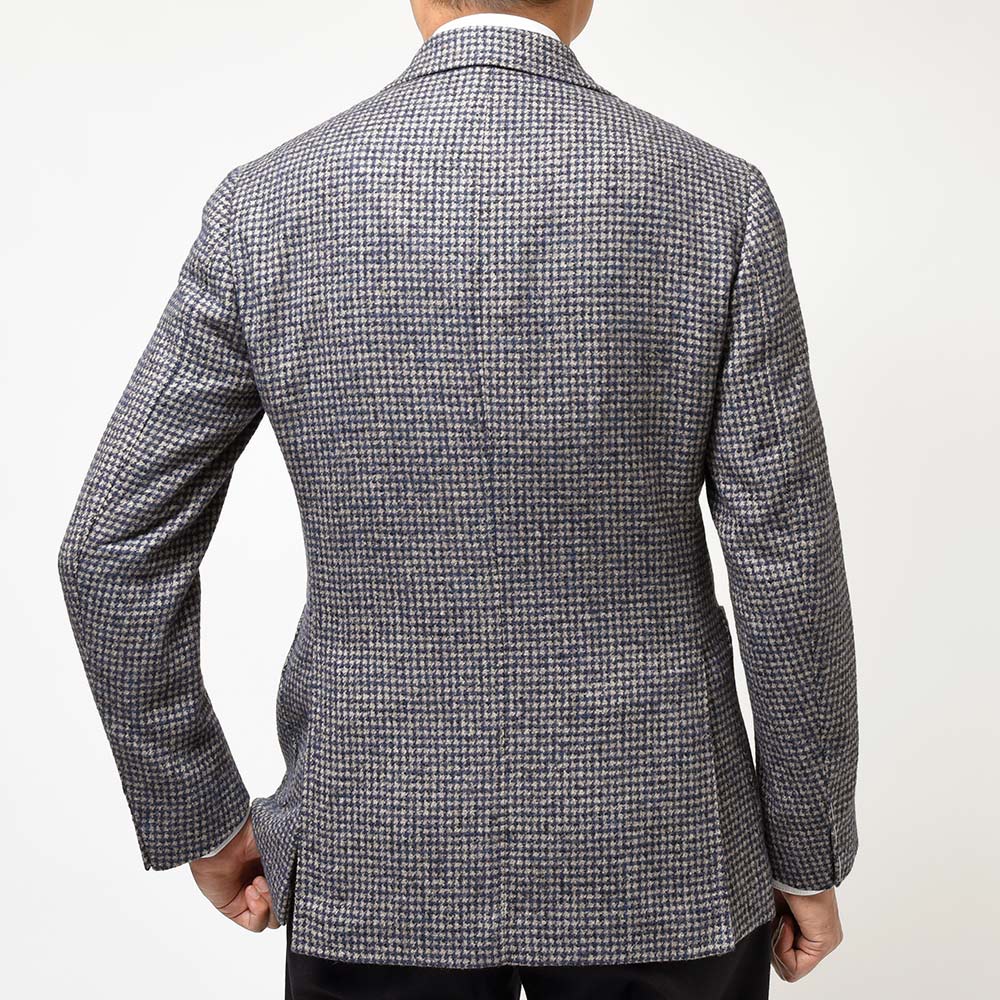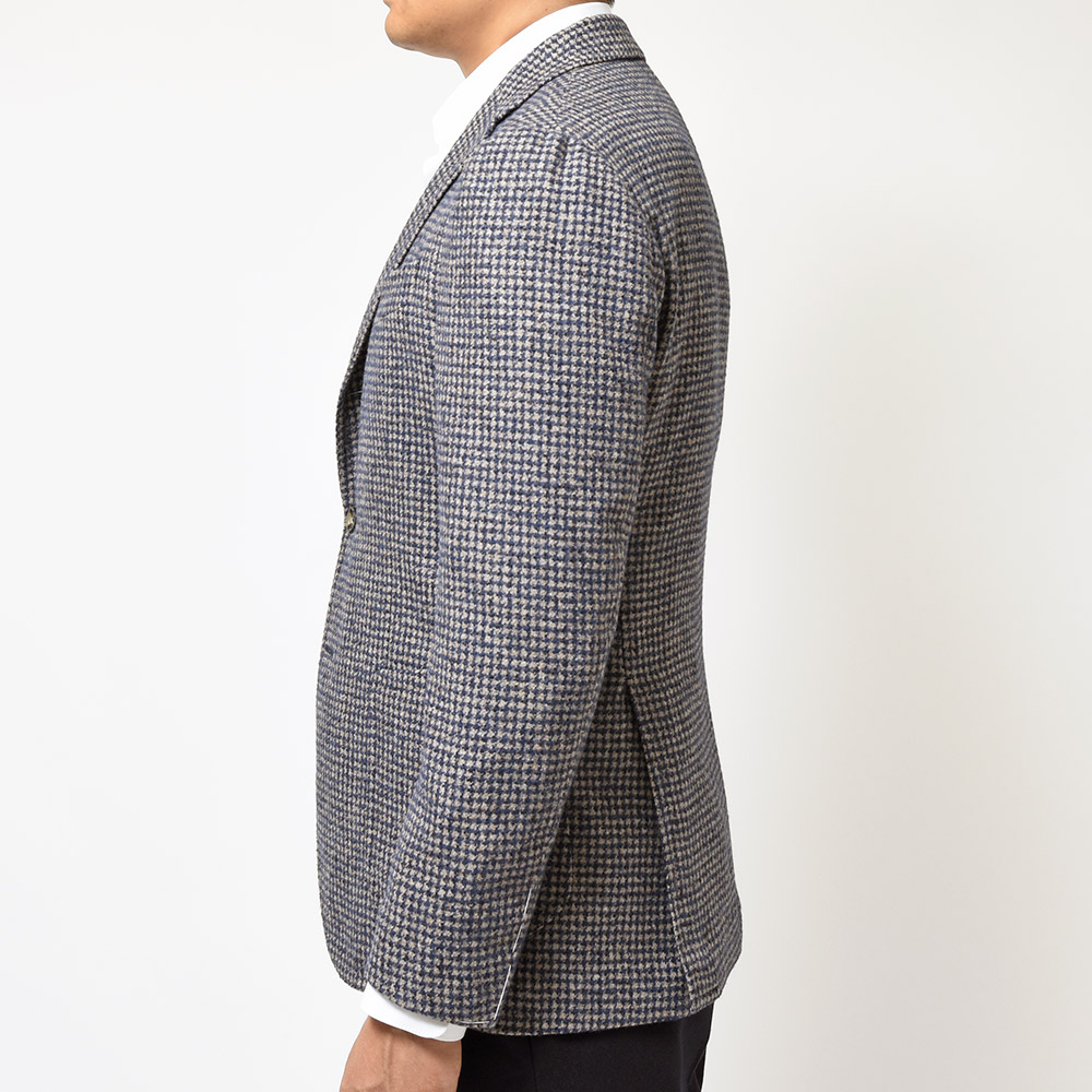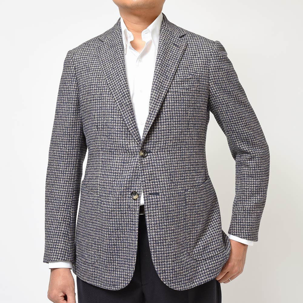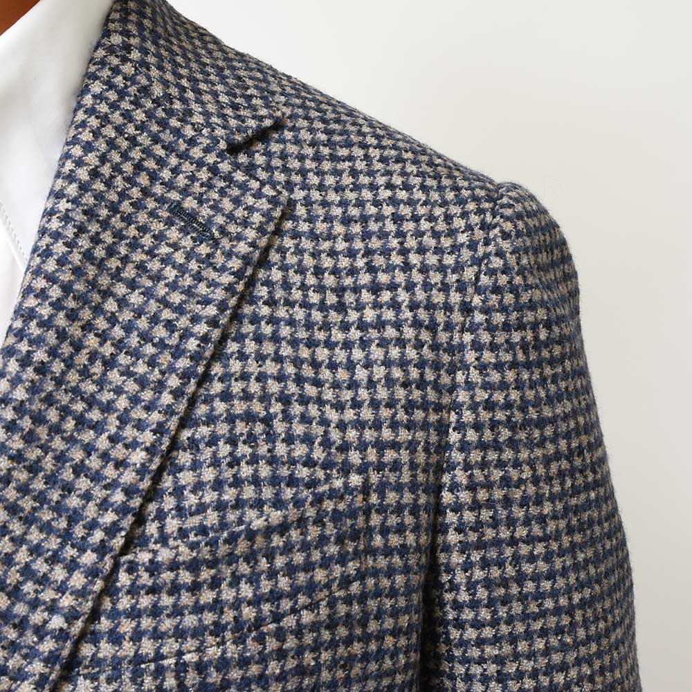 目付350gのウール×ベビーアルパカ×ポリアミドの三者混を使用したこちらは、シンプルなハウンドトゥース柄を採用しています。しかしながら、ベビーアルパカのふんわりとした質感に、ポリアミドのコシが加わることで、柔らかでありながらもどこか英国的な表情を見せます。また、グレーベージュとキャメルの糸を織り交ぜたメランジをベースに、ネイビーを掛け合わせた奥深い味わいのハウンドトゥースです。