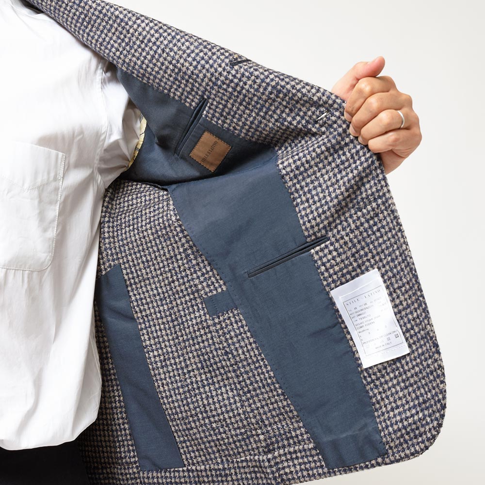 生成りベースにネイビーのハウンドトゥースは汎用性の高いワードローブの心強い味方。