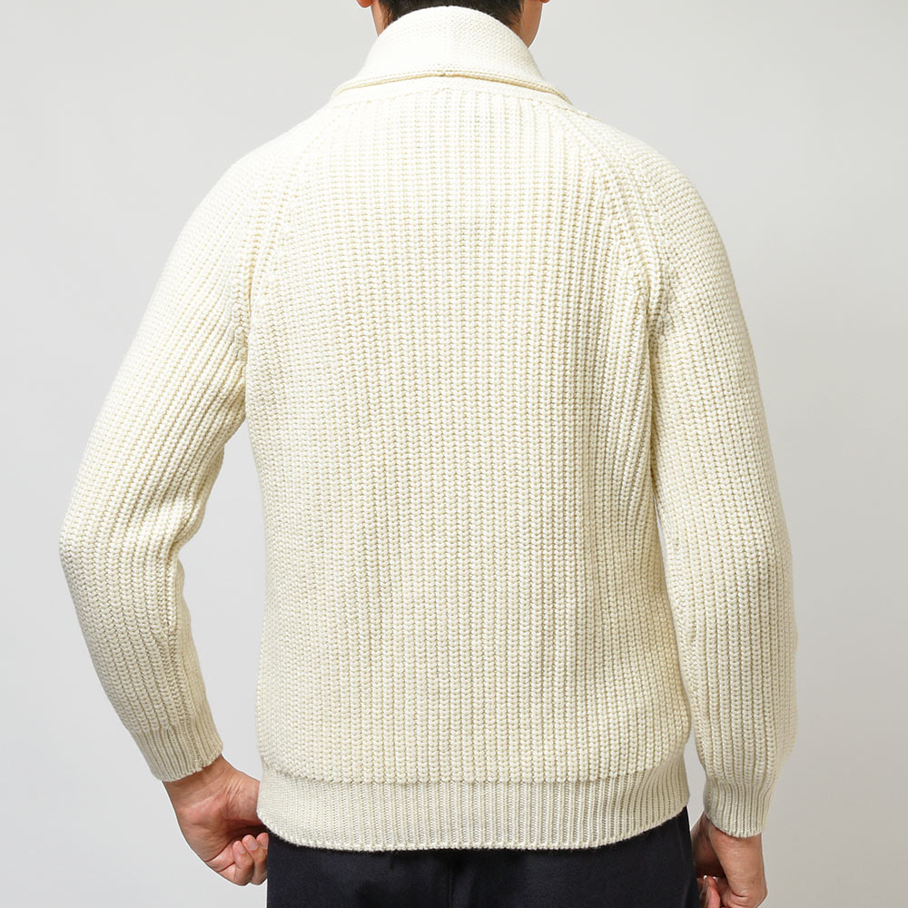 Settefili Cashmereを代表するファブリックの一つである、ウール×カシミヤ素材を使用したこちらは、上品に香らせたメランジに柔らかな素材が合わさることで生まれる品のある佇まい。リブ編みのショールカラーはカジュアルスタイルにも、ドレスライクな雰囲気をもたらせてくれます。カジュアルにチノパンでのスタイリングは勿論、サキソニーやフランネルといったドレスライクなパンツと合わせても遜色のない一品となっています。