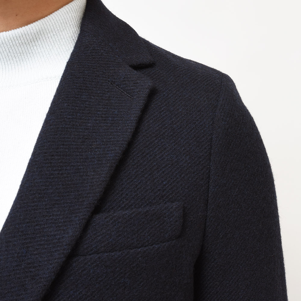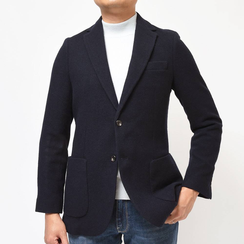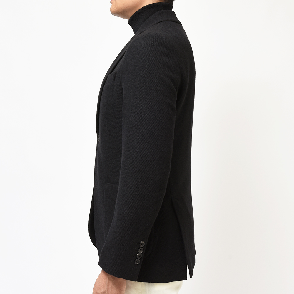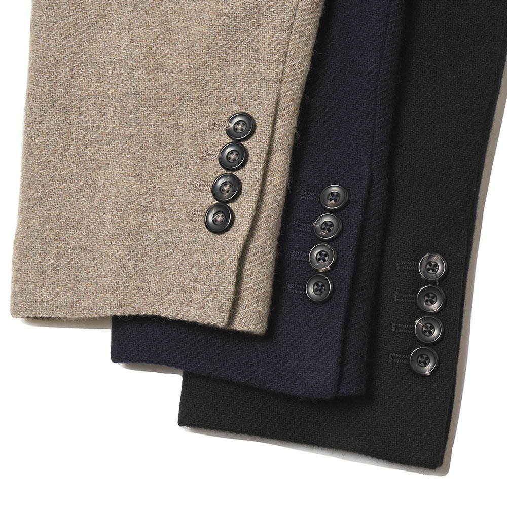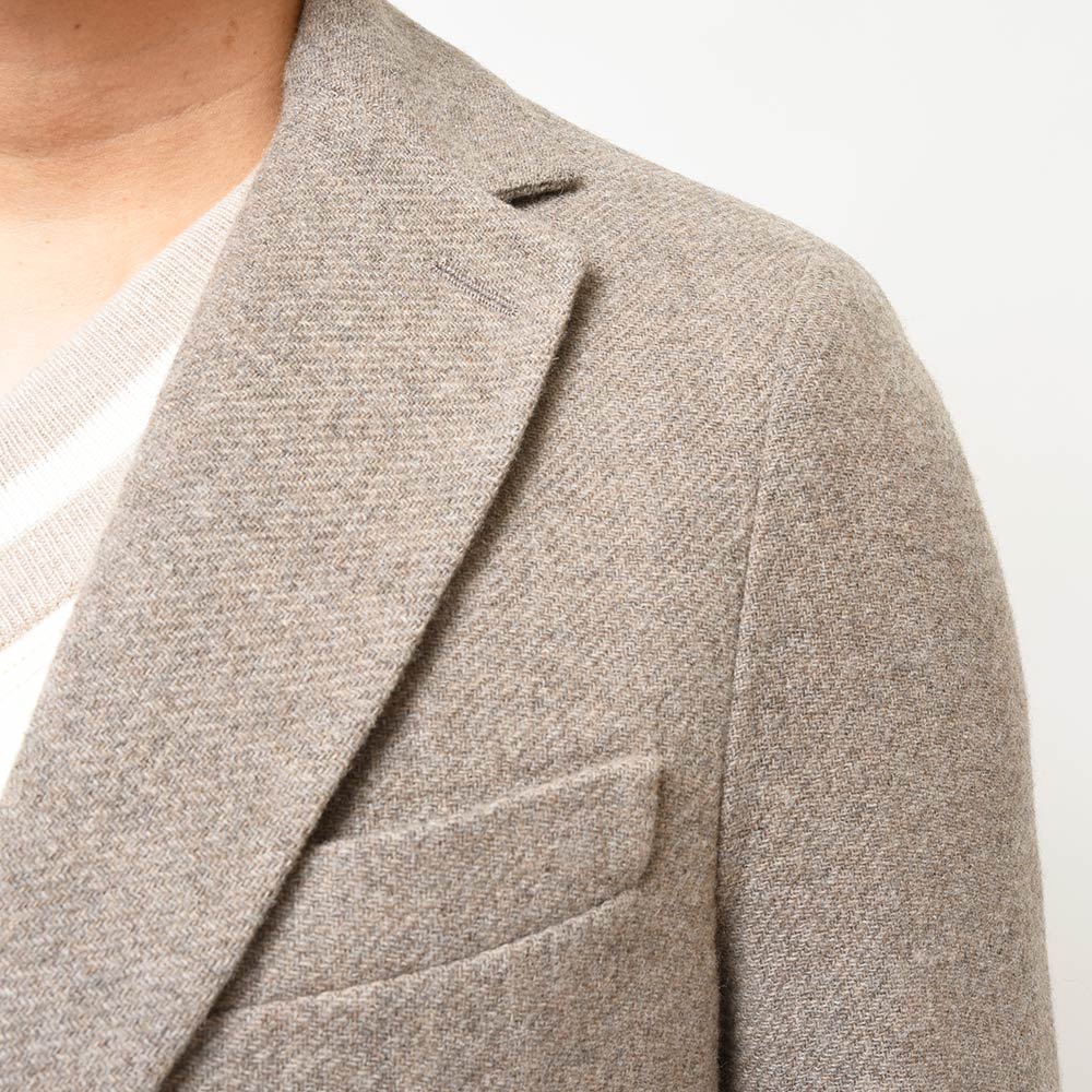 ココンチでは珍しい化繊を使用していない、ウールにカシミヤを混紡した少しツイードタッチな生地は、空気を纏わせたようなエアリーな生地の織りに、アンコン仕立てが合わさることで軽い仕上がりとなっています。勿論、ジャージーによる伸縮性は言わずもがなですので、その着心地はストレスとは全く無縁と言えます。程よくタイトなシルエットに、2つボタン仕様がジュアルなジャケットとして非常に有能な働きをしてくれます。