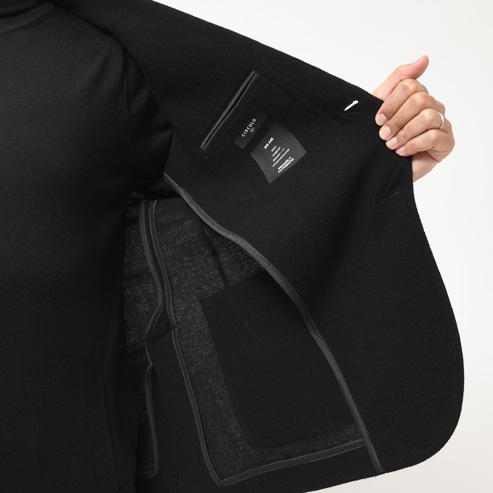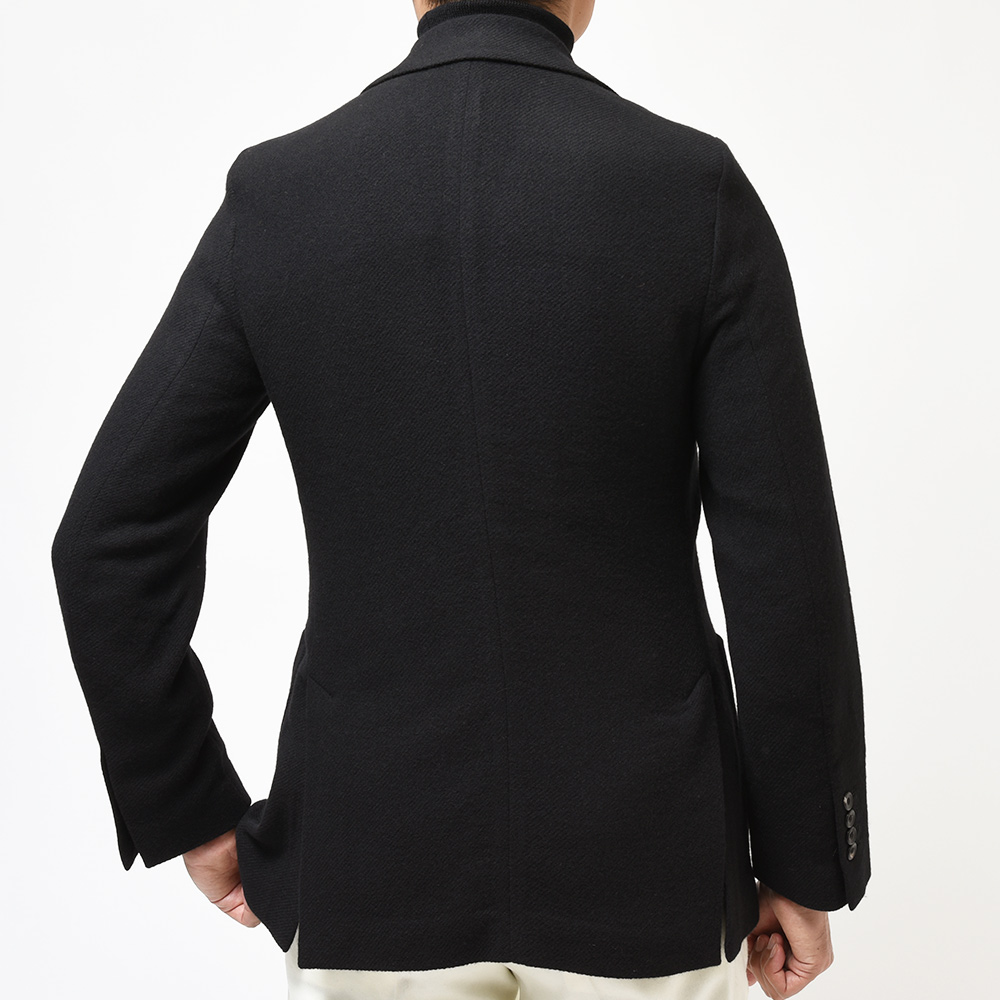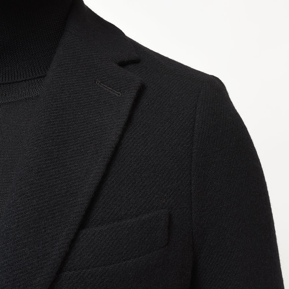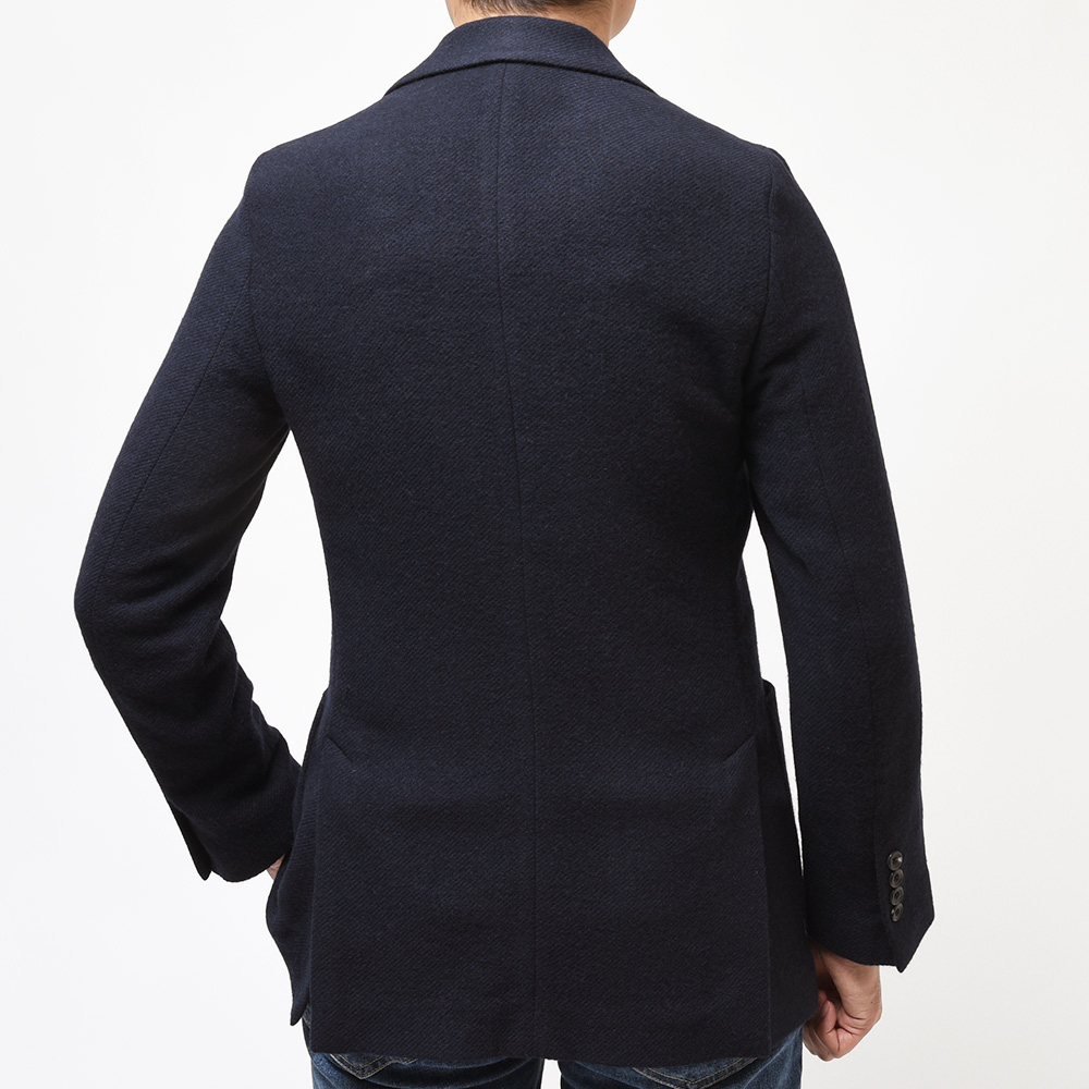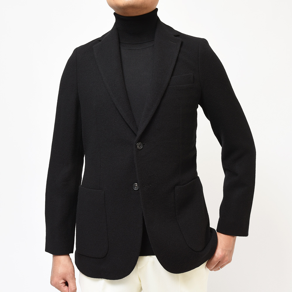 ココンチでは珍しい化繊を使用していない、ウールにカシミヤを混紡した少しツイードタッチな生地は、空気を纏わせたようなエアリーな生地の織りに、アンコン仕立てが合わさることで軽い仕上がりとなっています。勿論、ジャージーによる伸縮性は言わずもがなですので、その着心地はストレスとは全く無縁と言えます。程よくタイトなシルエットに、2つボタン仕様がジュアルなジャケットとして非常に有能な働きをしてくれます。