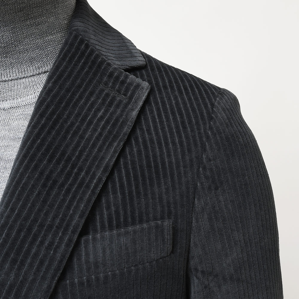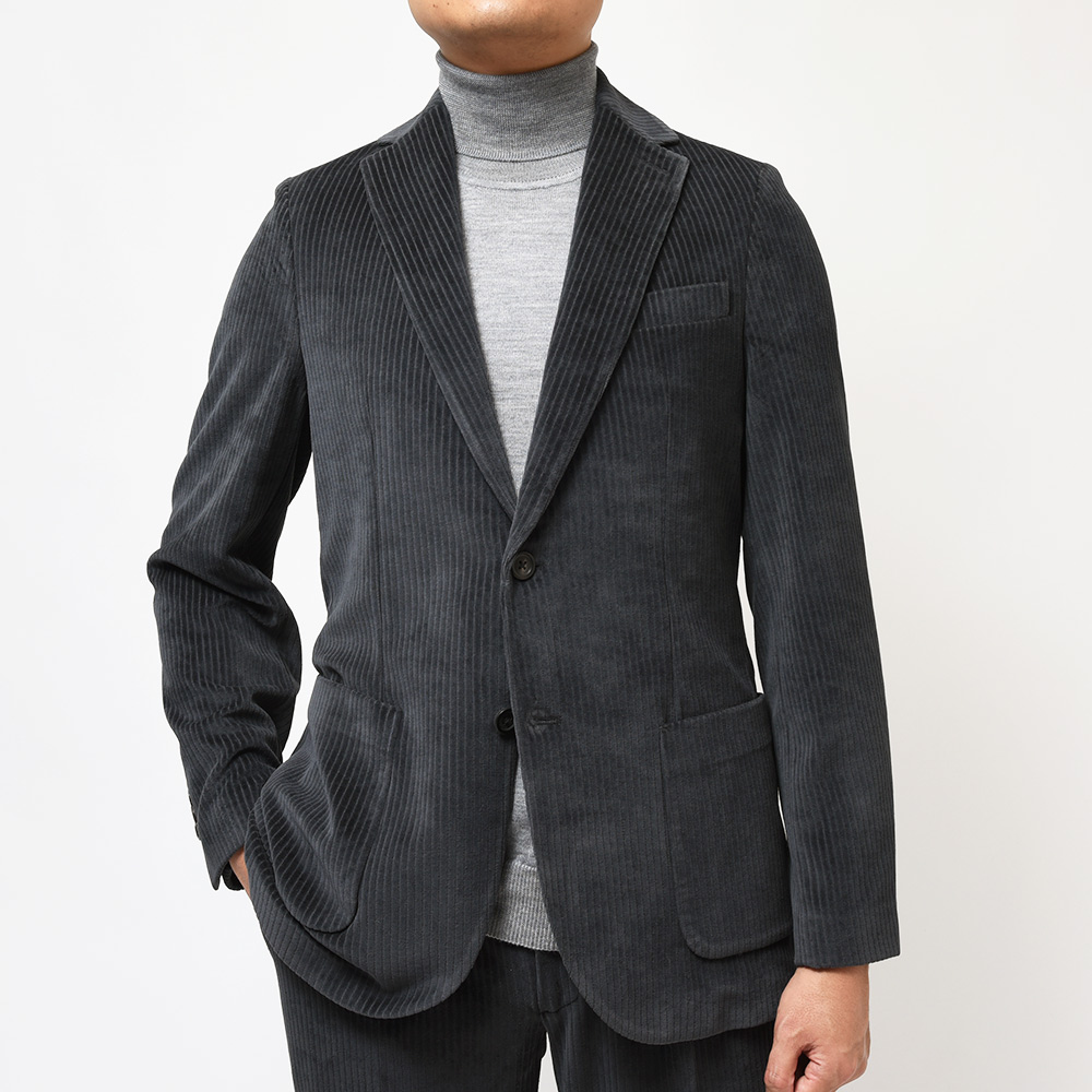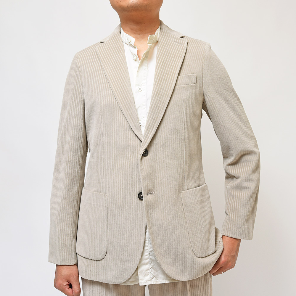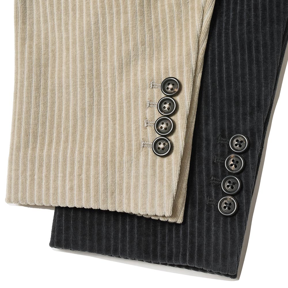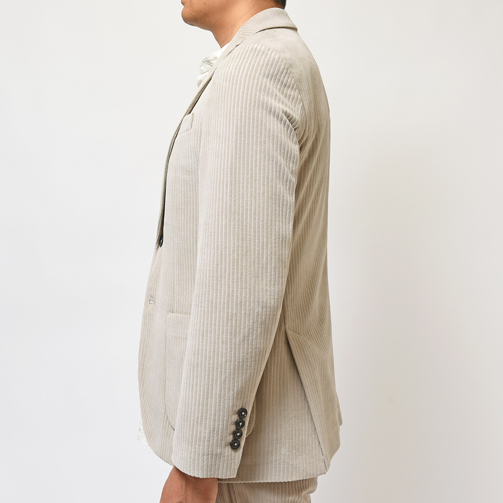 都会的な雰囲気のソフトコーデュロイは、季節感を持たせつつも着回しやすさが魅力です。柔らかくソフトな風合いのコーデュロイですので、土着感は皆無。トレンド感を漂わせつつもモダンな表情を覗かせてくれます。程よくタイトなシルエットに、2つボタン仕様がジュアルなジャケットとして非常に有能な働きをしてくれます。