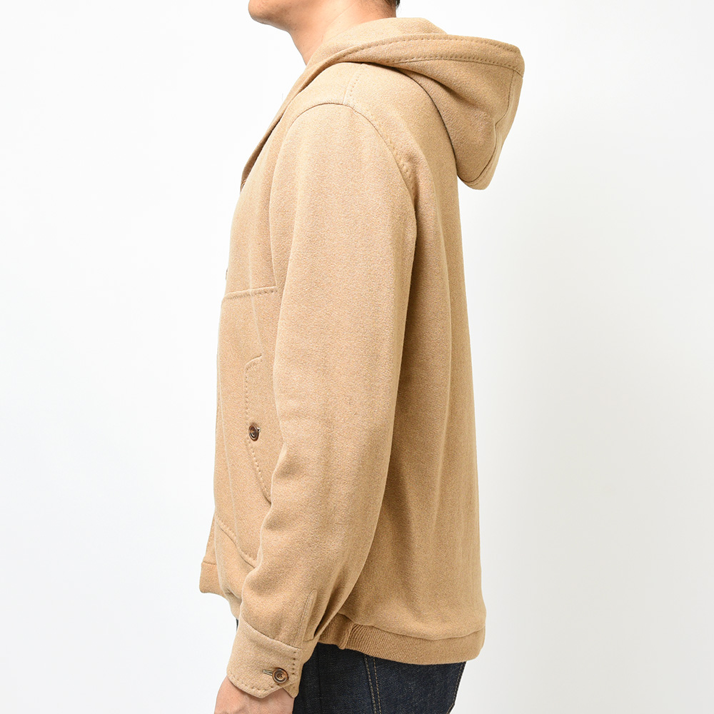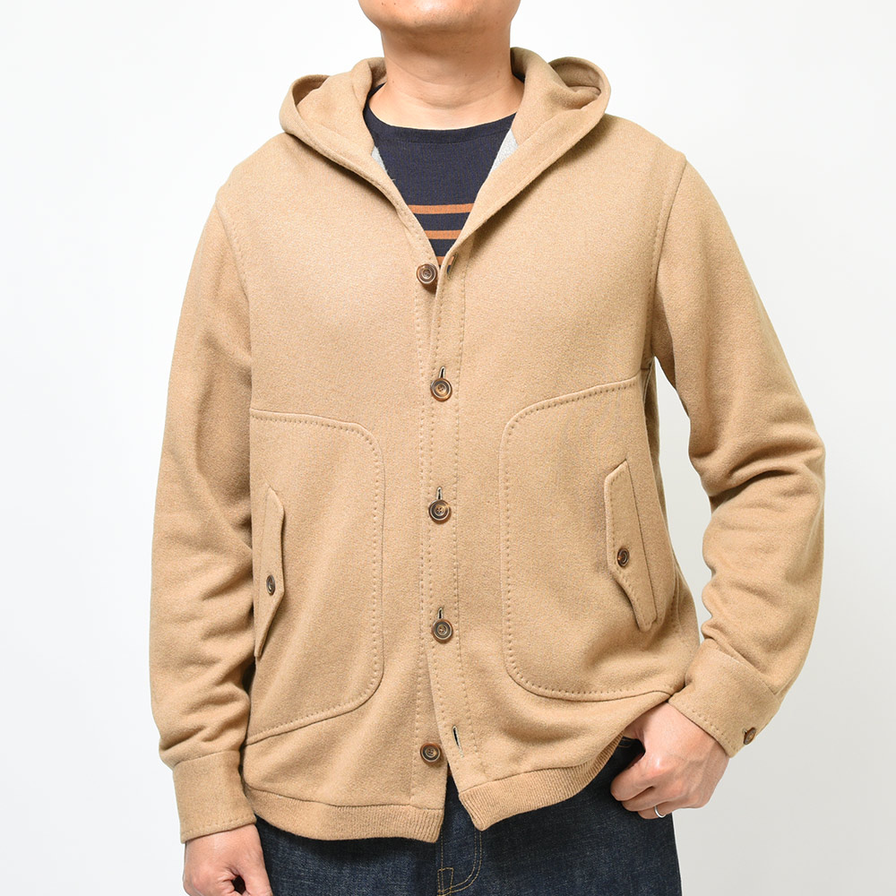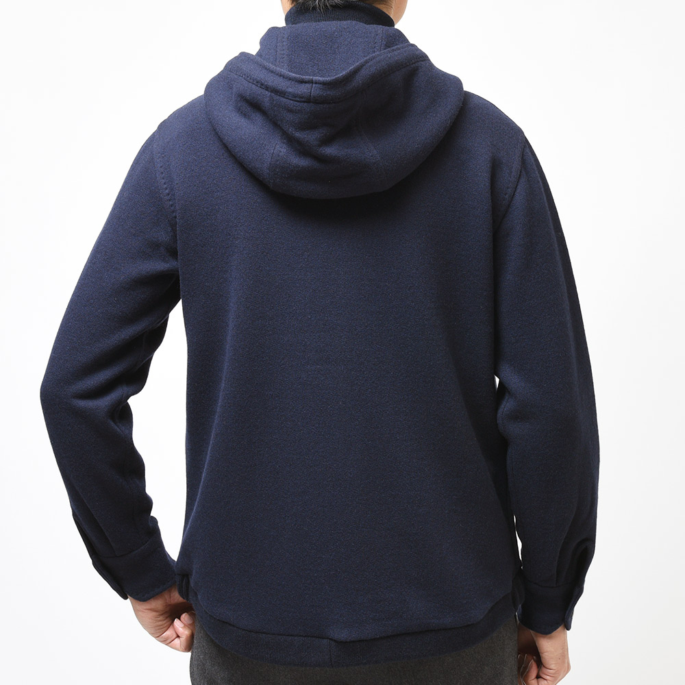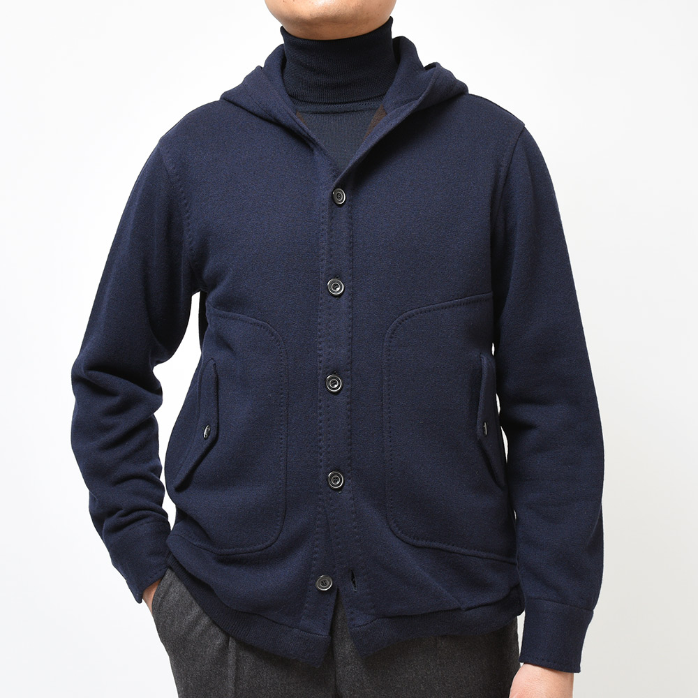 新登場したモデル“BRISTOL”は、裏地のない仕立てのニットブルゾン。フーデットや裾のリブ仕様といったスポーティーな雰囲気に、袖口はリブではなくカフ仕様となったカジュアルに触れ過ぎない絶妙な塩梅が魅力です。素材はカシミヤとヴァージンウールをメインにコットンをブレンド。柔らかで滑らかなタッチは極上の着心地を生みます。また、裏側は起毛感を持たせた質感ですので保温性があり、本格的な冬の前の時期や、真冬ではオーバーコートのインナーや、ダウンベストと重ね着したスタイルにも適応できる懐の深さがあります。