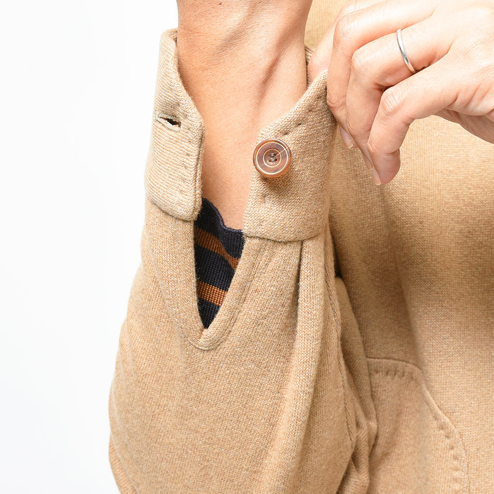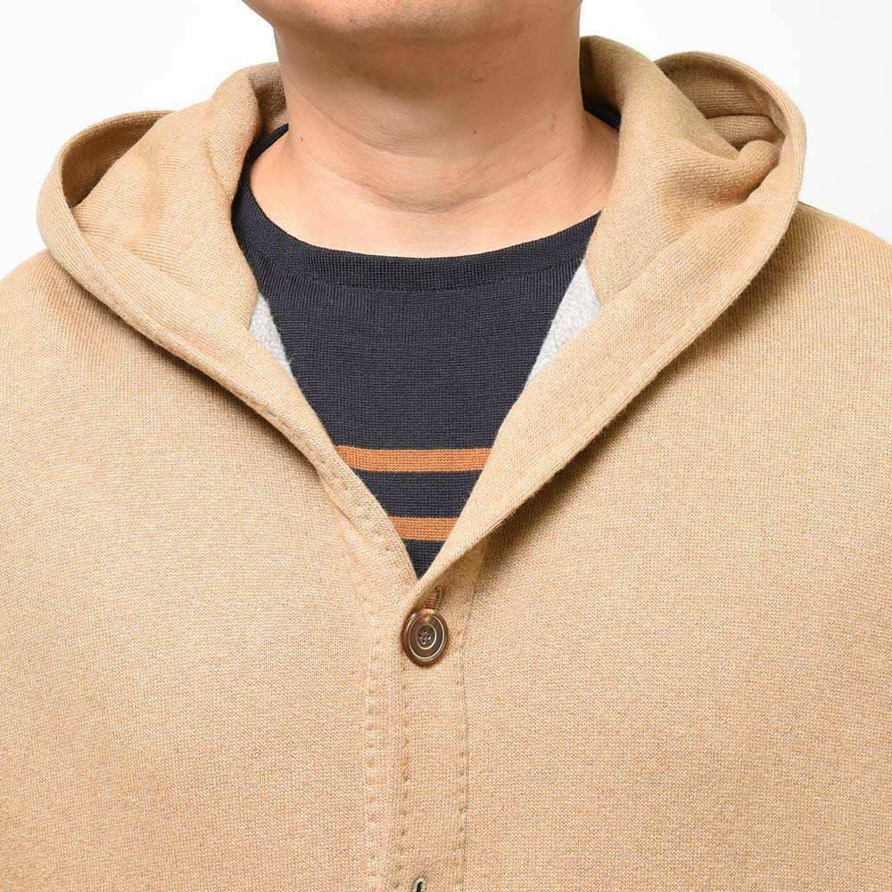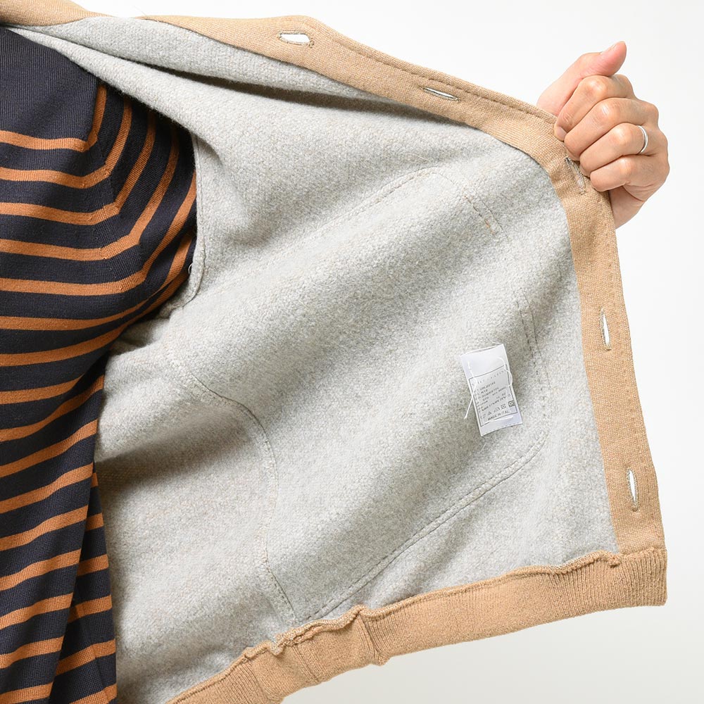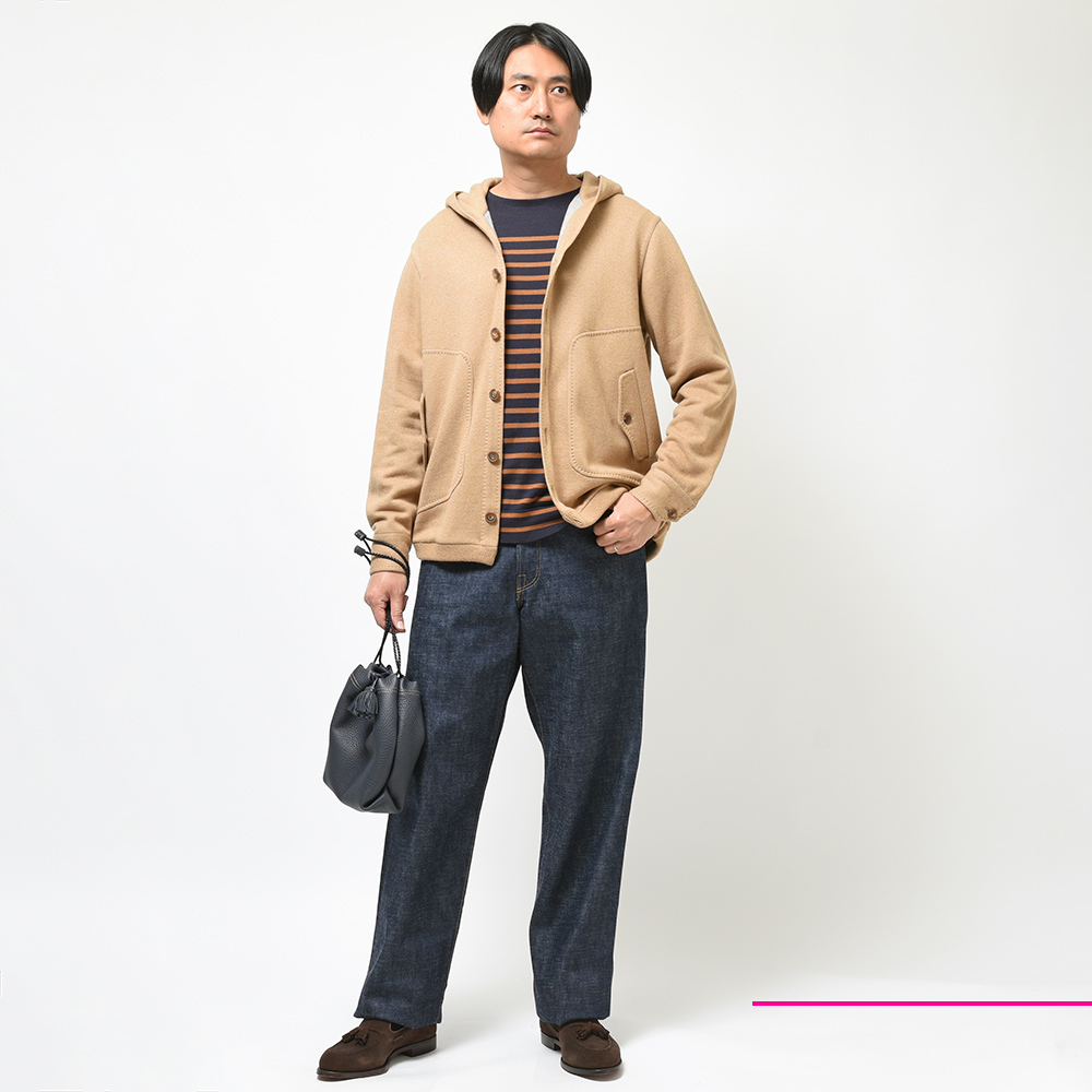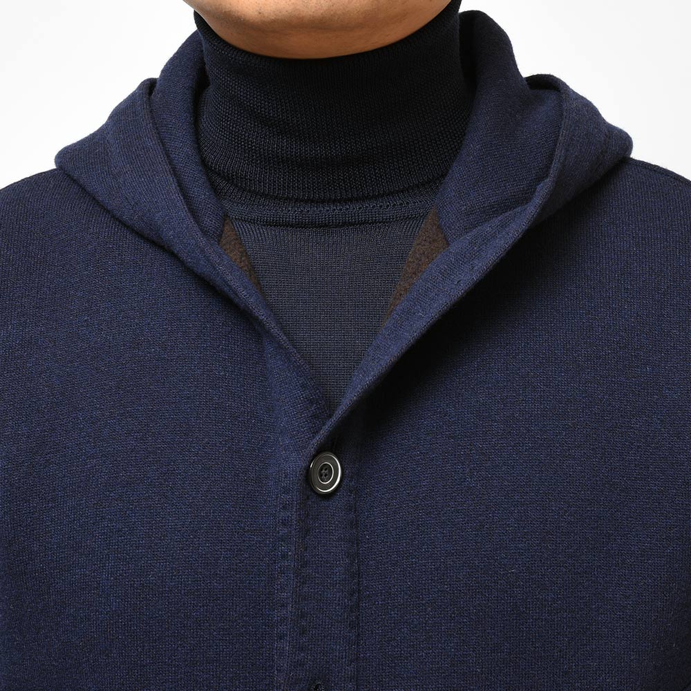 新登場したモデル“BRISTOL”は、裏地のない仕立てのニットブルゾン。フーデットや裾のリブ仕様といったスポーティーな雰囲気に、袖口はリブではなくカフ仕様となったカジュアルに触れ過ぎない絶妙な塩梅が魅力です。素材はカシミヤとヴァージンウールをメインにコットンをブレンド。柔らかで滑らかなタッチは極上の着心地を生みます。また、裏側は起毛感を持たせた質感ですので保温性があり、本格的な冬の前の時期や、真冬ではオーバーコートのインナーや、ダウンベストと重ね着したスタイルにも適応できる懐の深さがあります。