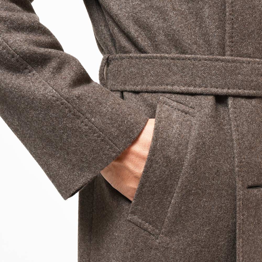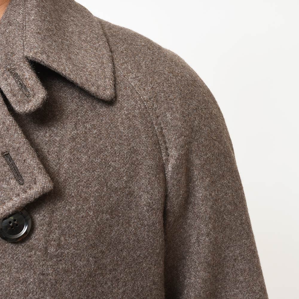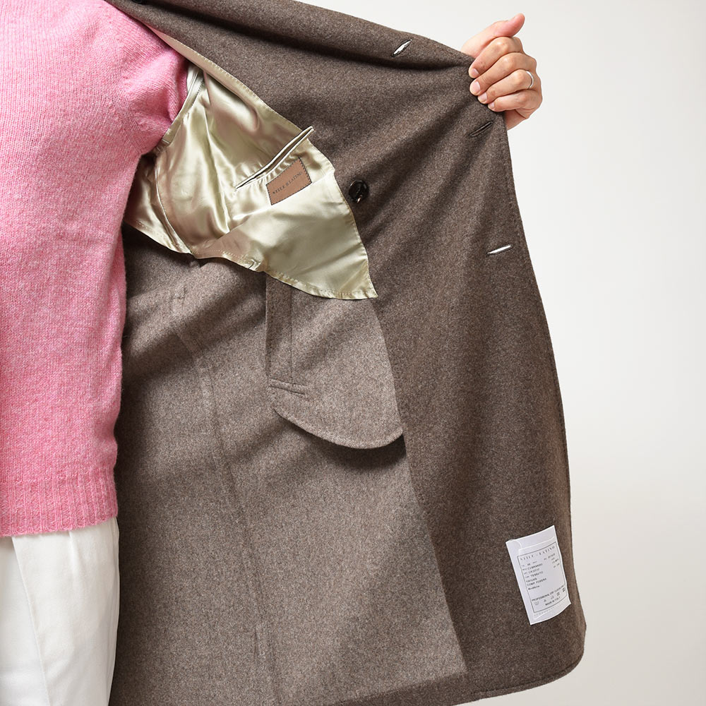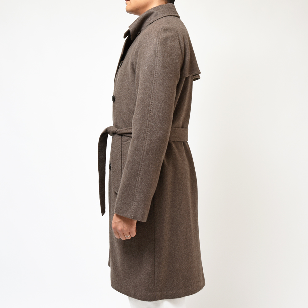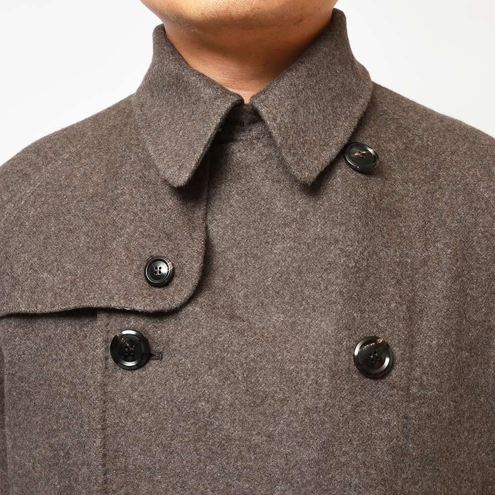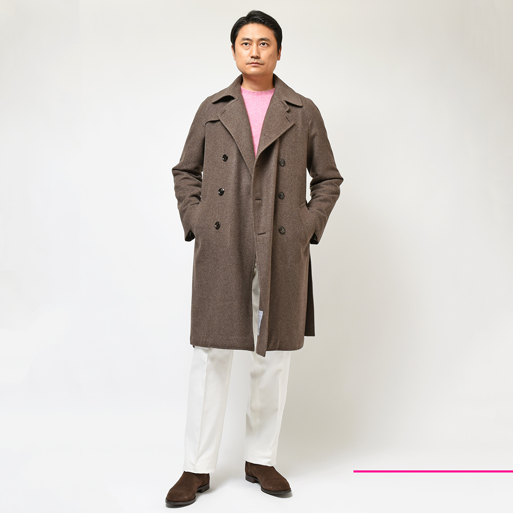 カシミヤのエアリーな質感が生かされたコチラは、グレイッシュなブラウンがシックな中にもモダンな色気を感じさせる絶妙な色味。柔らかなカシミヤ素材だからこそ生まれるドレープ感は、ダブルブレストのモデルとは高相性です。