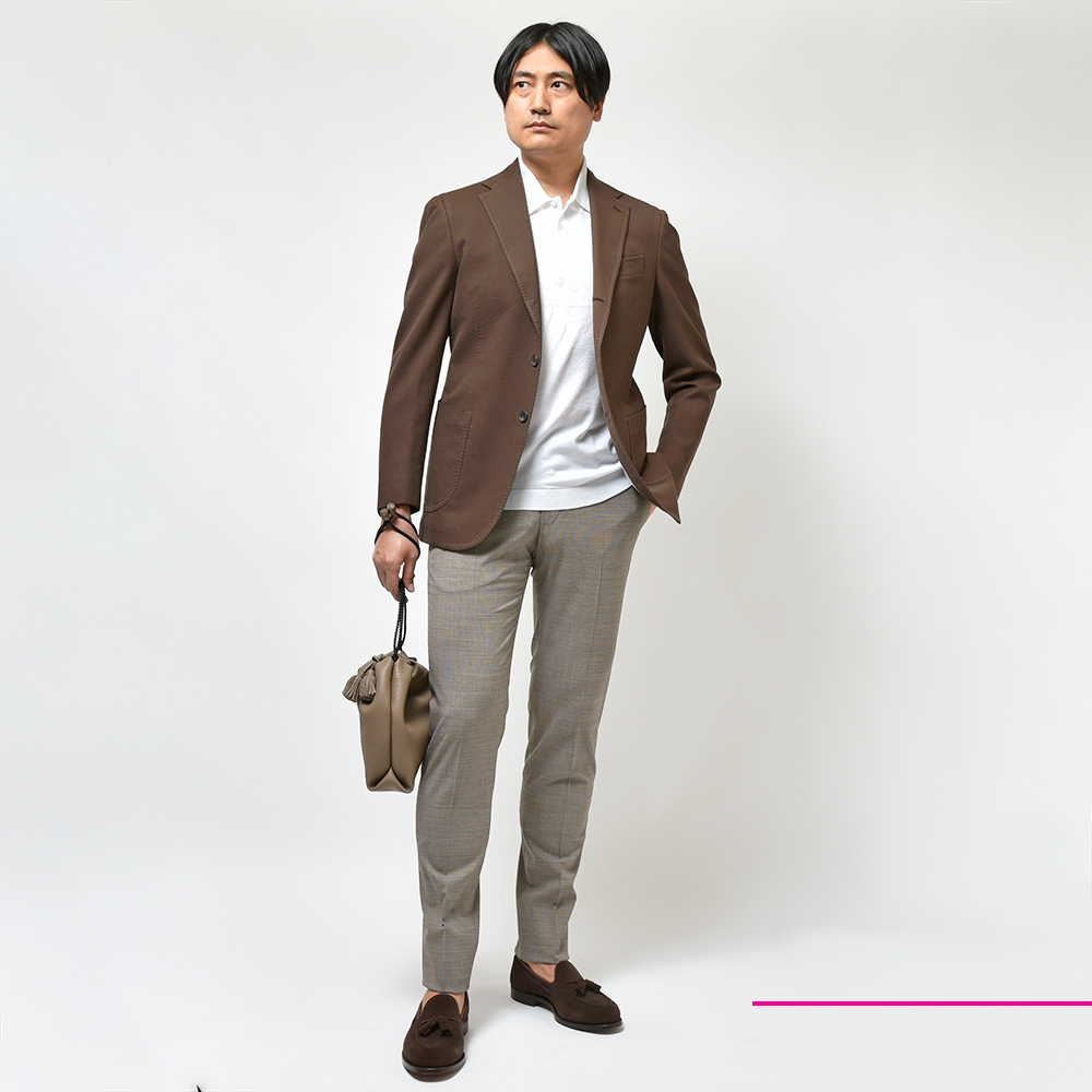 遠目でいるとメランジ調に見える細かな柄使いのハウンドトゥースは、無地ではちょっと無難だけど柄物はジャケットを選ぶしな・・、というシーンでは本当に頼りになります。