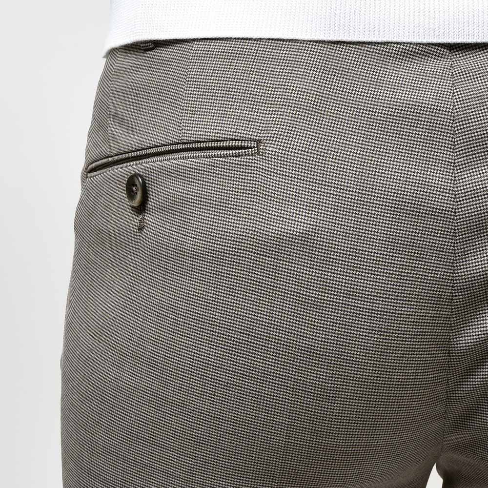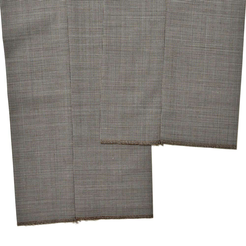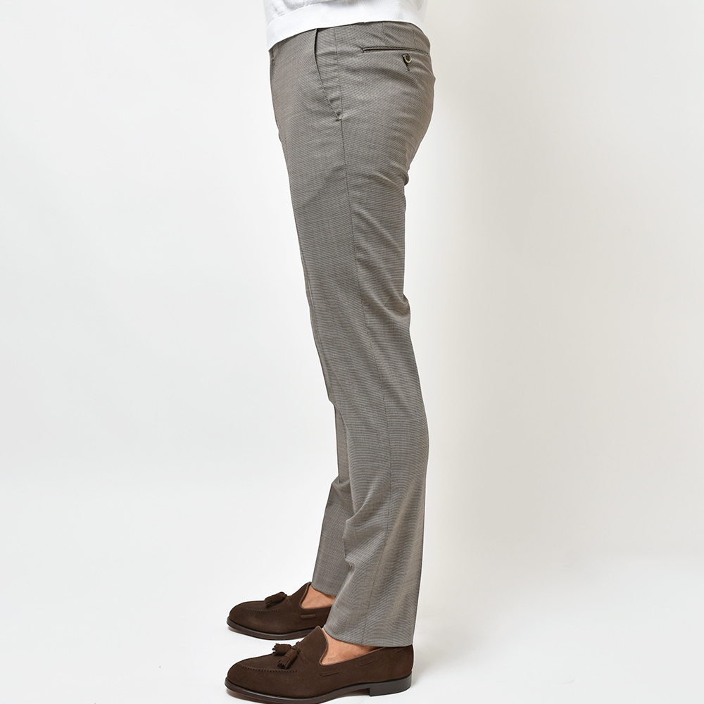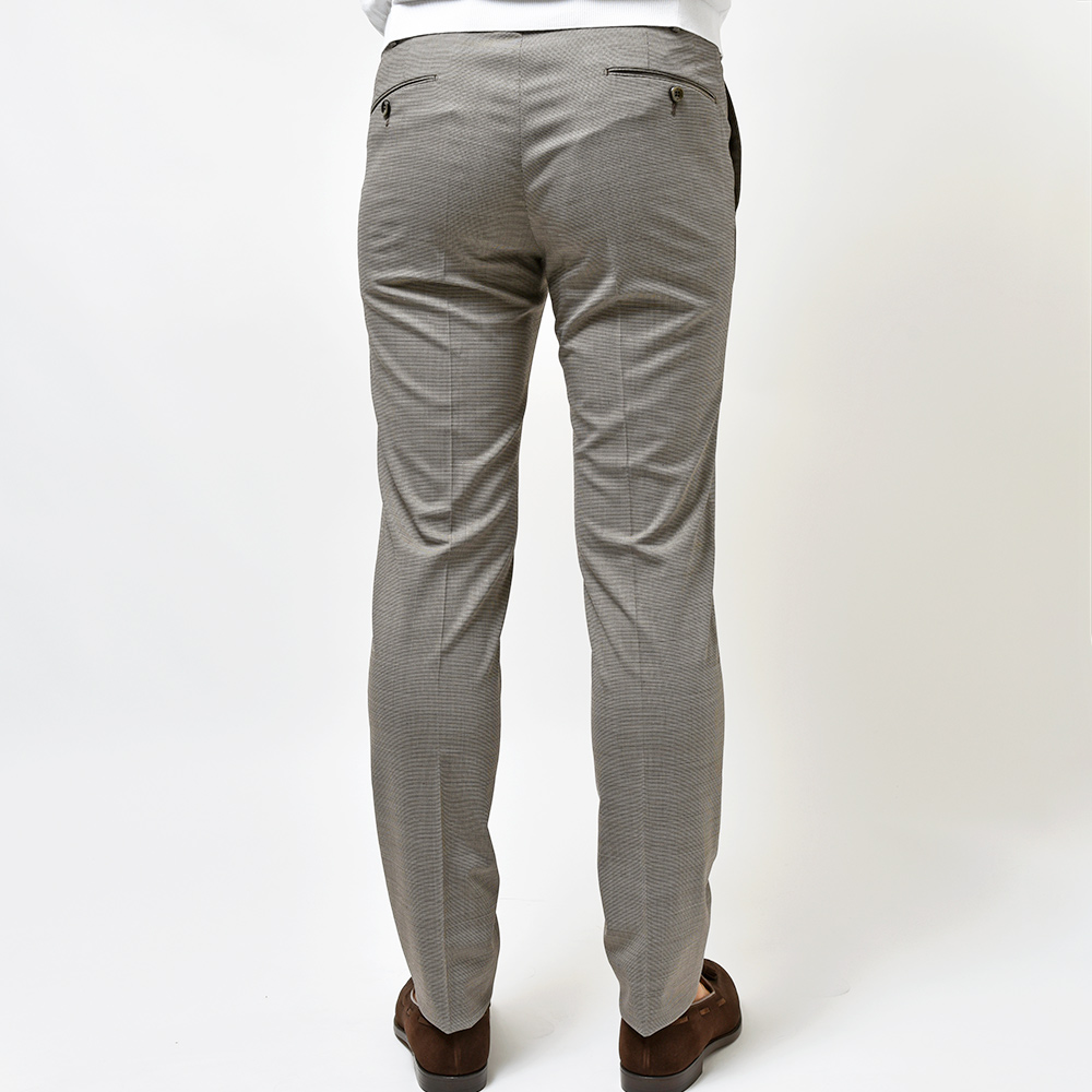 目付け260gの“WASHABLE STRETCH TECHNO FANCY WOOL”と名付けられたこちらは、一度穿くとやめられないビジネスパンツの金字塔”Travel”シリーズと同じ組成になります。言わずもがなのストレッチが効いたバツグンの穿き心地に、トロピカルウールのドライなタッチは蒸れる日本の風土にぴったり。使用されているポリエステルとウールの混紡素材は柔らかでシワになりにくく、立ったり座ったりを繰り返すビジネスシーンにおいて必須となる機能性。そして何よりも自宅で洗濯でき、アイロンをかける事でシワもスムーズに伸びるという、ビジネスマンの強い味方となってくれる一本です。