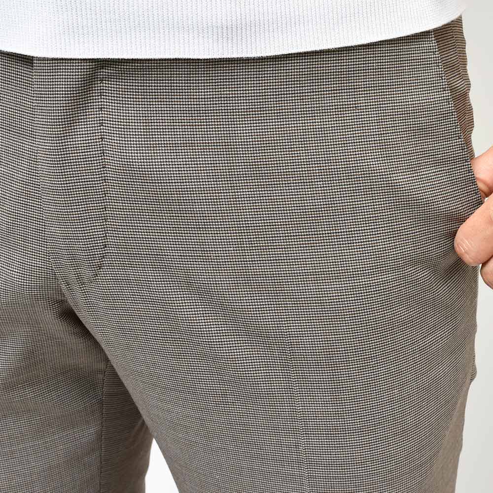 サイズ50がジャストサイズです。ウエストからヒップ・ワタリにかけてスッキリとしたフィッティングで見た目もシャープです。裾にかけてテーパードしたスリムなシルエットです。オンタイムにも活躍する小柄のハウンドトゥース、スッキリ着用するならコチラです!
