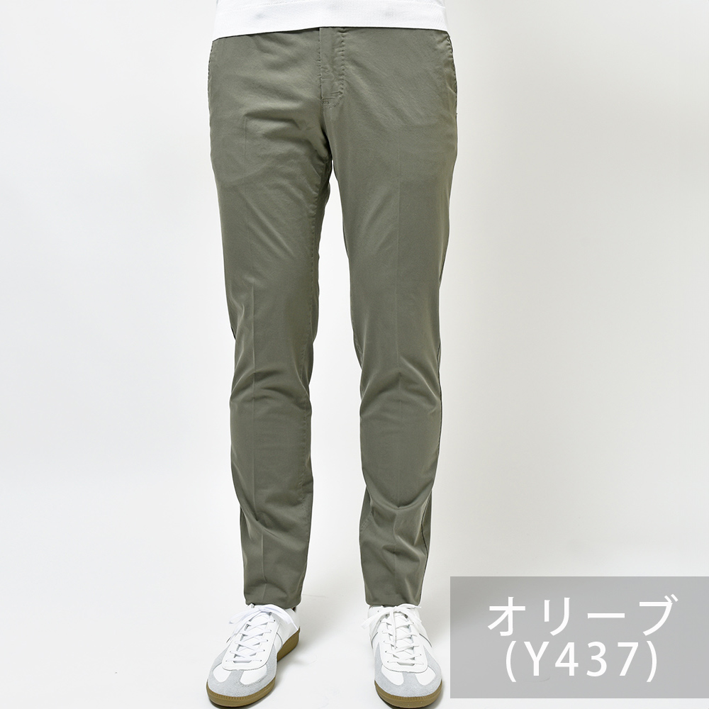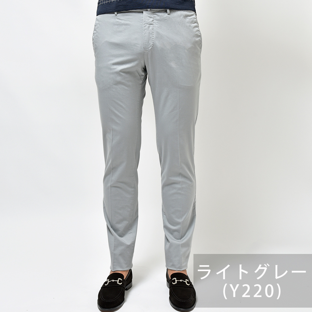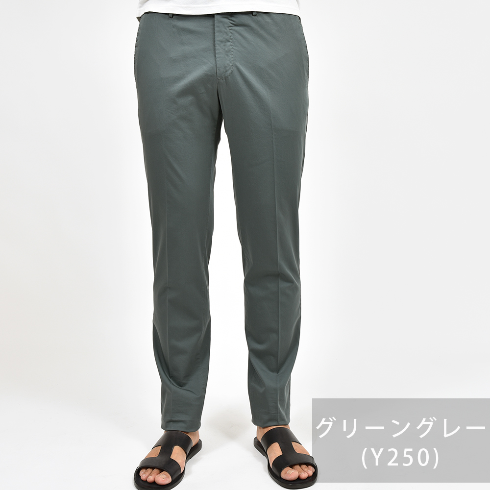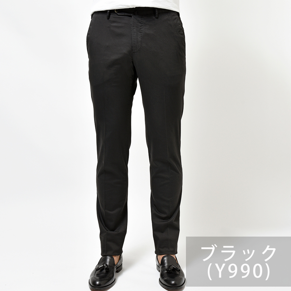 サイズ46でジャストサイズでした。ウエストはベルトが不要なぐらいジャストサイズでヒップもピッタリと収まります。細身ではあるもののストレッチ性能がストレスを感じない穿き心地。足元をスラリと見せてくれる美脚パンツです。春夏向けのコットンパンツはストレッチ入りで、PT TORINOでは不動の人気ファブリックです。