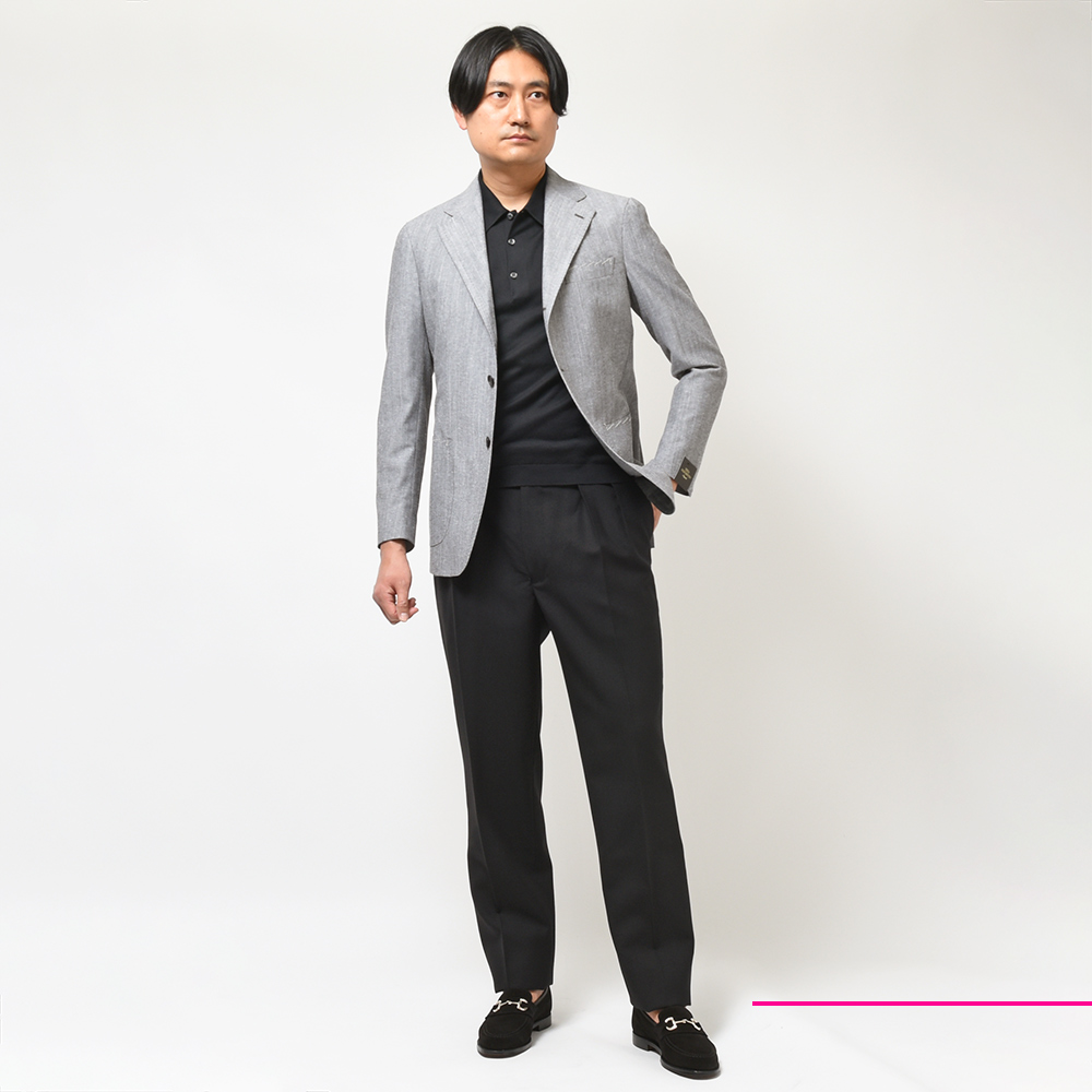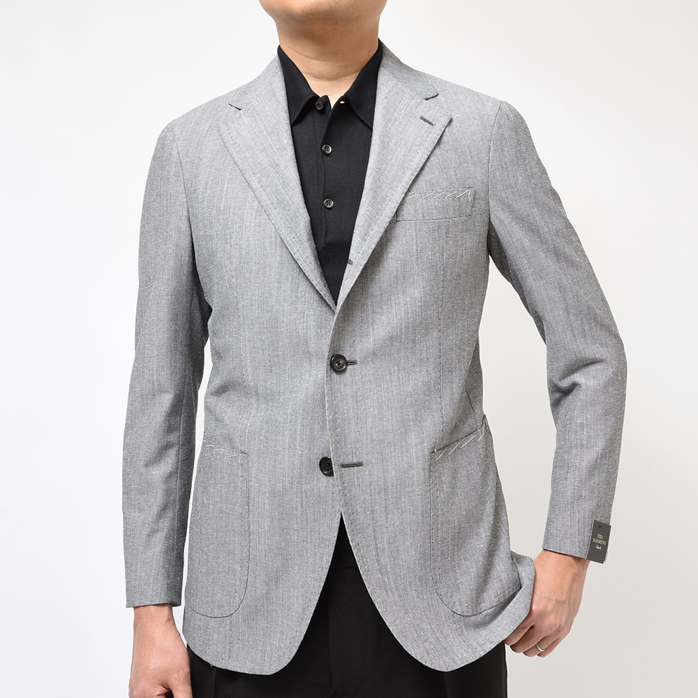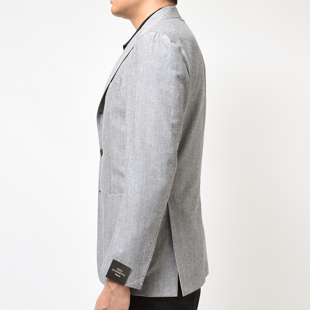 サイズ48がジャストサイズです。タイトすぎず、緩すぎずちょうどいいサイジングです。見た感じの雰囲気はスッキリとしています。爽やかでエレガントなライトグレーのシングルジャケットです!