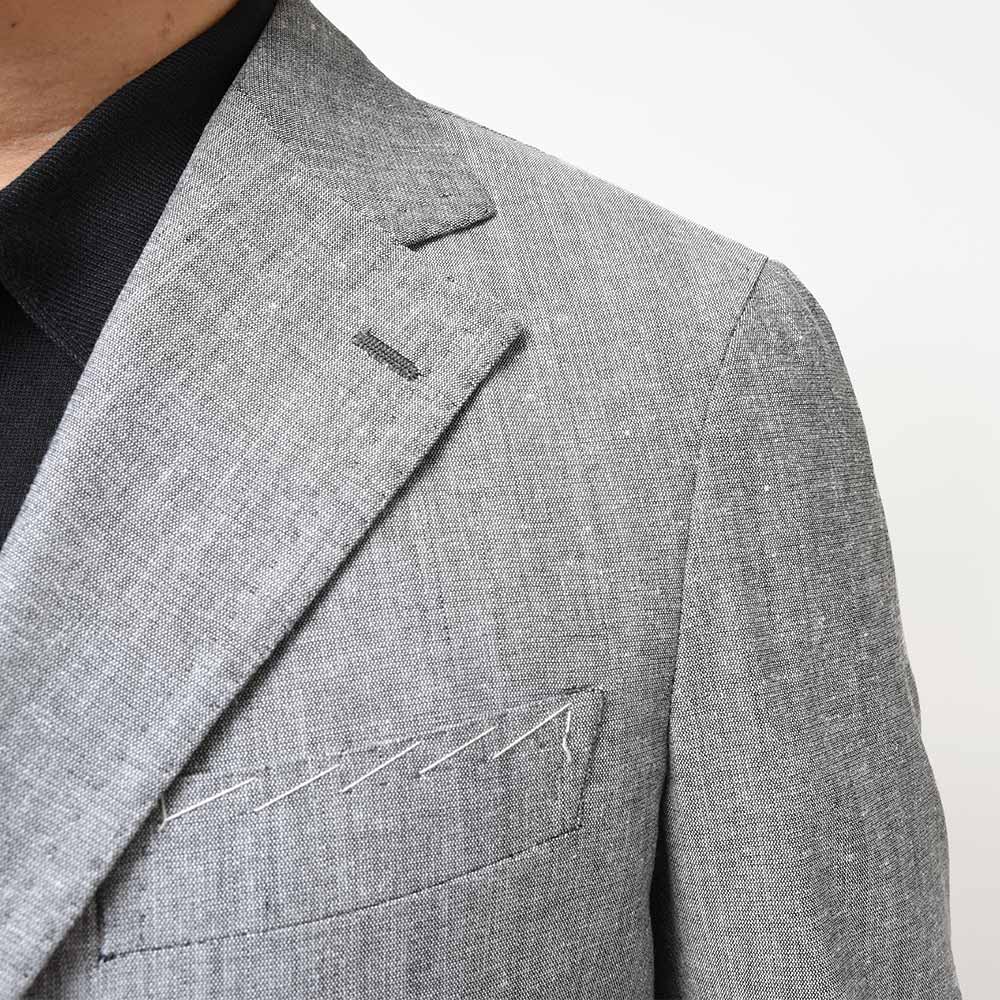 2パッチポケット、サイドベンツ、ラペル幅9.5cm、袖アンフィニッシュド(本切羽・開き見せなどの釦付け修理が必要)です。