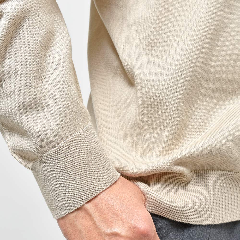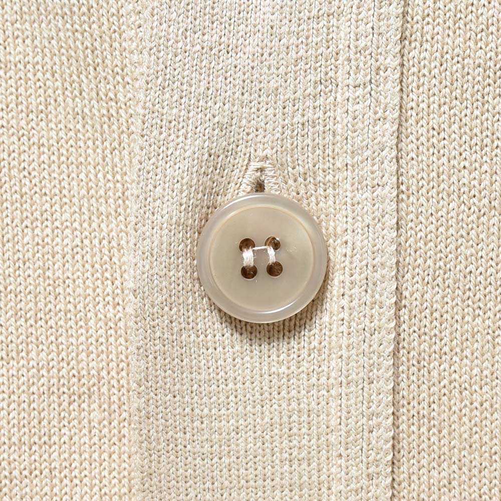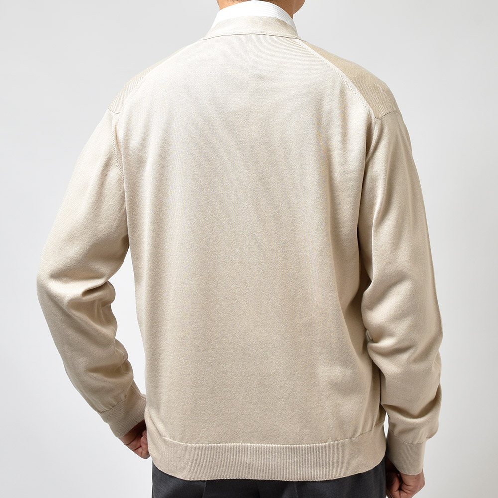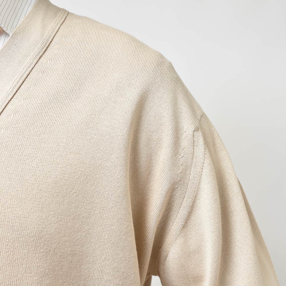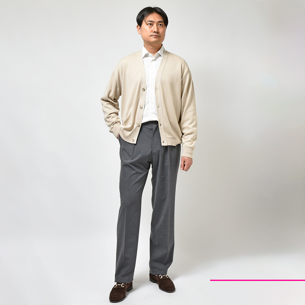 Sサイズを選びます。ややドロップショルダーで身幅にもゆとりがあります。リラック感あるシルエットがカーディガンと非常に良く合います。