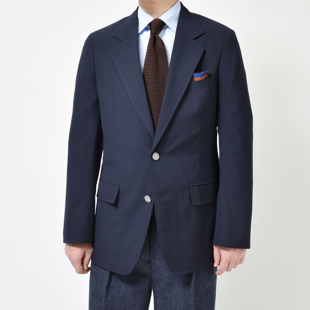 今シーズンよりスタートした“garou(ガロウ)”。その第一弾となるアイテムは、mandoの高巣満導氏によるブレザーになります。SUPER120'sウールを使用したポプリンは、ライトウエイトでサラリとした質感でありながらも、程よい艶を備えた上品な佇まい。ネイビージャケットでは定番のホップサックやギャバジンとは明らかに違った雰囲気を醸し出します。低いゴージ位置に、やや緩めのウエストがリラックス感のあるムードを薫らせてくれる、肩肘張らずにサラリと気軽に羽織りたい一着です。