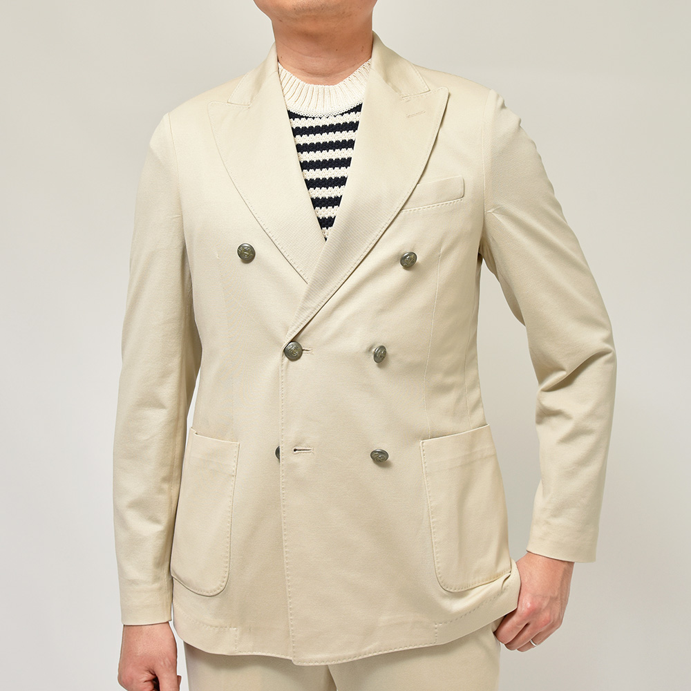 サイズは48でジャストサイズです。肩まわりとダキがタイトですが、伸縮してくれるのでノンストレスです。ボディはちょうどいいサイジングです。トラディショナルな雰囲気漂うダブルブレストブレザーです!