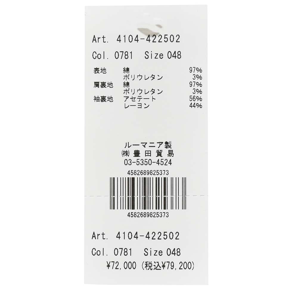 サイズ48でインナーにミドルゲージニットを着て、肩周りはタイトなサイズ感で身幅は細すぎないスッキリとしたシルエットです。肩周りはやや細いですが、ジャージーなので窮屈感はありません!