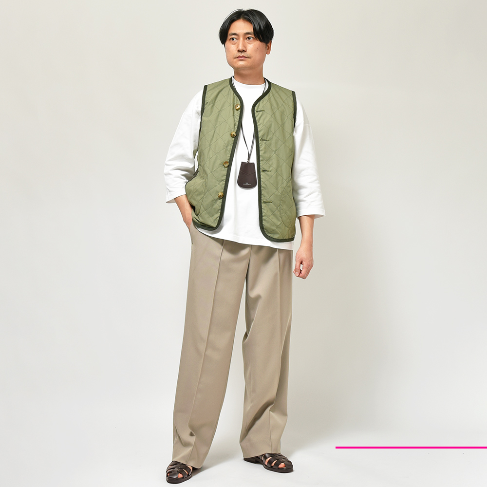 カットソーやニット一枚では寂しいという時のスタイリングや、秋口にはアウターのインナーとしても重宝すること間違いのない一着です。