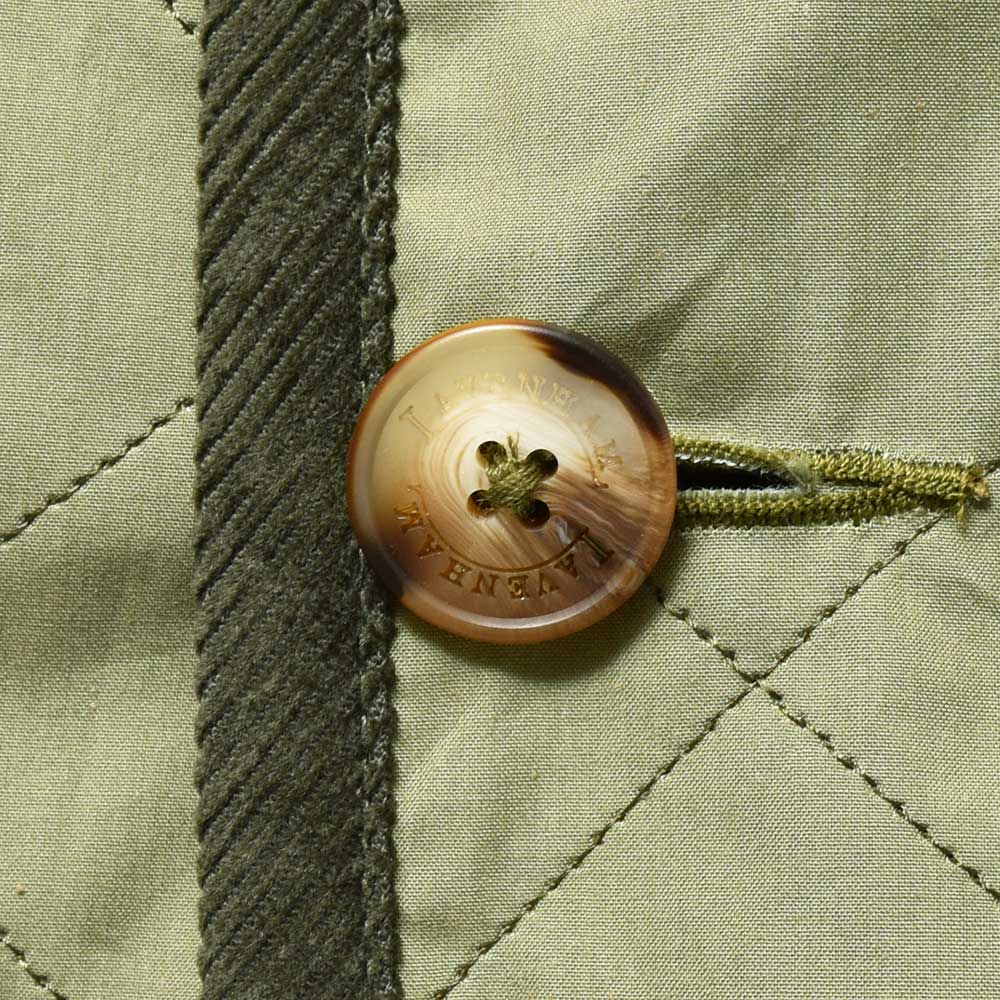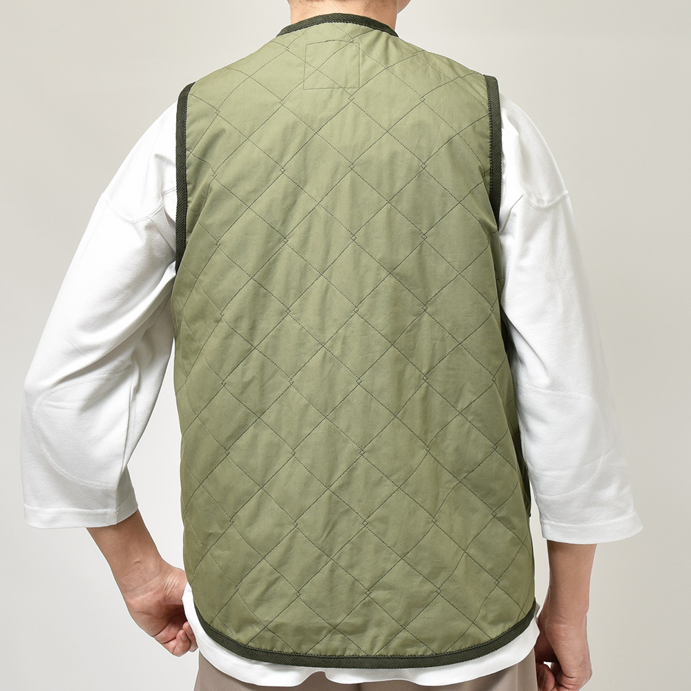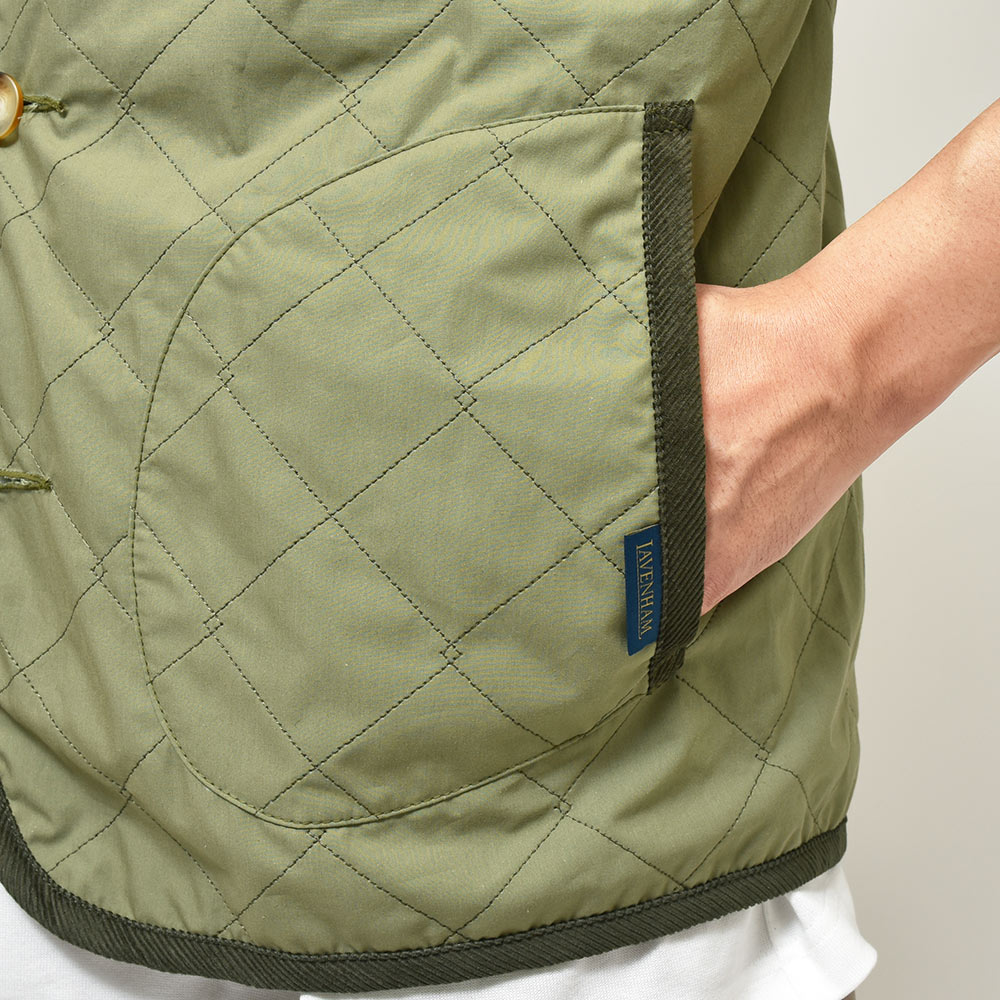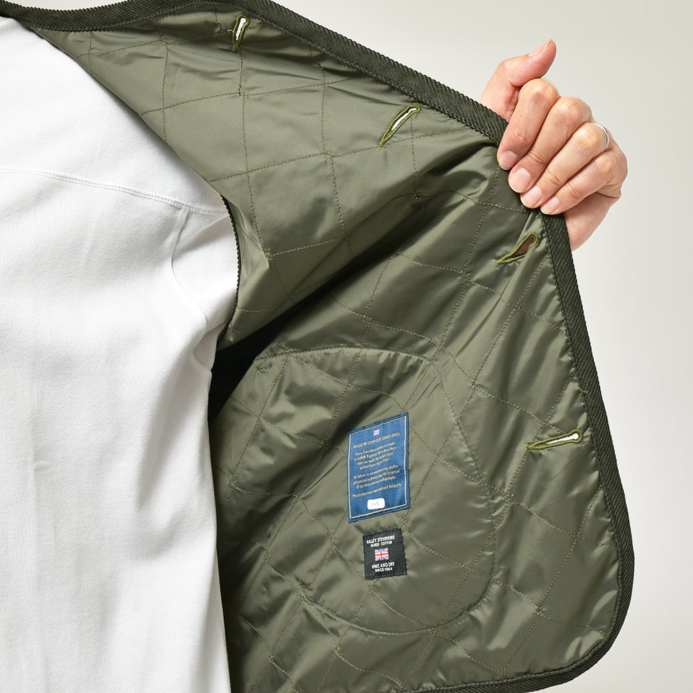 スコットランドの“ハリー・スティーブンソン社”から調達した、丈夫で耐久性のあるドライワックスコットンを使用した、中綿のないアンワディッドジレ。軽量でありながらも通気性にも優れ、さらには撥水性をも持つ高機能アイテムになります。裏地には、LAVENHAMの定番素材であある、リサイクルポリエステル生地のラブンスターを使用しています。