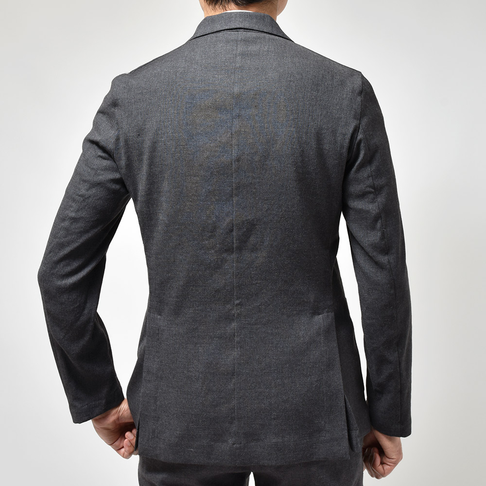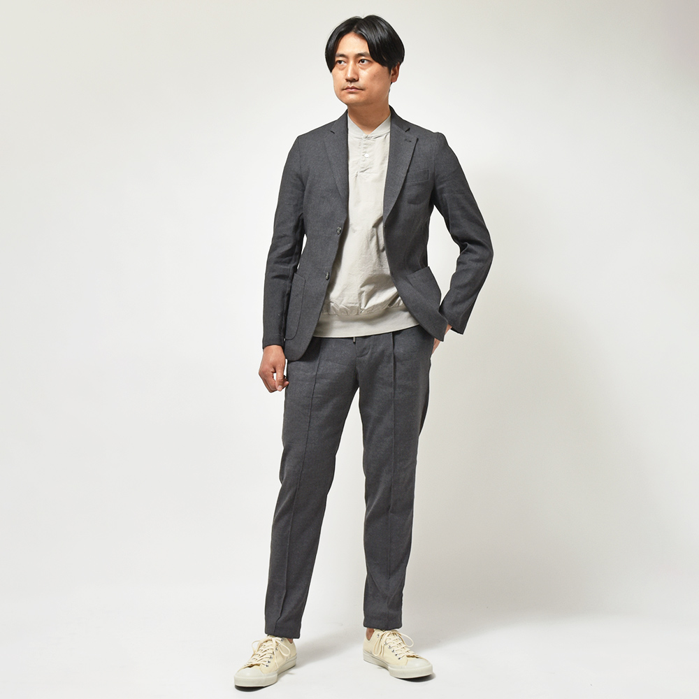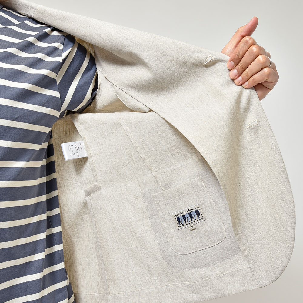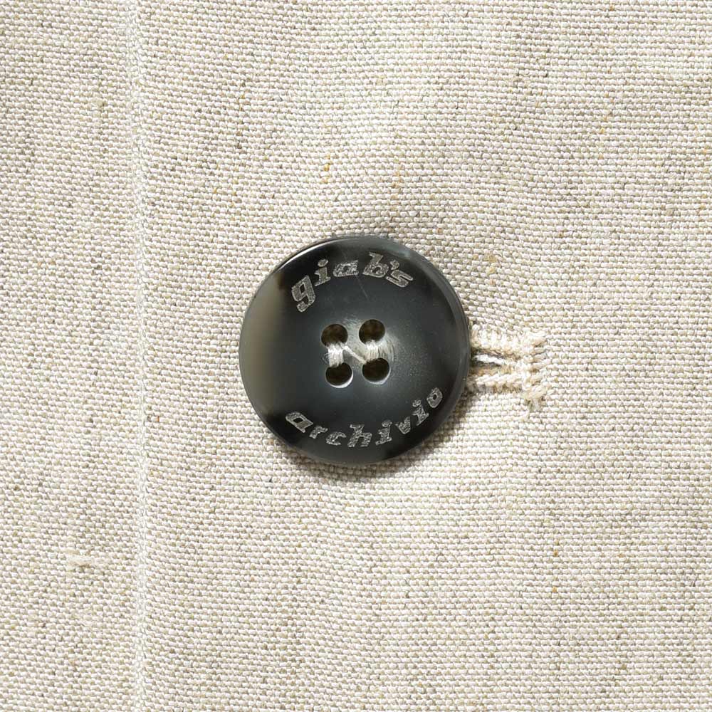 giab's ARCHIVIOのジャケットラインのモデル“STROZZI(ストロッツィ)”。イージーなパンツを得意とするブランドですので、ドレスライクなジャケットではなく、アンコンで裏地もない筒袖仕上げで、ややボックスシルエットという、あくまでも気軽に羽織れる仕上がりとなっています。しかしながら、現代の実情を見ているとこのくらいのジャケットで十分というシーンはよくある事ですので、デザイナーの中新井氏らしい痒い所に手が届く一品です。