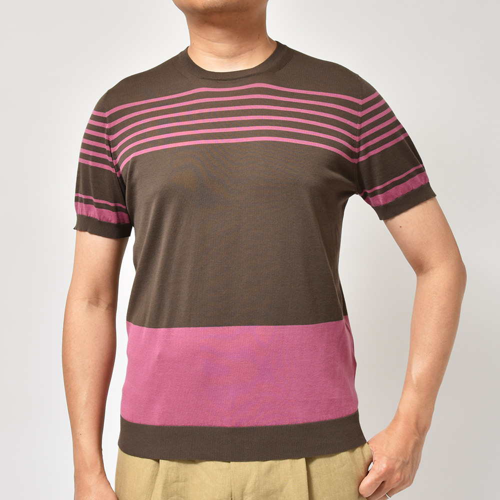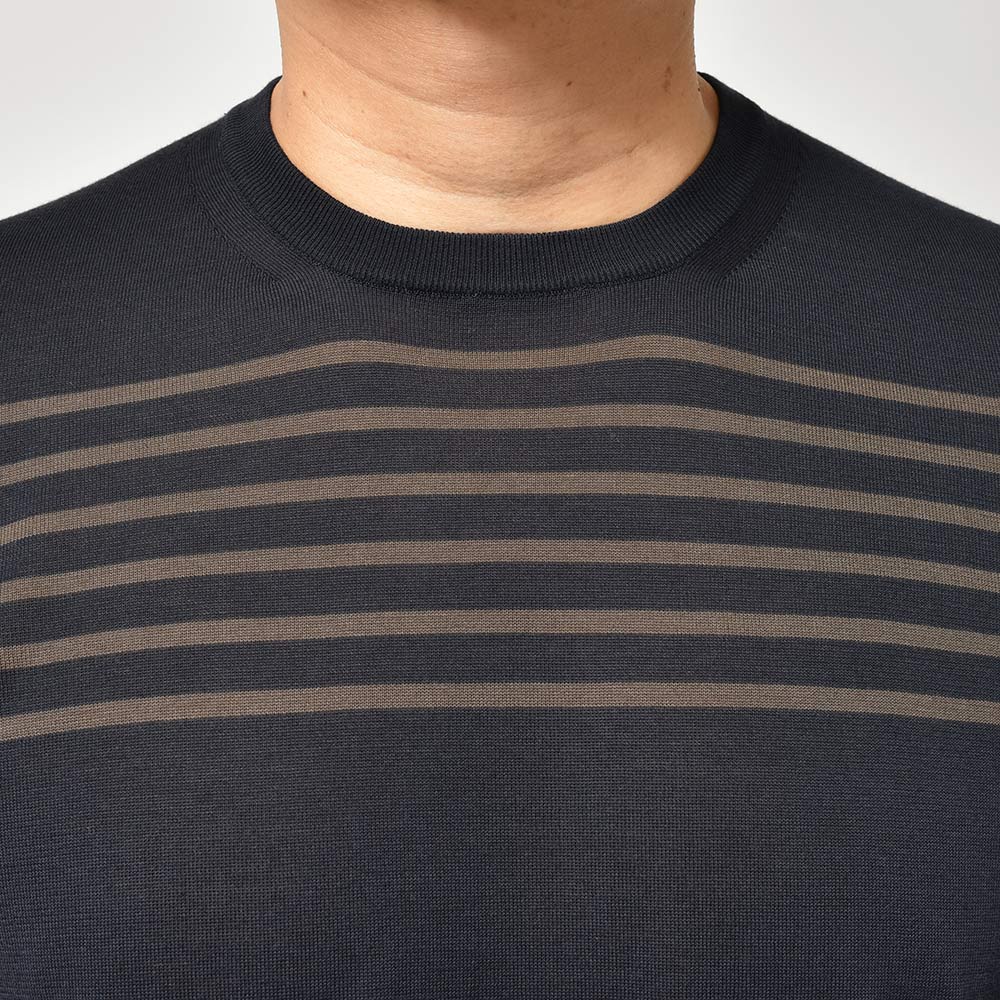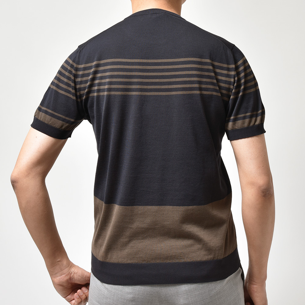少しドライなタッチで編み上げたハイゲージニットは、カットソーのような感覚で着用できる一枚。変則的なボーダーは一枚で着ても華やかさがあり、またインナーに使用することでスタイリングに程よいアクセントが生まれます。