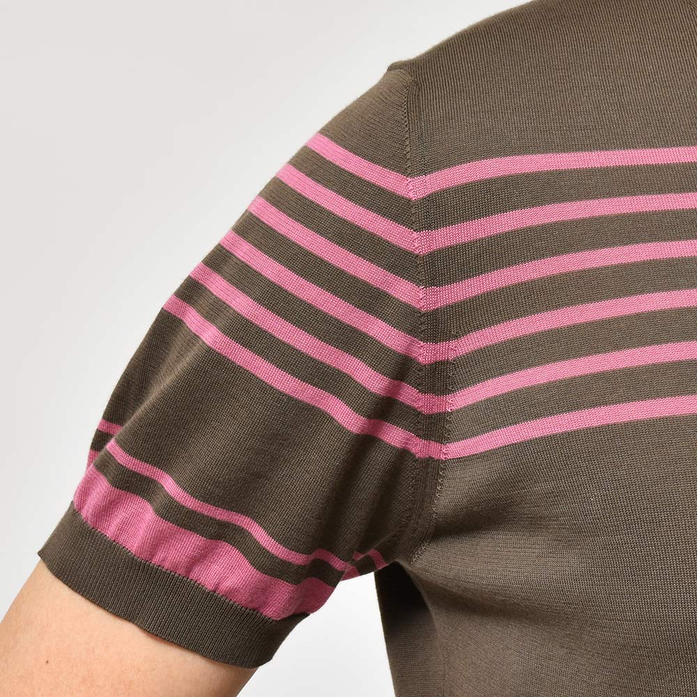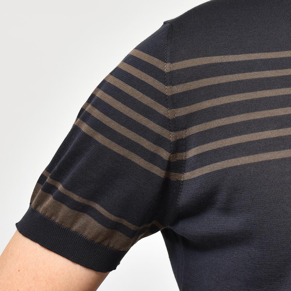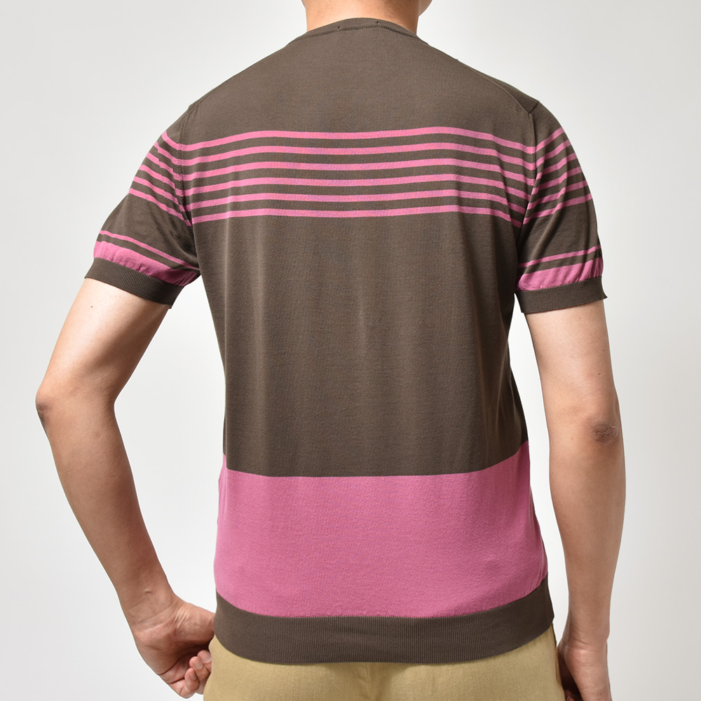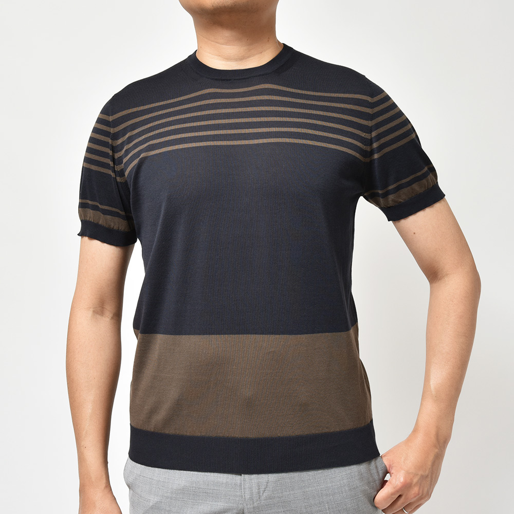 少しドライなタッチで編み上げたハイゲージニットは、カットソーのような感覚で着用できる一枚。変則的なボーダーは一枚で着ても華やかさがあり、またインナーに使用することでスタイリングに程よいアクセントが生まれます。