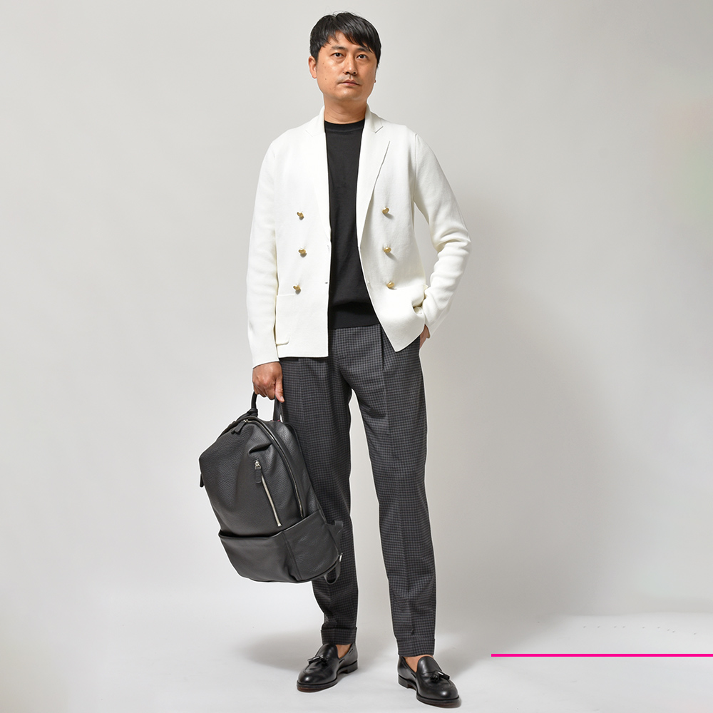 サイズ48でインナーにハイゲージニットを着て、肩幅・身幅共にピタピタにならない、少しだけゆとりのあるシルエットといった印象です。トレンドの流れを考えてもピチッとしたシルエットにならないサイズ48がベストサイズです!
