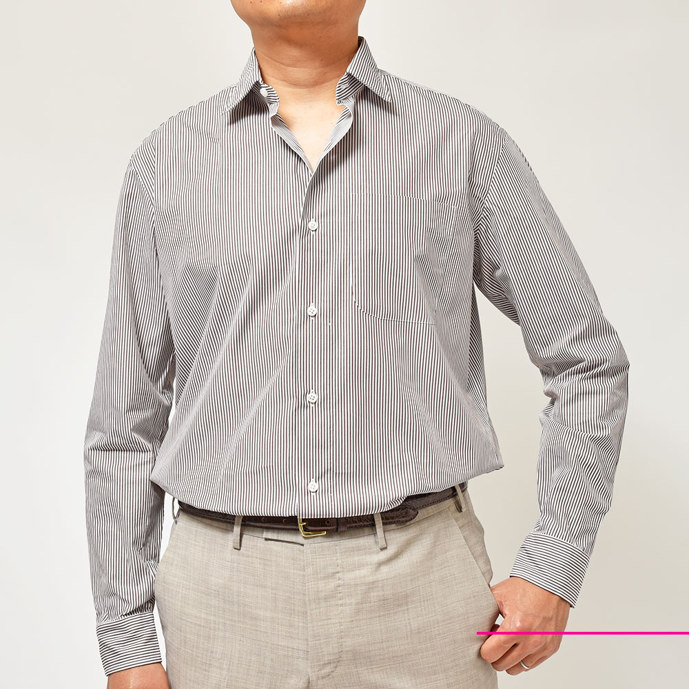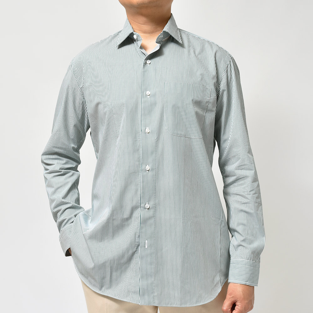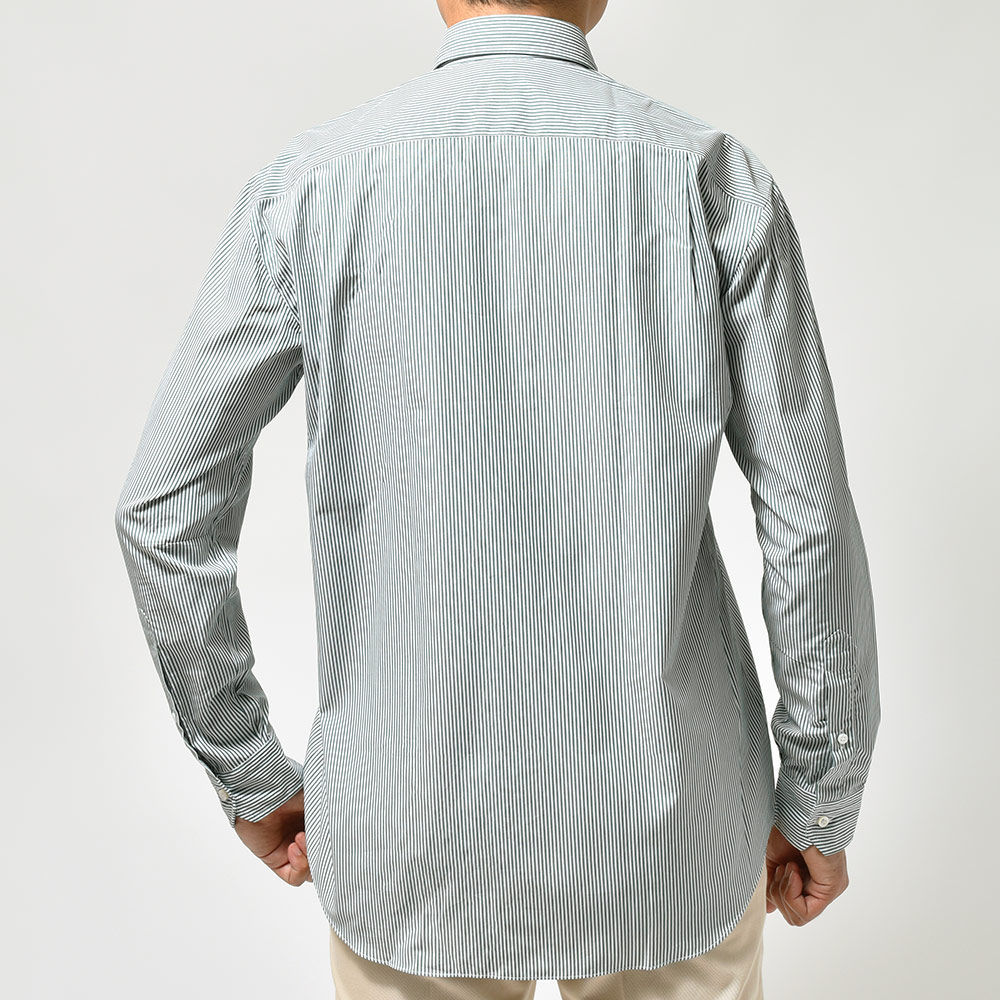 80〜90年代のアルマーニからインスピレーションを受けたモデル“ALBERTO(アルベルト)”。ややゆったりめなサイズバランスに、ボタン・アーム・裏前立て・ガゼットの4箇所ハンドで仕立てられています。生地は程よくハリがありつつも、しなやかなブロードを使用。ピッチの狭いストライプがモダンな印象を作り上げます。