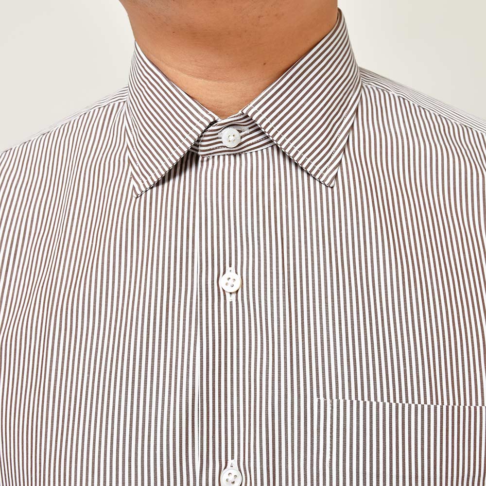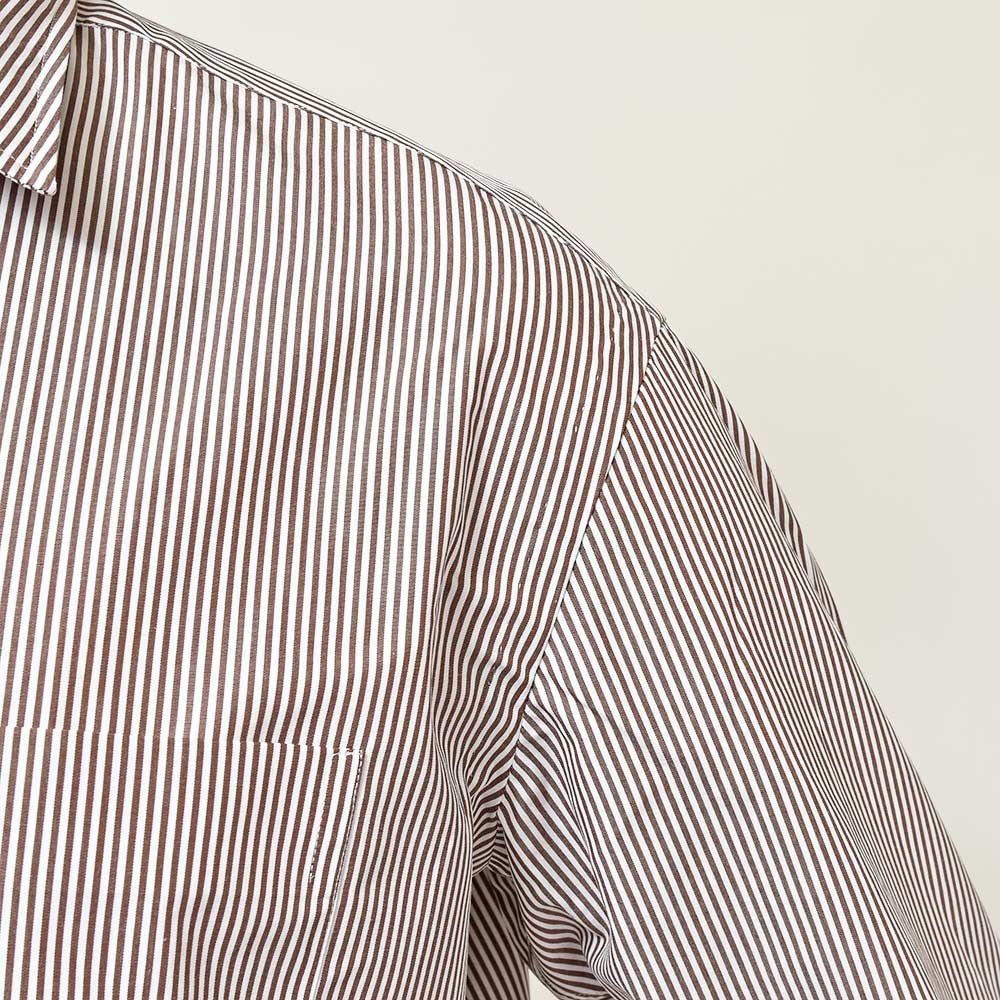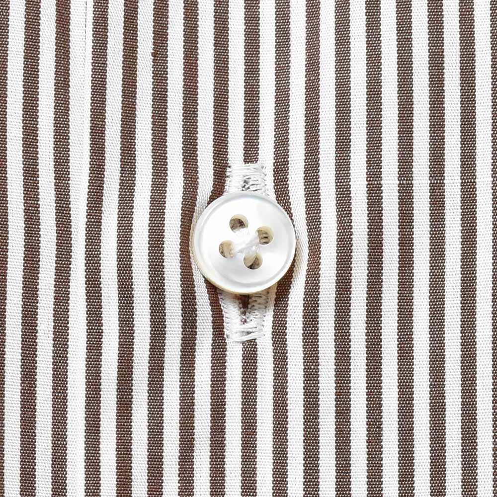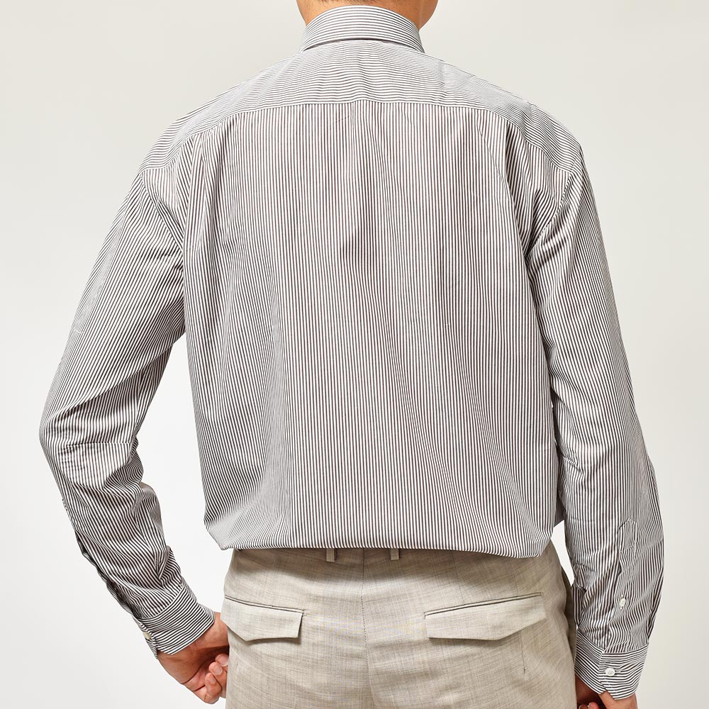 80〜90年代のアルマーニからインスピレーションを受けたモデル“ALBERTO(アルベルト)”。ややゆったりめなサイズバランスに、ボタン・アーム・裏前立て・ガゼットの4箇所ハンドで仕立てられています。生地は程よくハリがありつつも、しなやかなブロードを使用。ピッチの狭いストライプがモダンな印象を作り上げます。