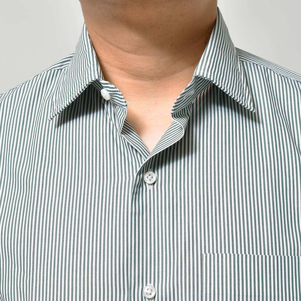 サイズ41でジャストサイズです。ネックはちょうど指一本入るくらい余裕があります。ボディはゆったりしていてリラックス感があります。細かいストライプが使い勝手の良さそうなシャツです!