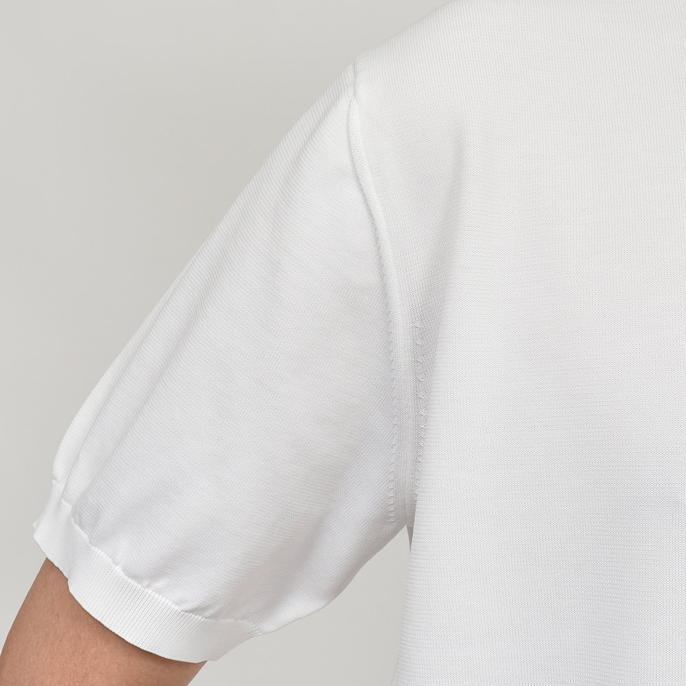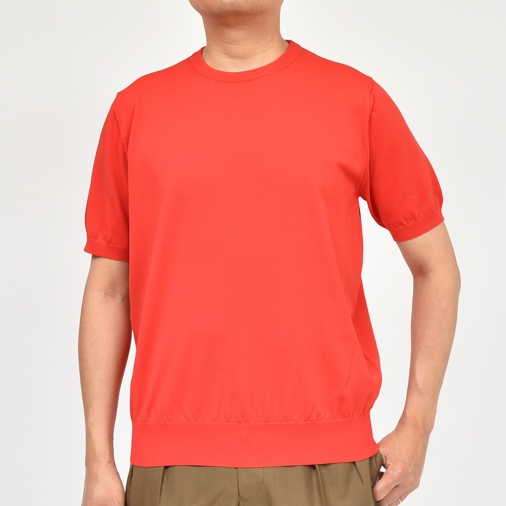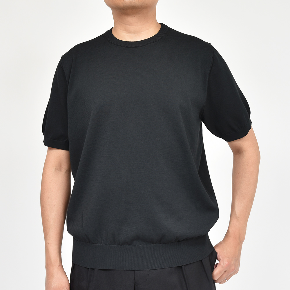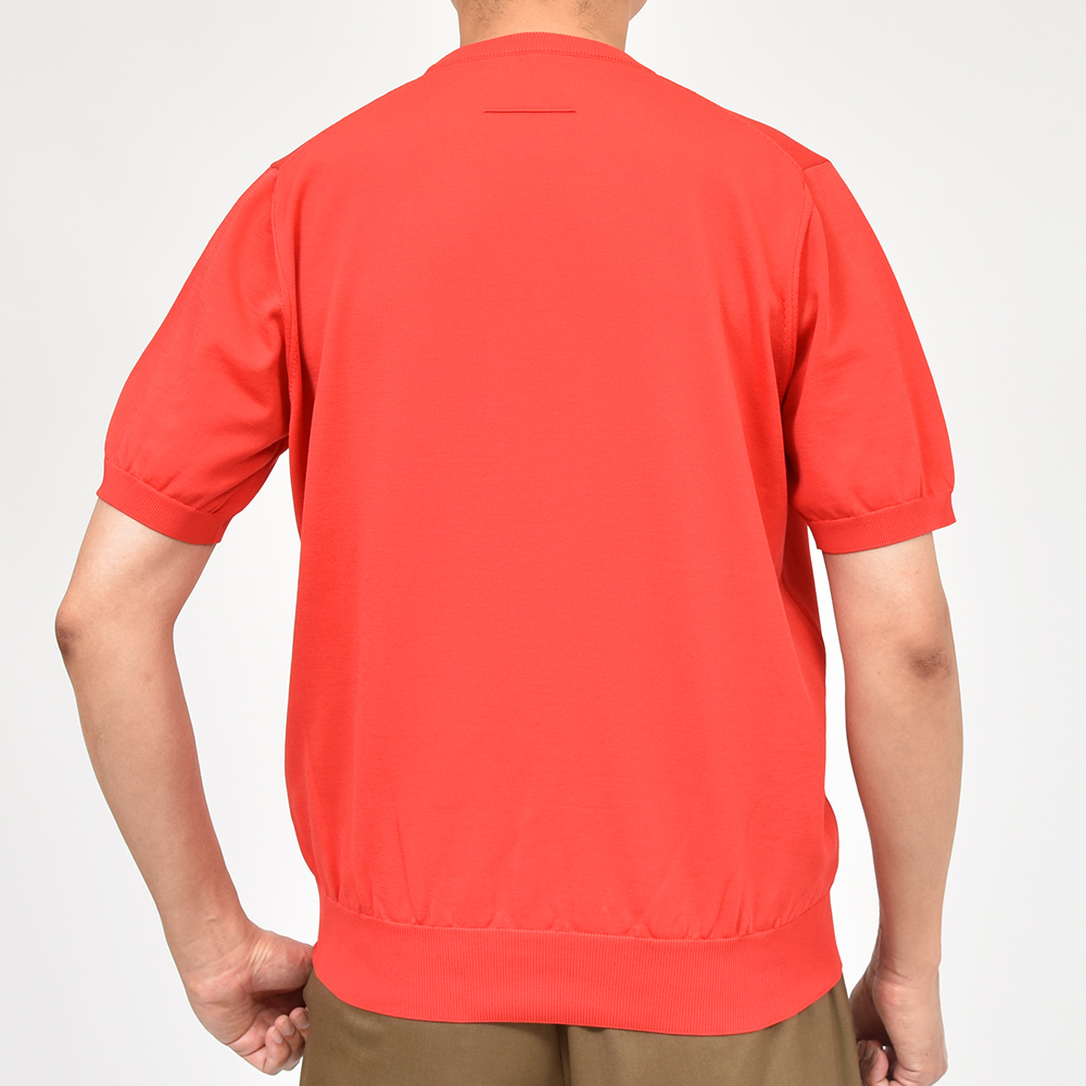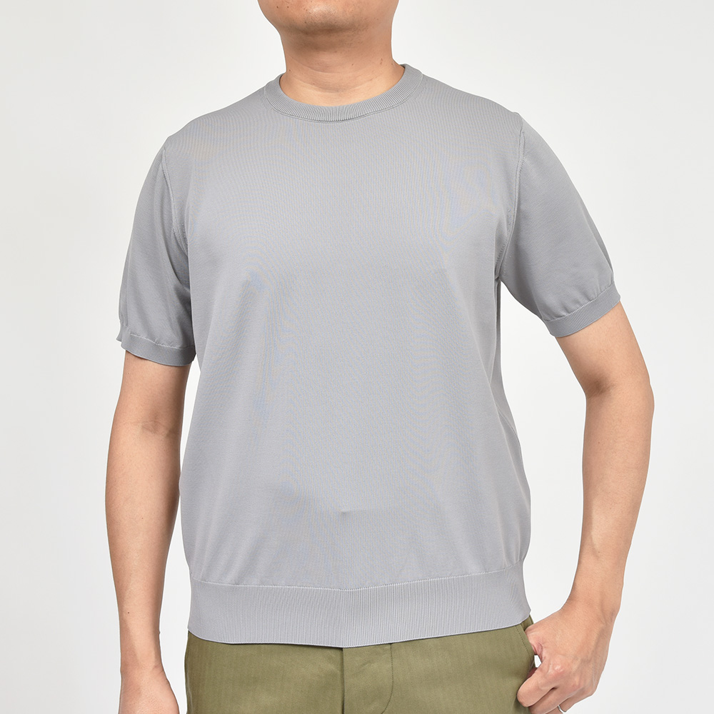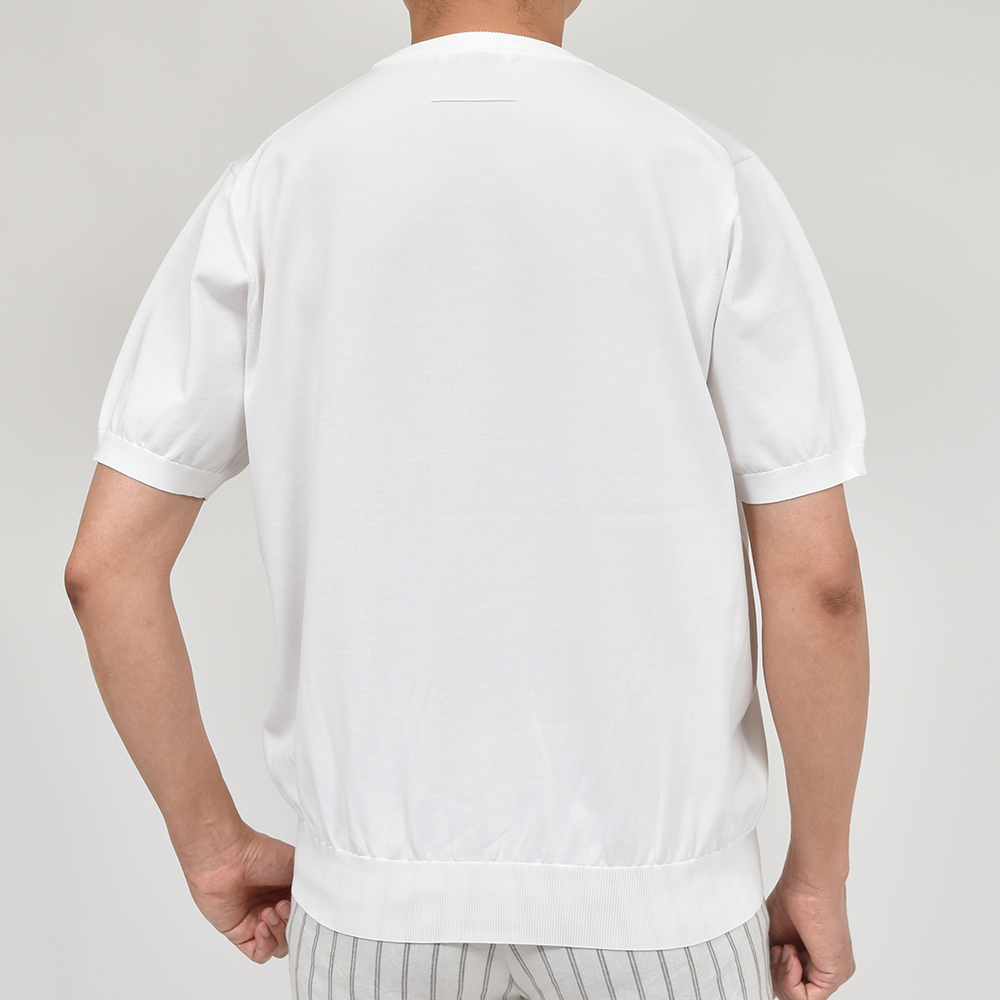 二重臼天竺編みという特殊な技法で編むことで、表は銀イオンを糸に練り込んだ抗菌・防臭・速乾性に優れた張りのあるタッチのポリエステル糸、裏はキュプラ×コットンを用いた肌触りの良い素材を使用した、18ゲージのクルーネックニット。また、細過ぎず太過ぎないSLOANEらしい絶妙なシルエットはユニセックスで着用することができ、普段のコーディネートに重宝するような非常にベーシックなアイテムになります。