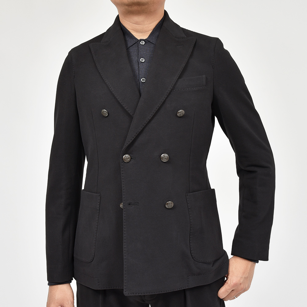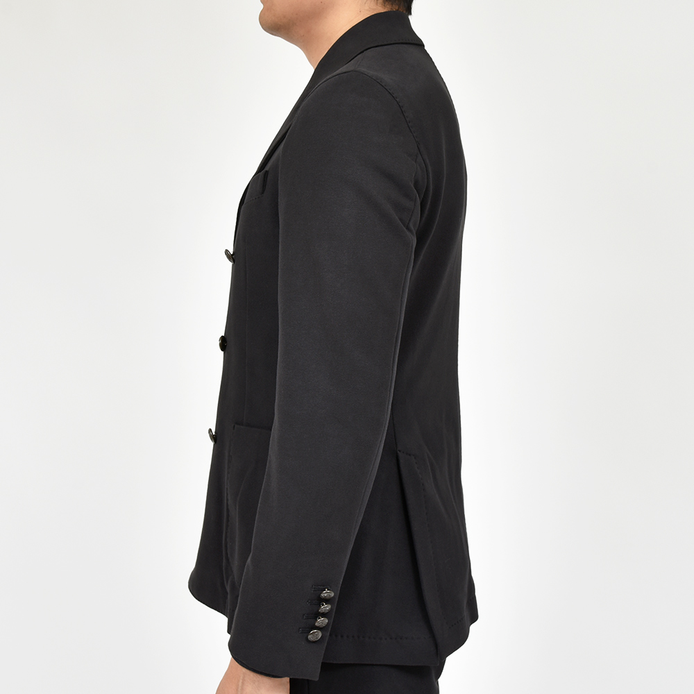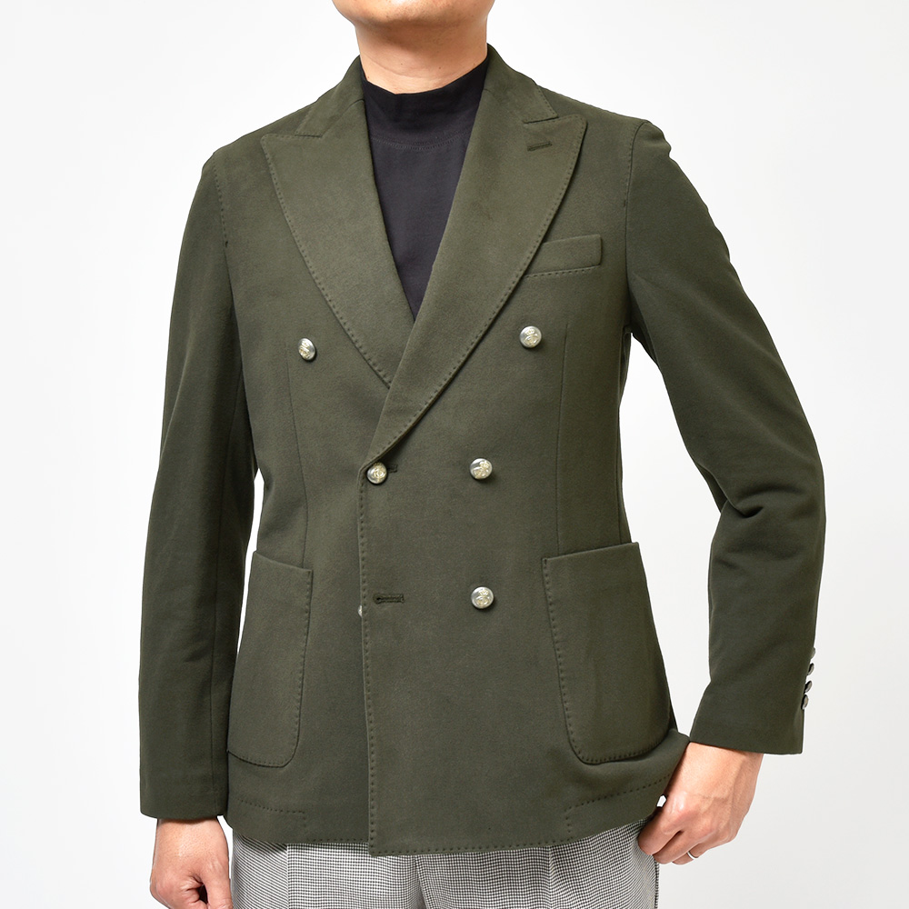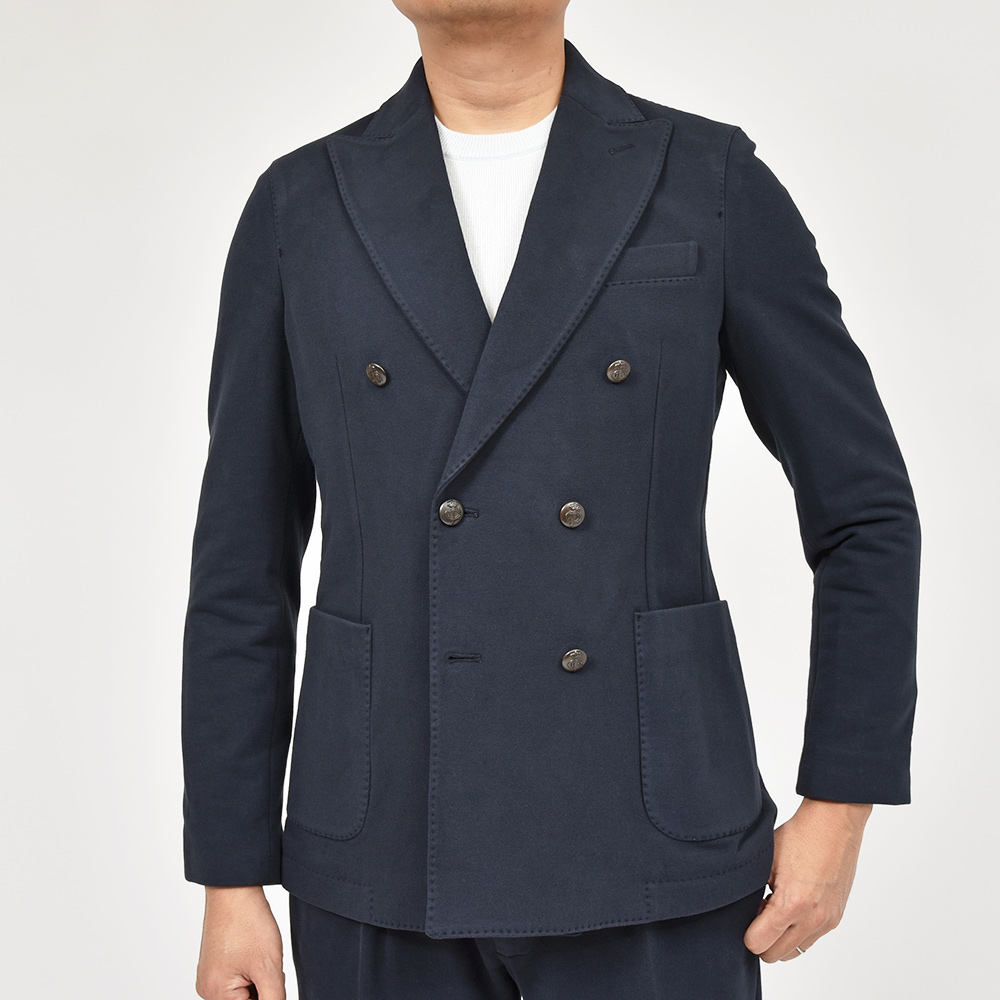 サイズは48でジャストサイズです。肩まわりとダキがタイトですが、伸縮してくれるのでノンストレスです。ボディはちょうどいいサイジングです。メタルボタンが新鮮なジャージーダブルブレストジャケットです!