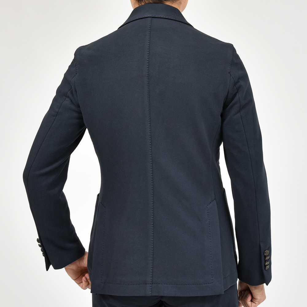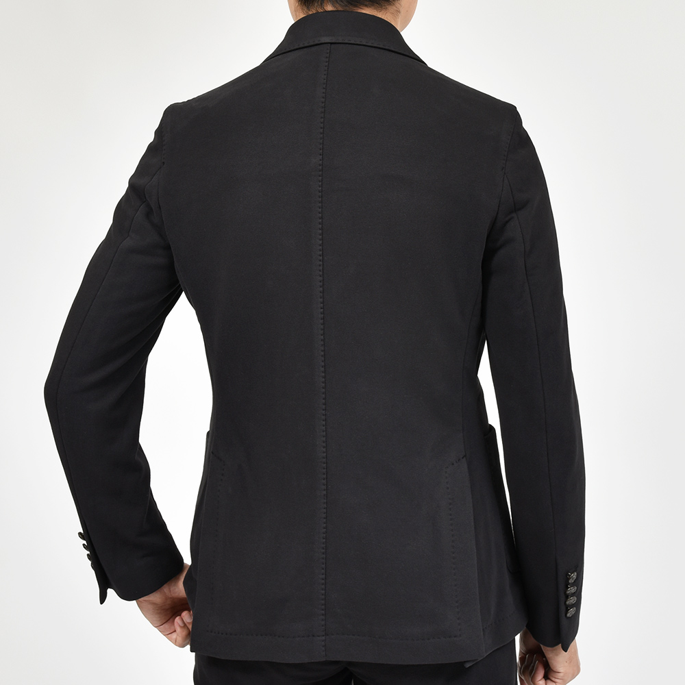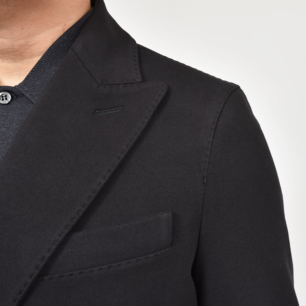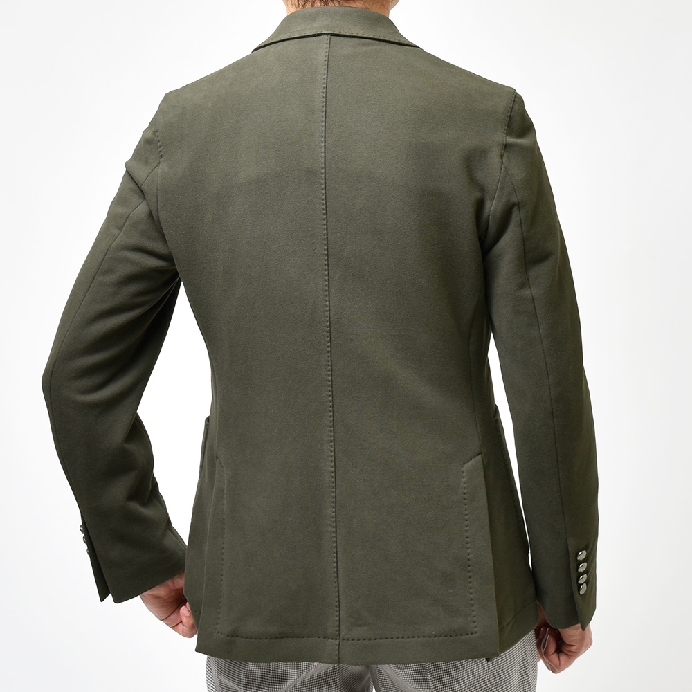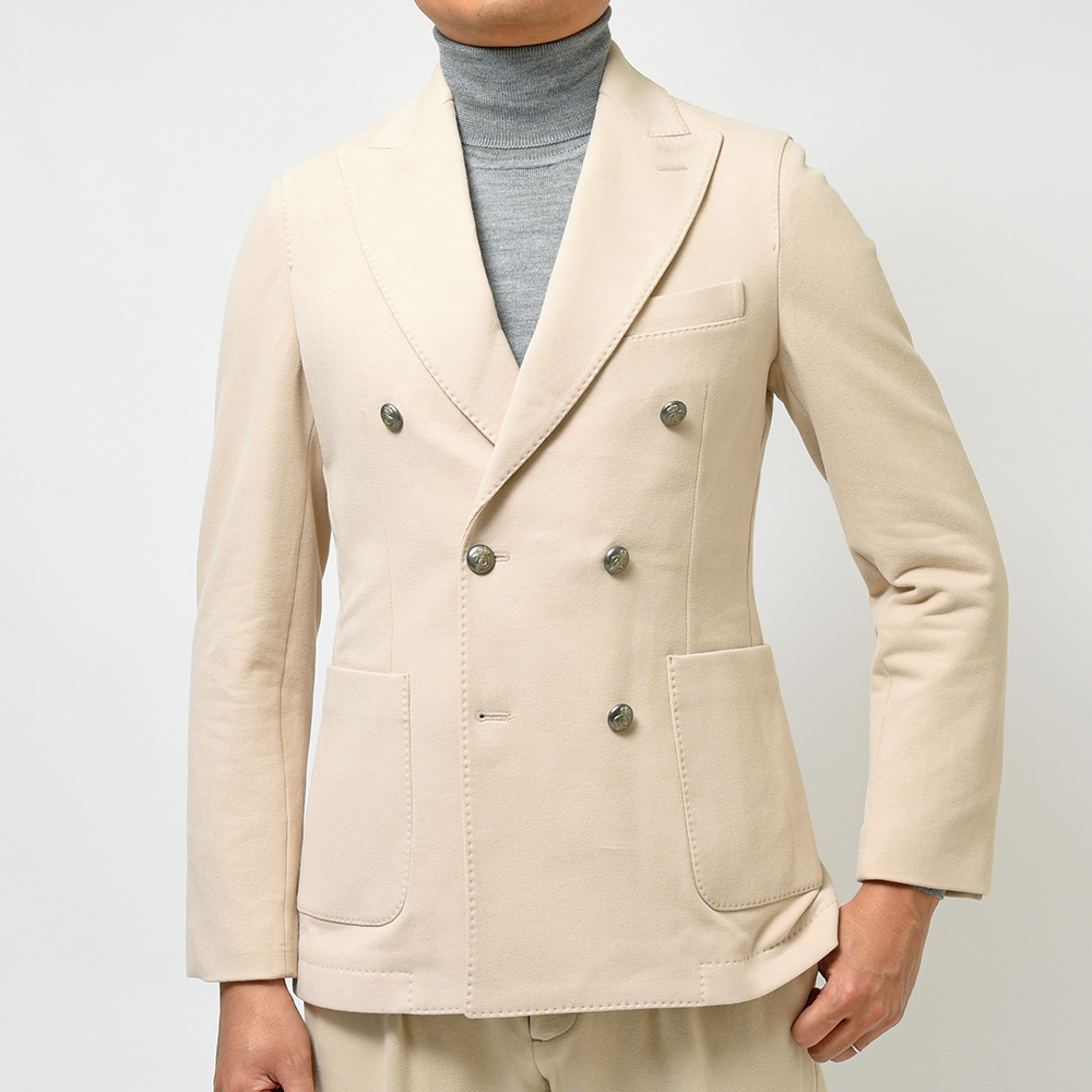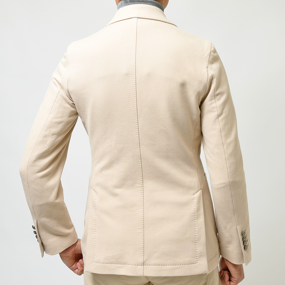 少し起毛感を持たせたコットンジャージー素材は、ふんわりと柔らかく上品な素材感の雰囲気が一見するとカシミヤのような風合い。生地に表情が加わるという事は、シンプルなスタイリングであっても良い塩梅にキマってくれるという副産物をもたらせてくれます。程よくタイトなシルエットに、メタルボタンを使用したブレザーによって、スタイリングをよりファッショナブルなものへと変えてくれます。