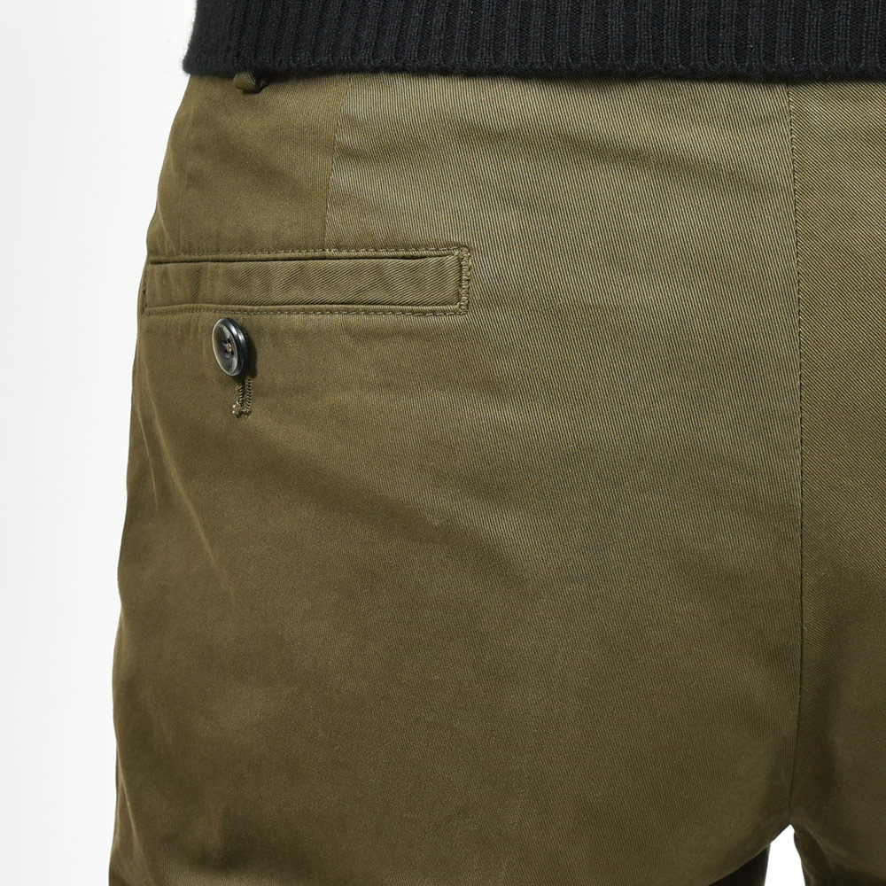 目付け340gの製品洗いをかけたコットンストレッチ素材は、PT TORINOのロングセラーである定番のチノクロスになります。細畝のツイル織りがカジュアルでありながらも上品さとエレガンスを感じさせる、これぞPT TORINOと言える要素が詰まっています。コチラは起毛感を抑え、厚すぎず薄すぎない生地感になりますので、ロングシーズンでの着用が可能となります。
