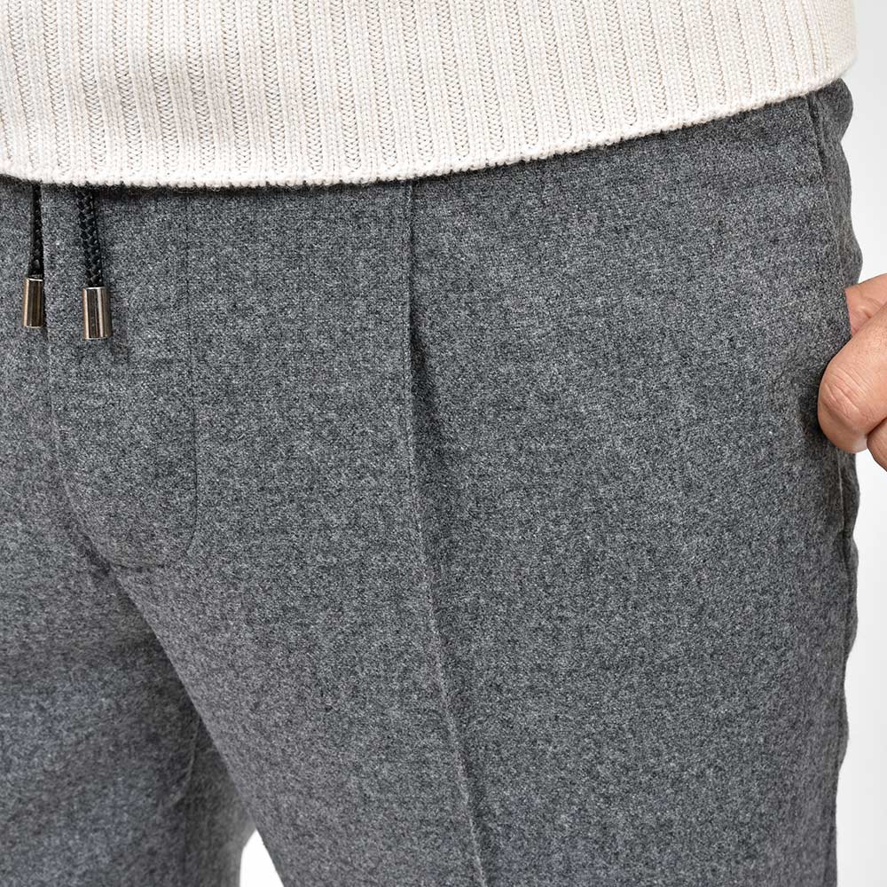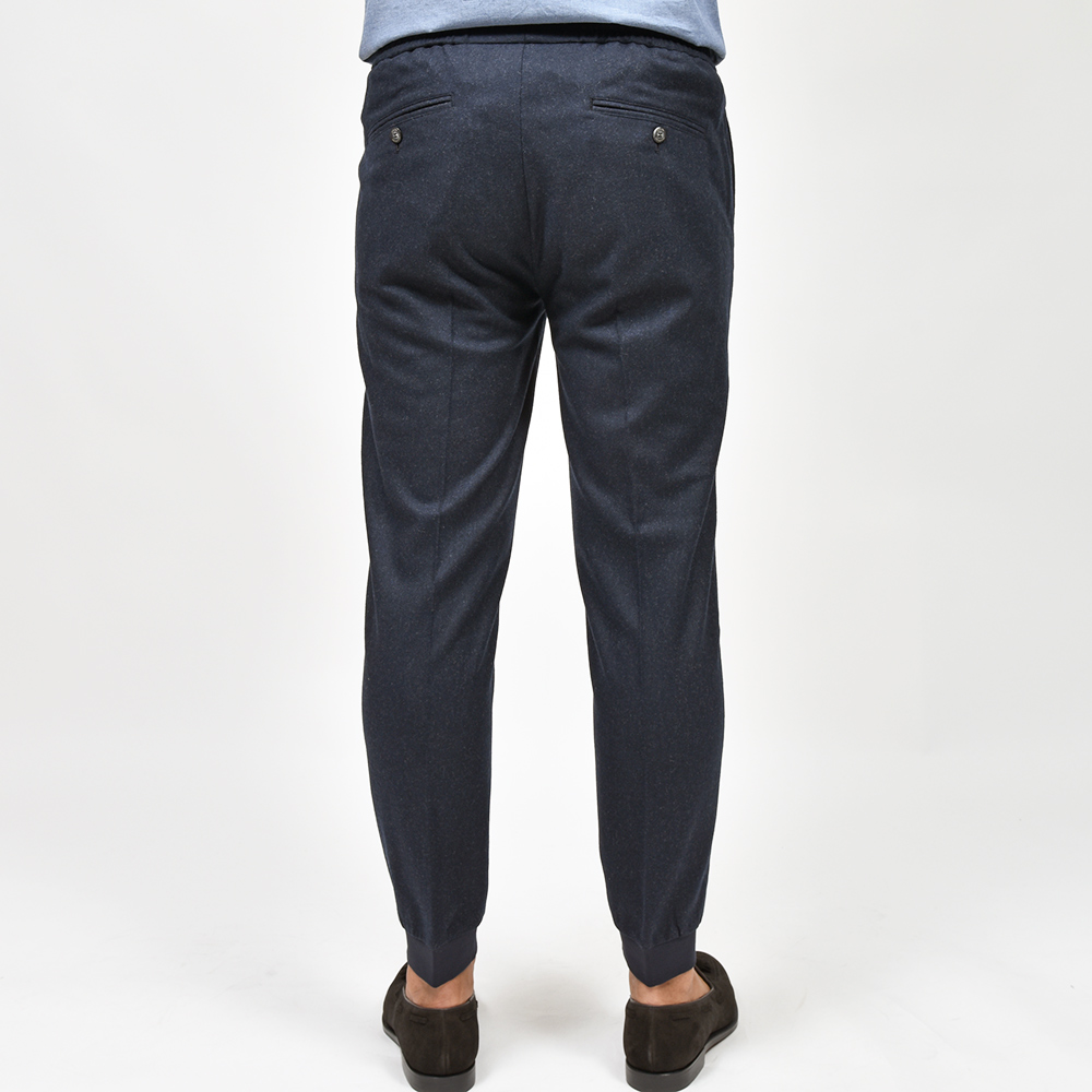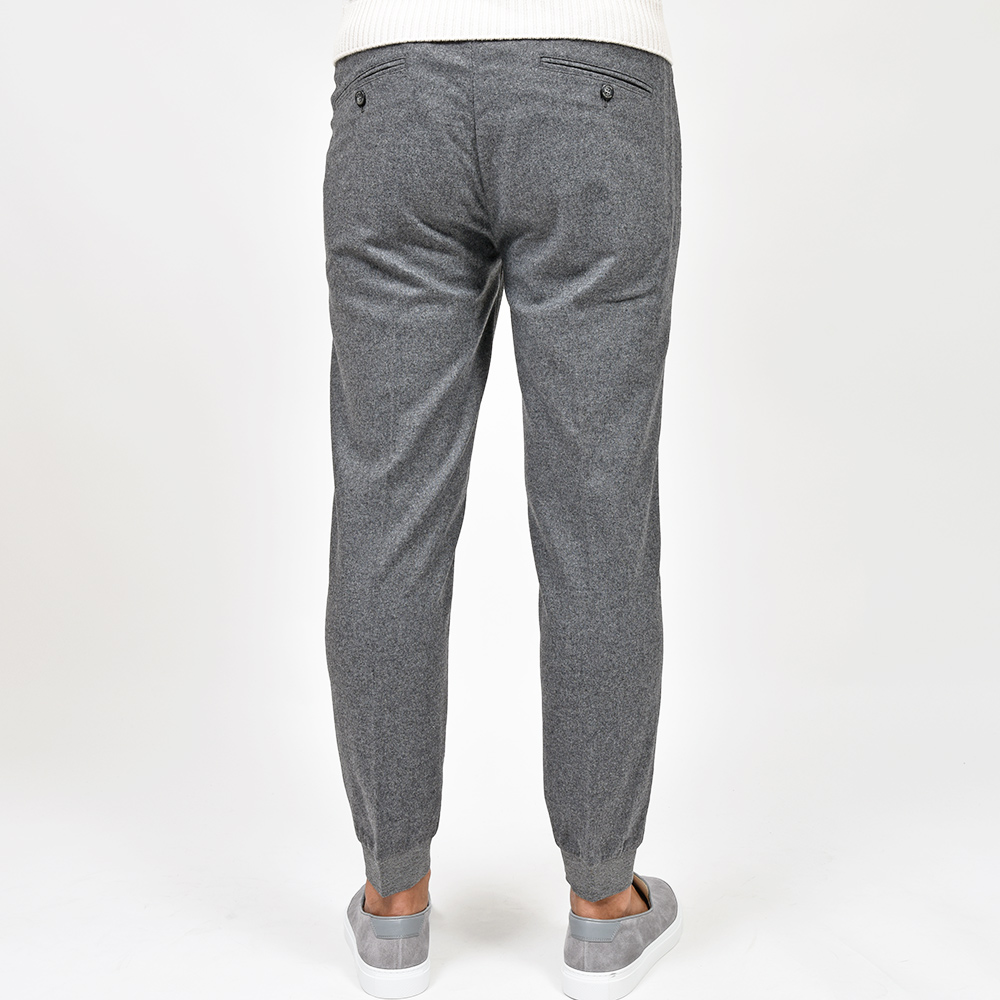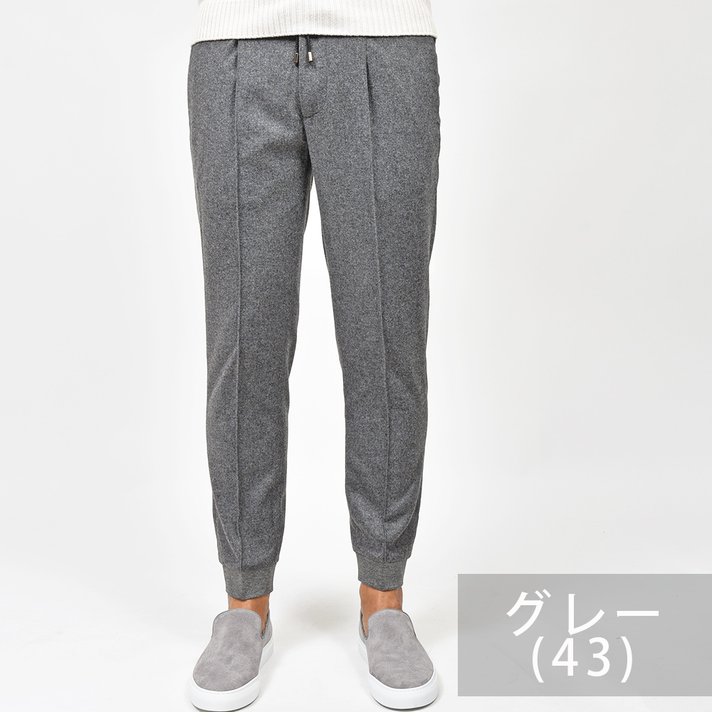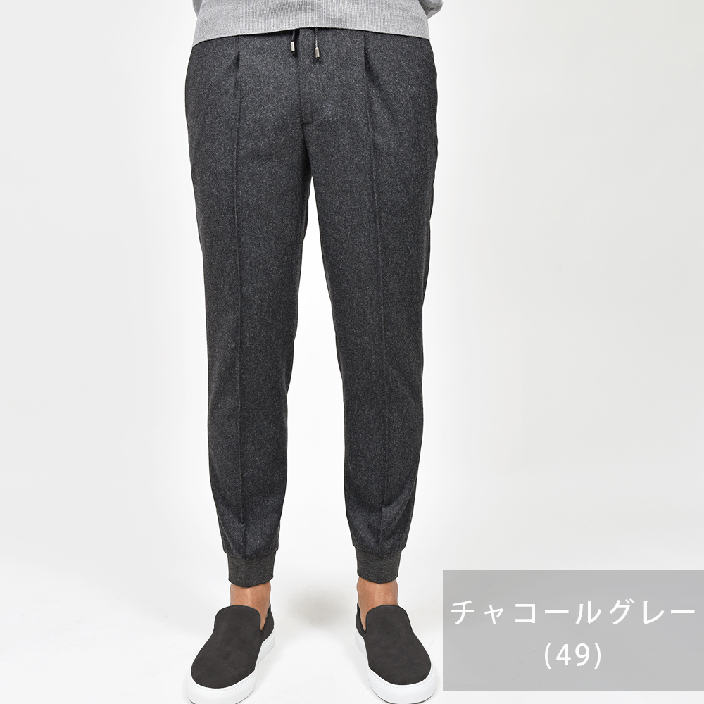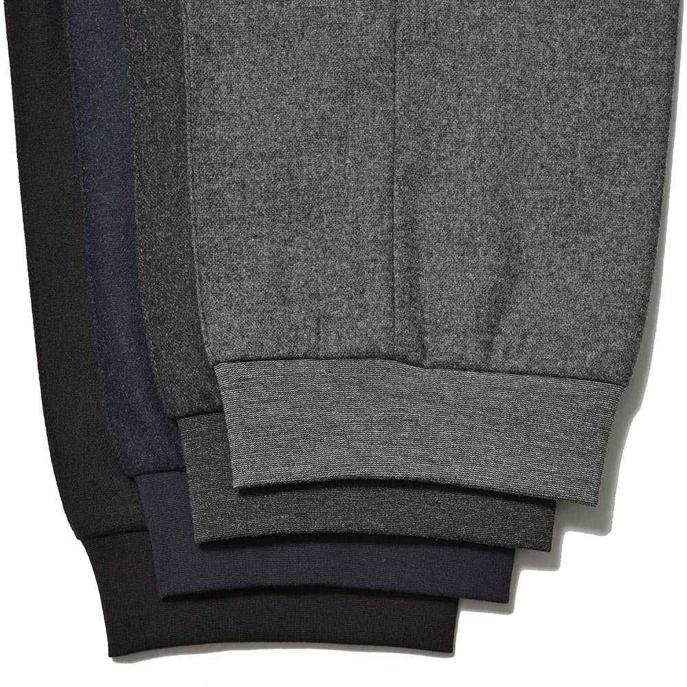 上品な雰囲気を醸し出すライトフランネルに、スポーティーなテイストのリブパンツを合わせることで、冬場でも穿ける一本となっています。